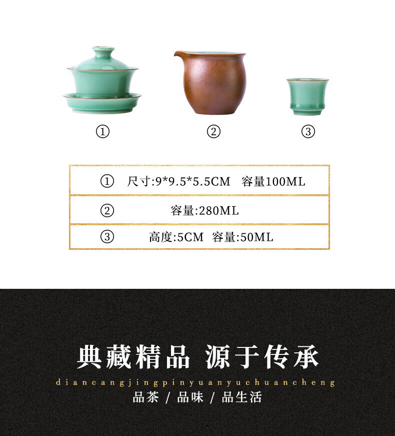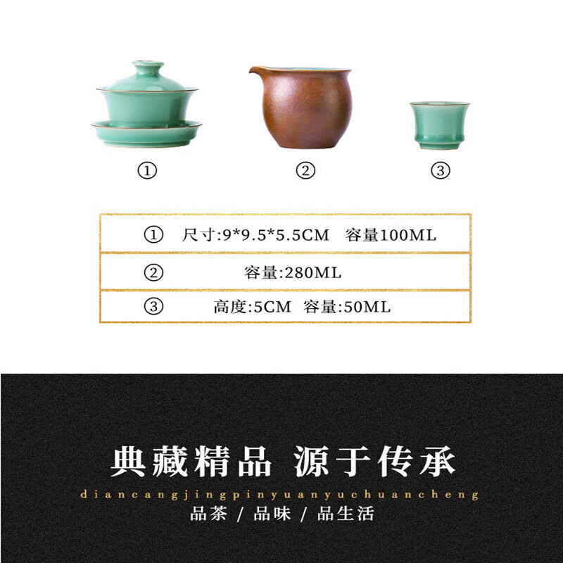 配置:盖碗*1(100ml) 公道杯*1(280ml) 品茗杯*4(50ml)