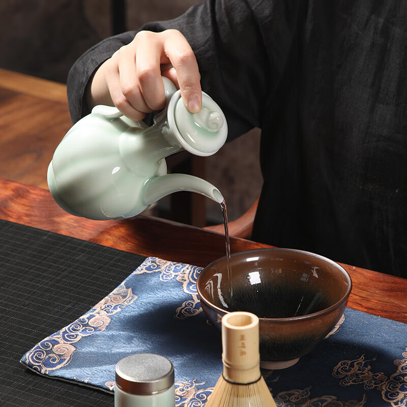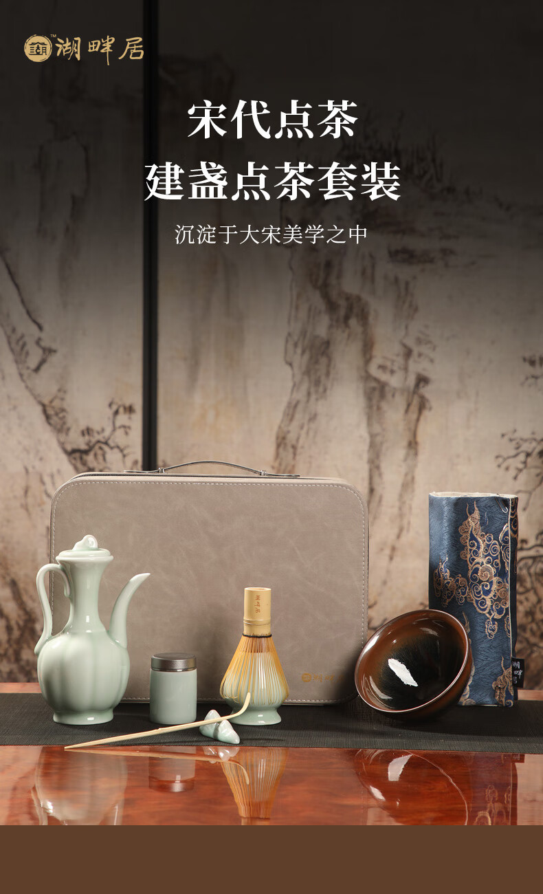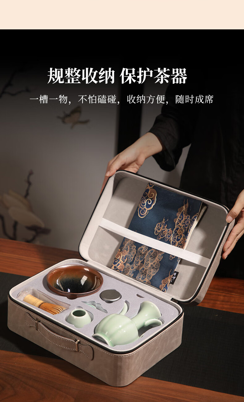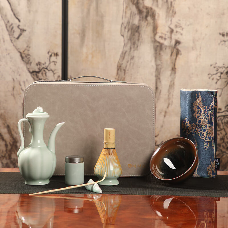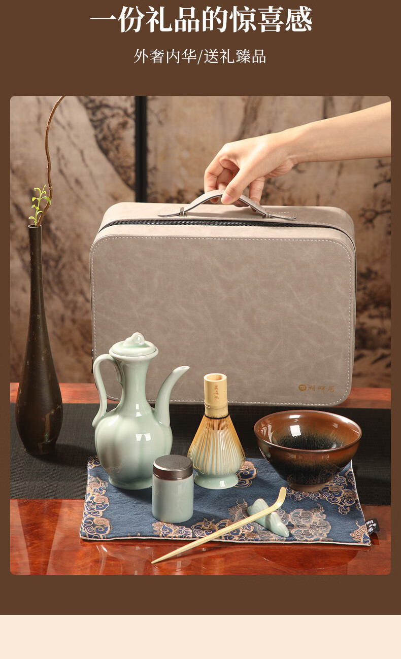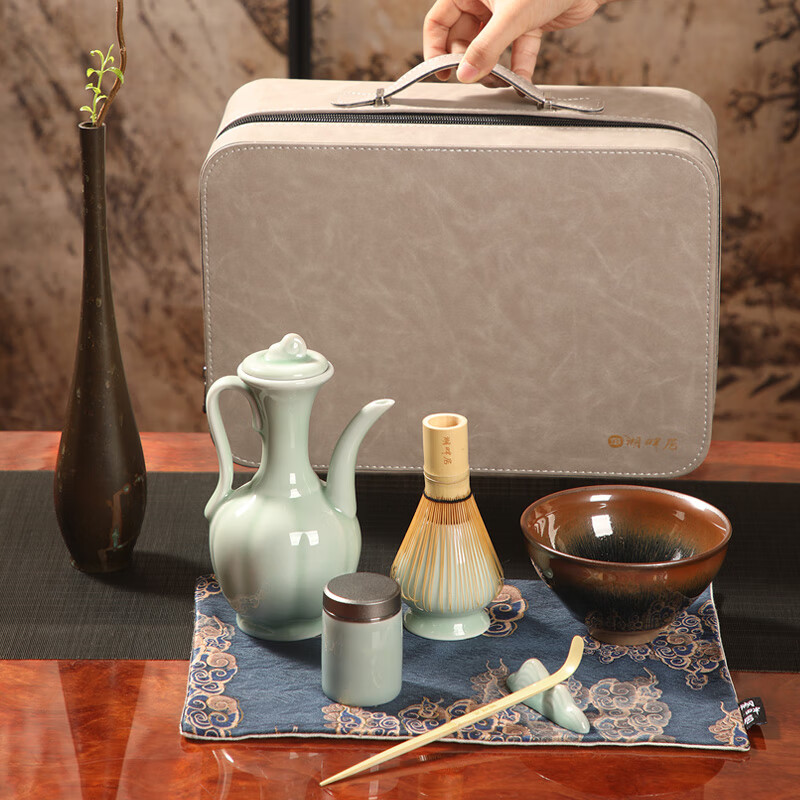 青瓷手执壶,典雅大气;宋代点茶套装,满足了人们的味觉美、感觉美和视觉美;搭配的便携收纳提包,高档质感,一槽一器具,保护茶器