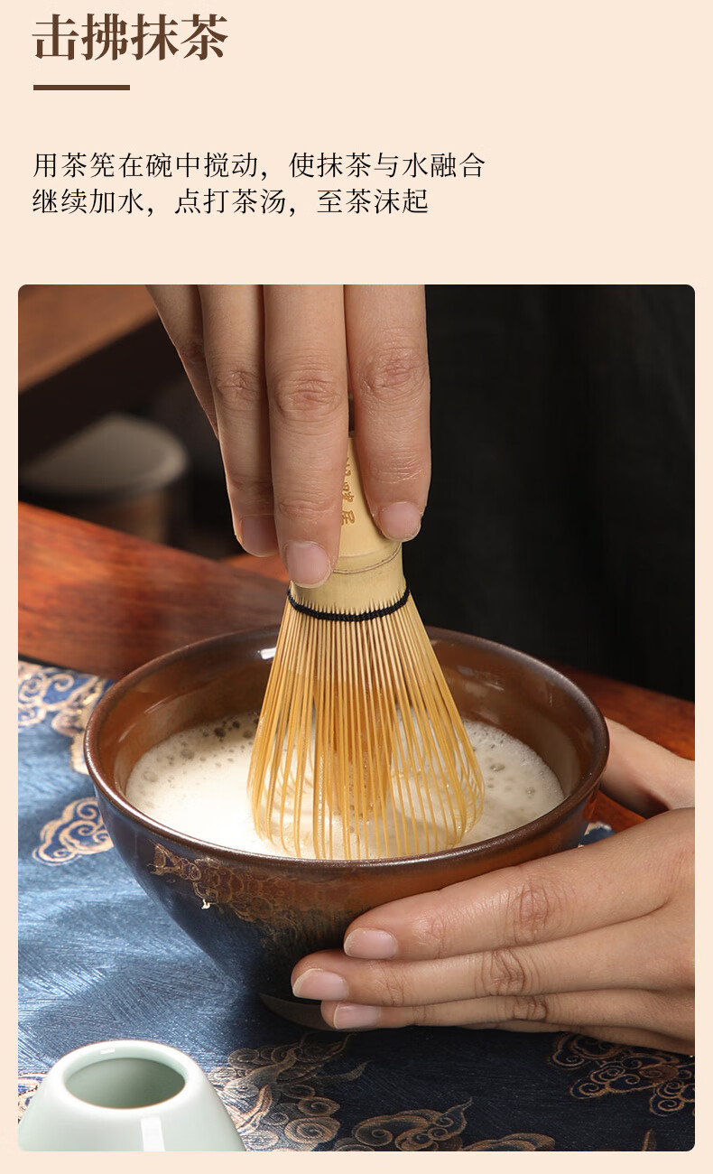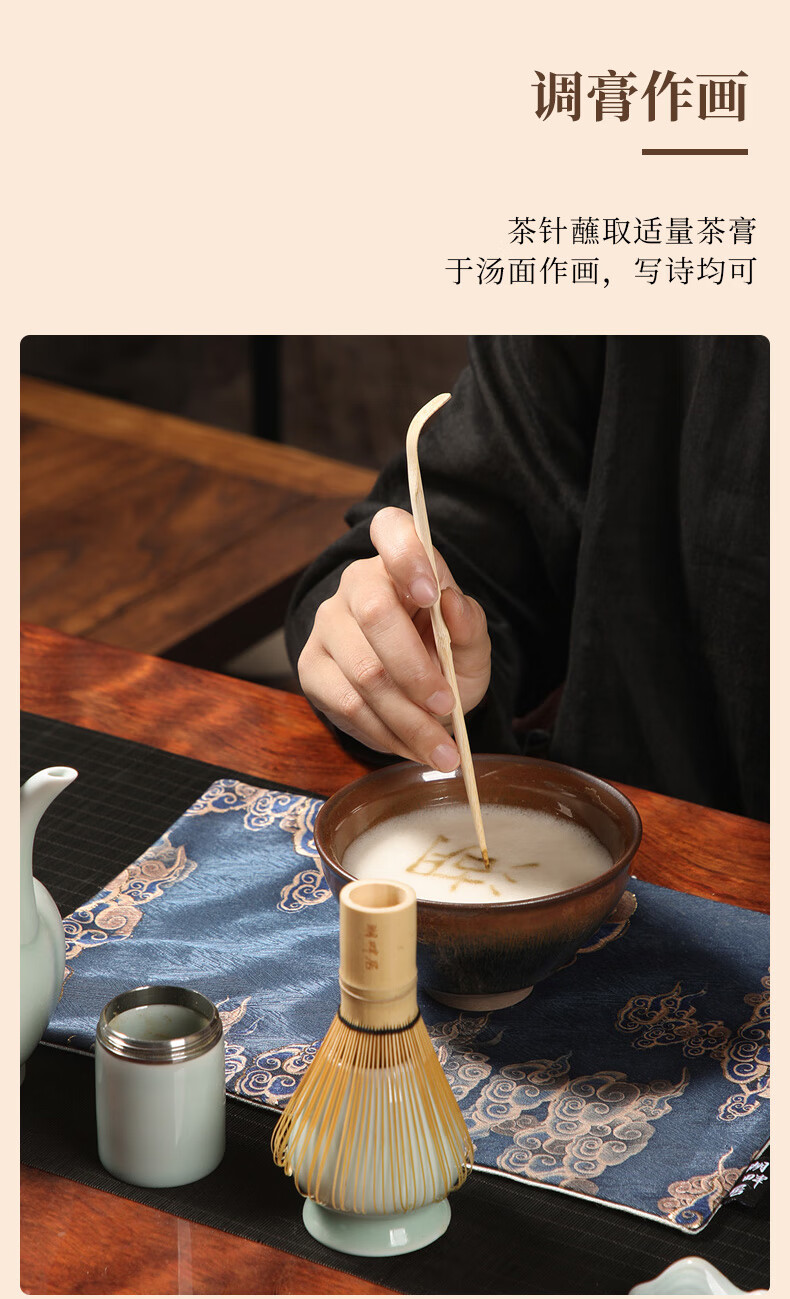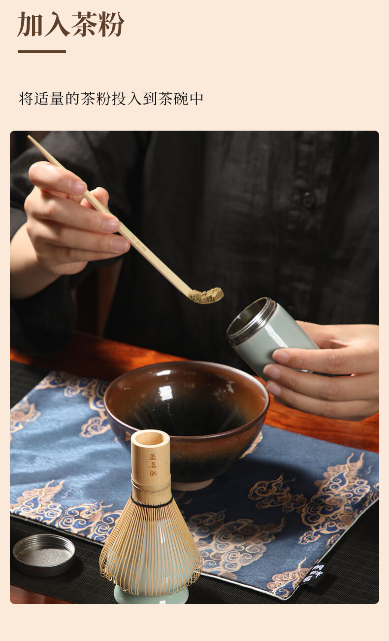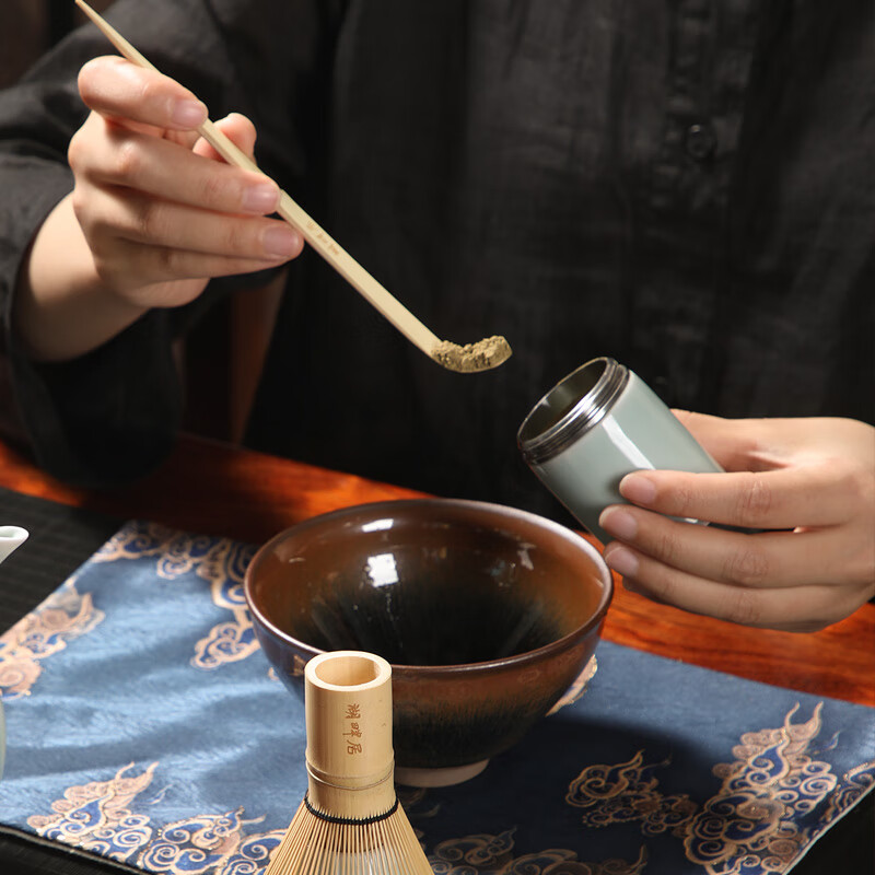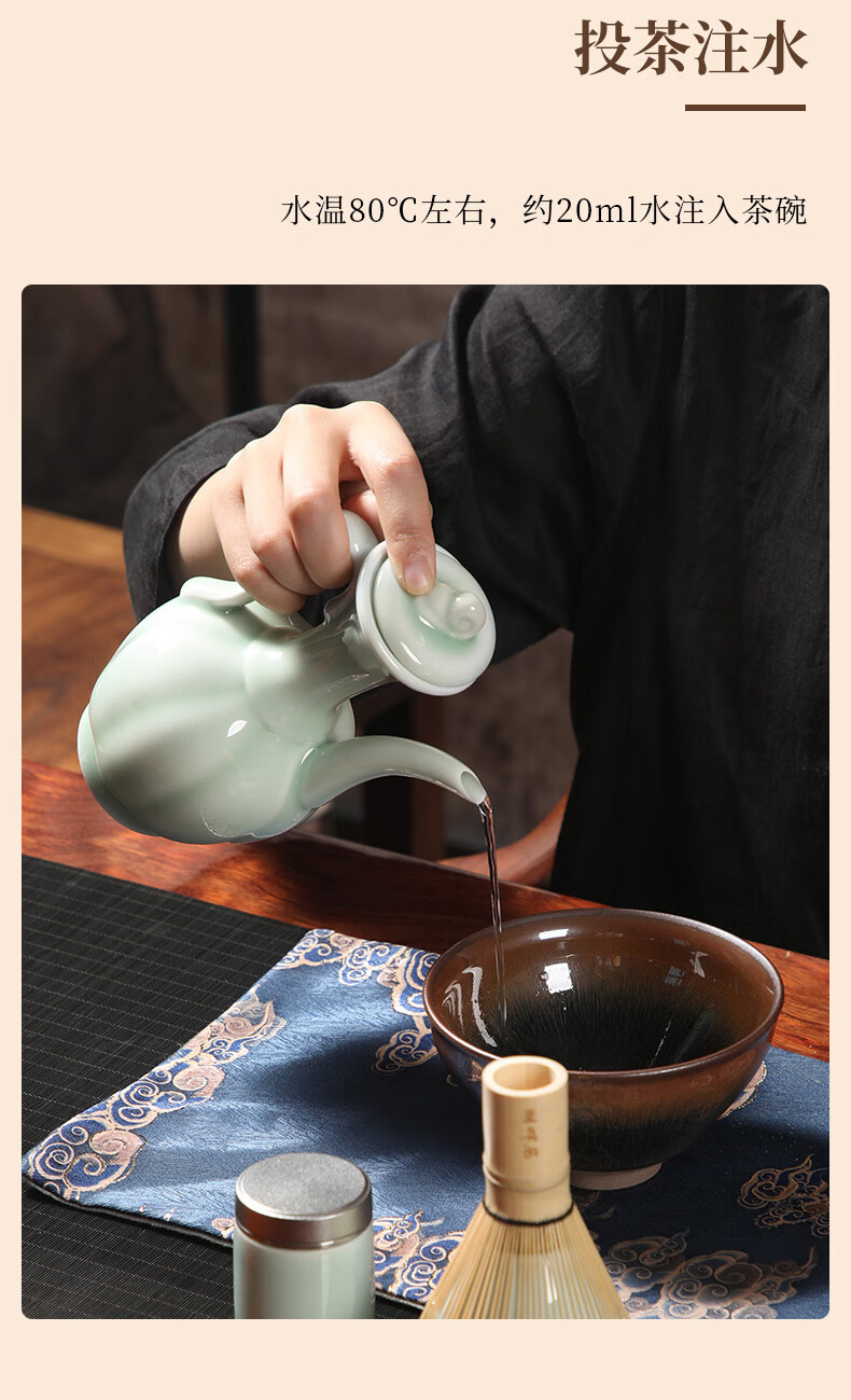 配置:茶壶 * 1(380ml) 建盏 * 1(350ml) 茶粉罐* 1(70ml) 茶筅立 * 1 茶席* 1 茶筅 * 1 茶匙 * 1 茶匙架 * 1