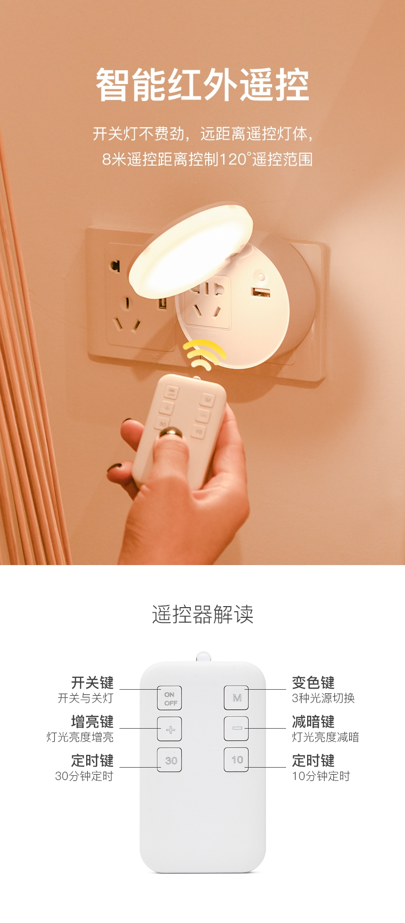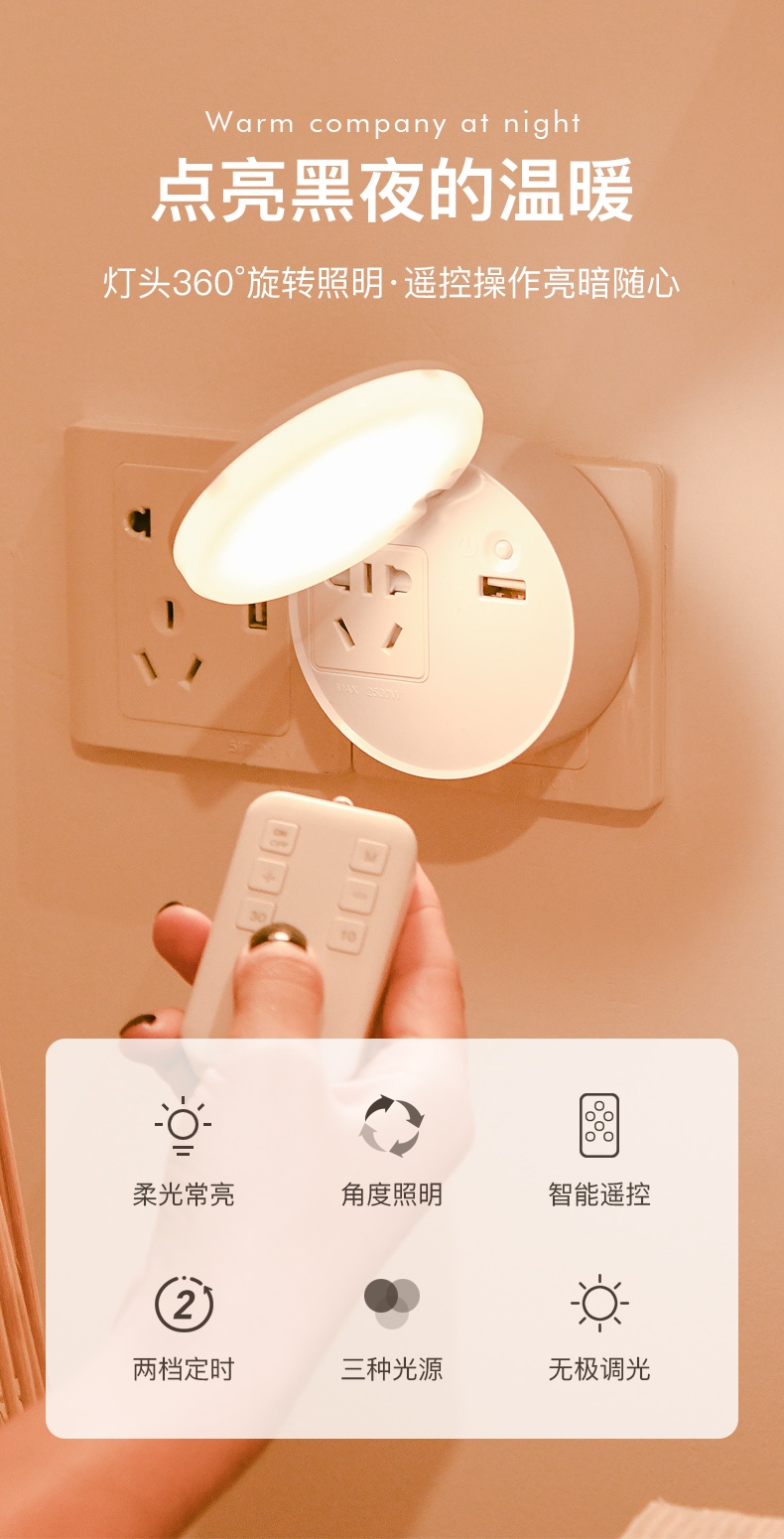 柔光常亮 角度照明 ;智能遥控 两档定时;三种光源 无极调光