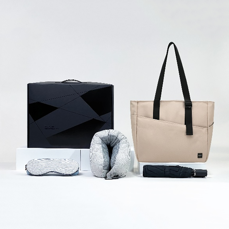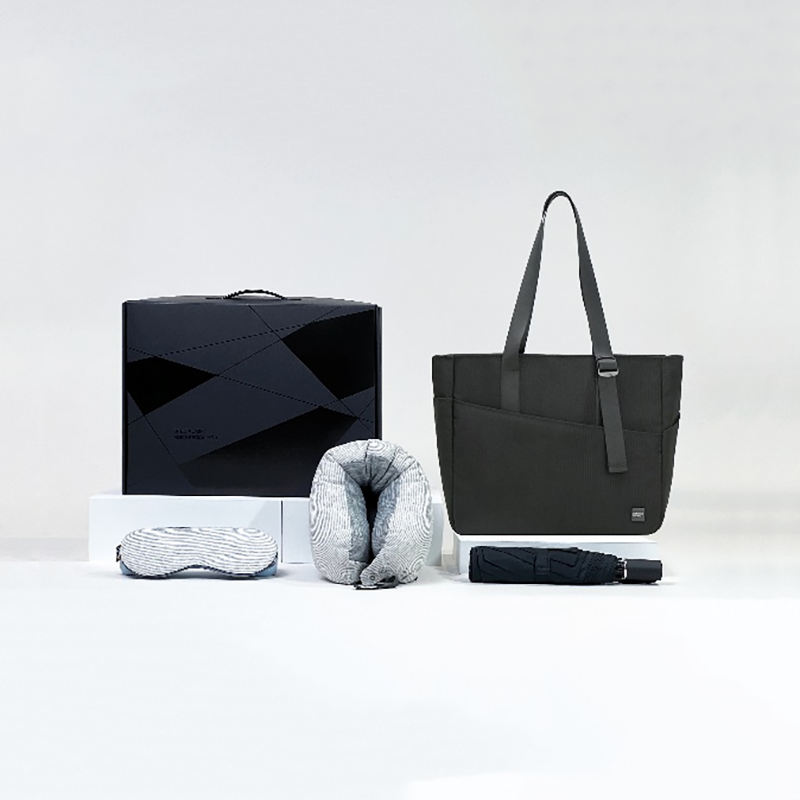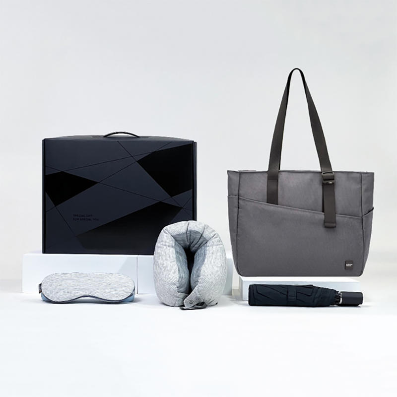 颜色:商务托特包(睿卡其、摩登灰、高雅黑)、颈枕+眼罩(灰色)、雨伞(黑色)