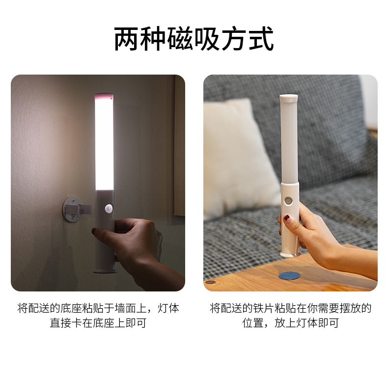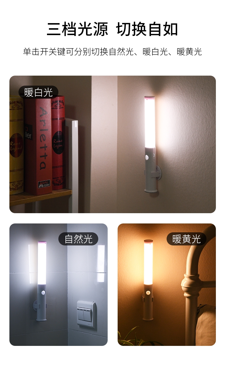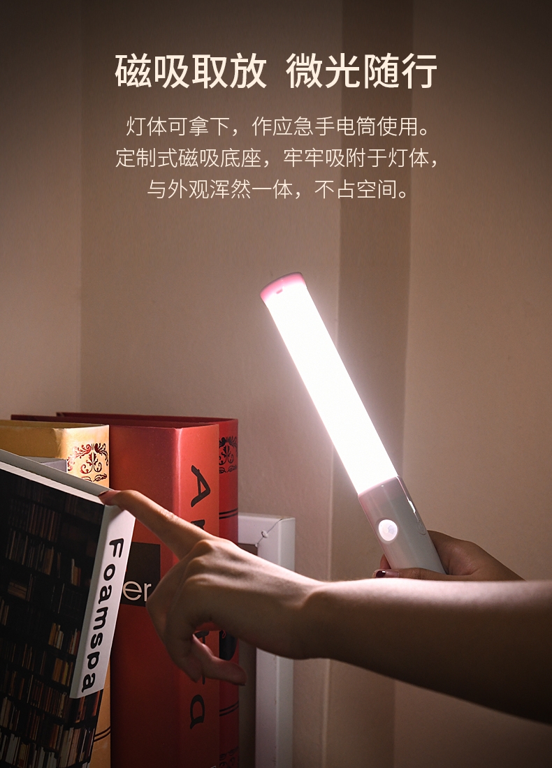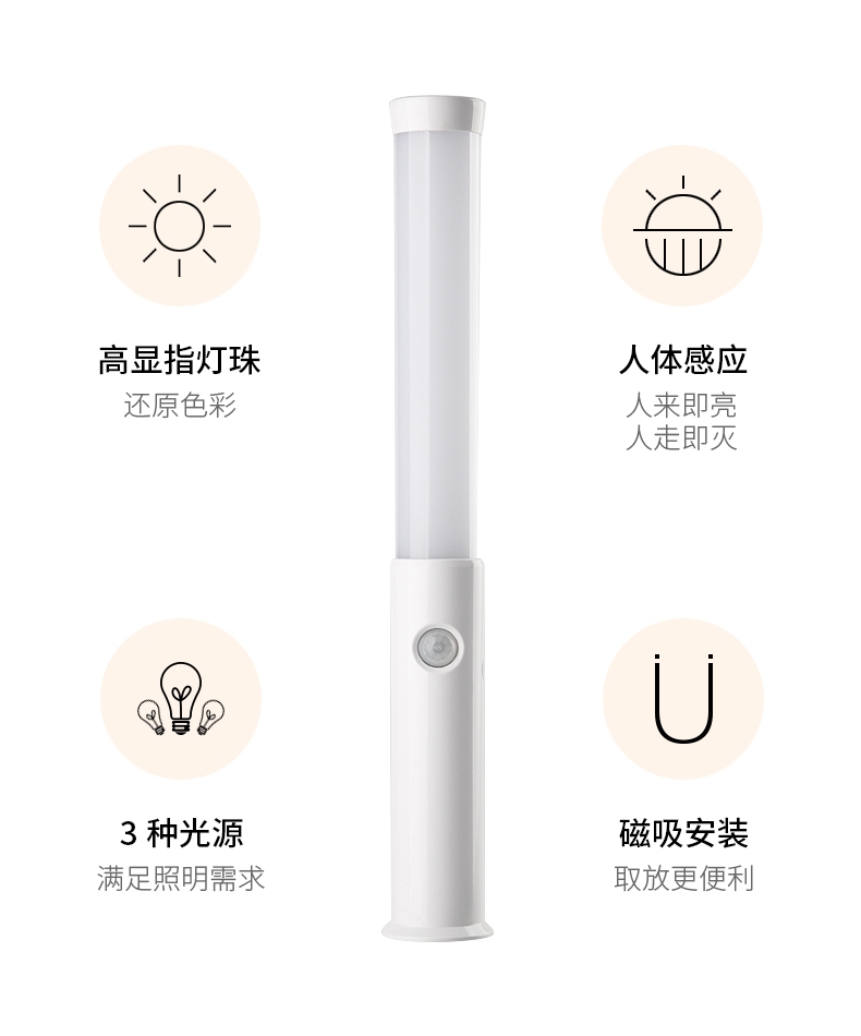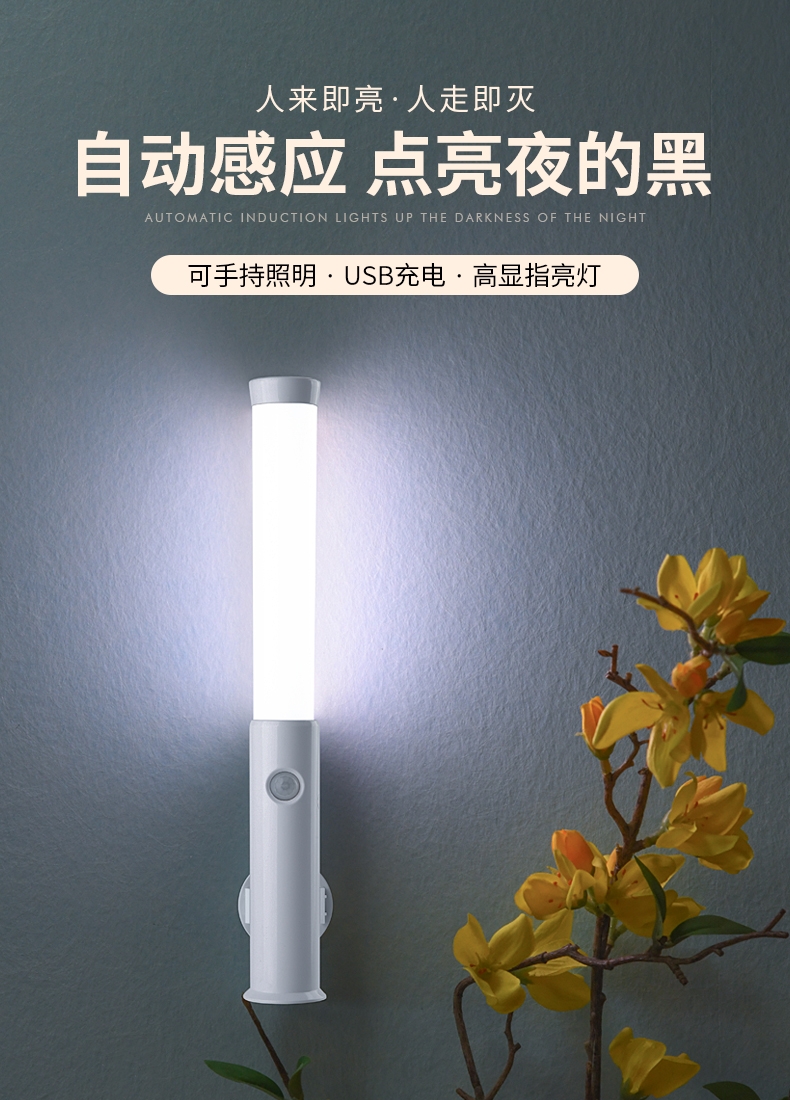 自动感应 点亮夜的黑;可手持照明 USB充电 ;人体感应 3种光源