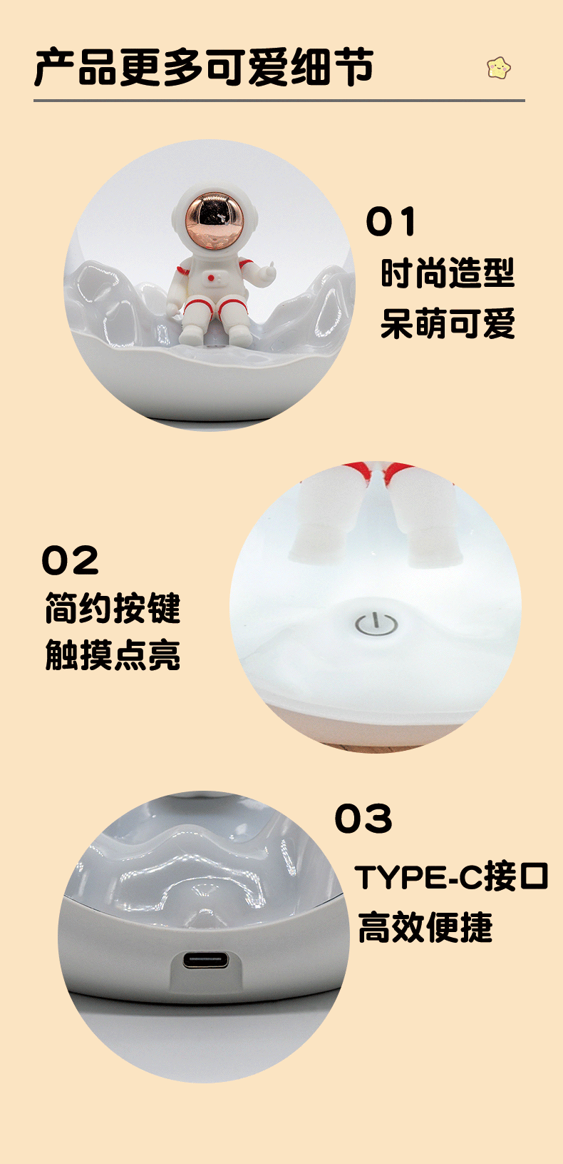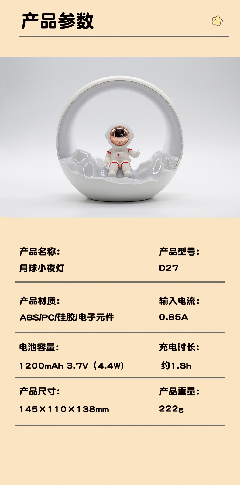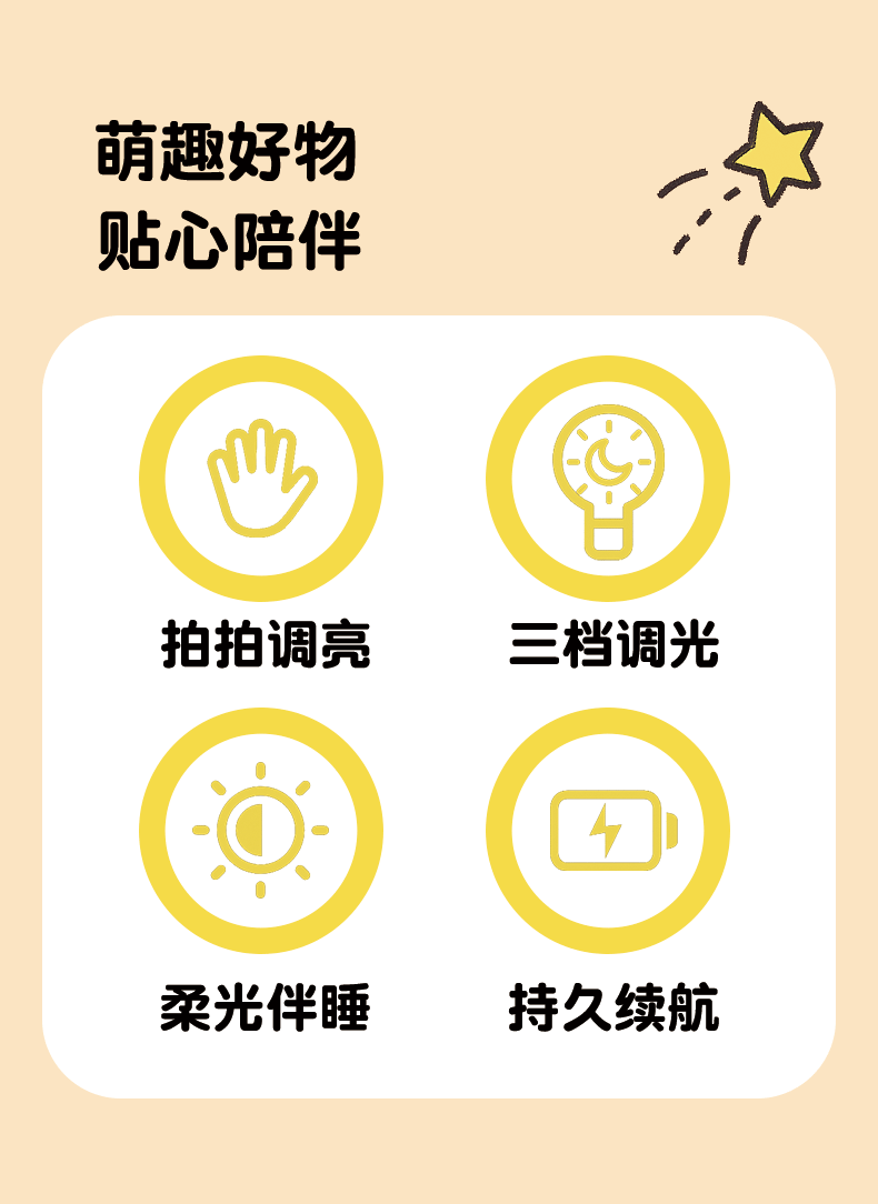 200mAh锂电池、触摸开关;三档调光、拍拍调亮、柔光伴睡;支持小批量定制LOGO