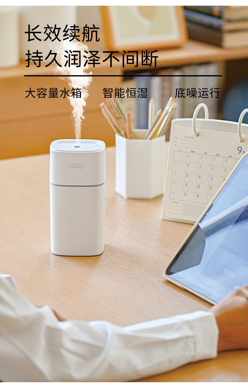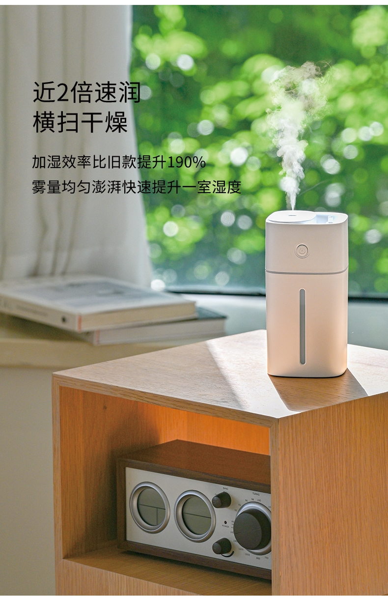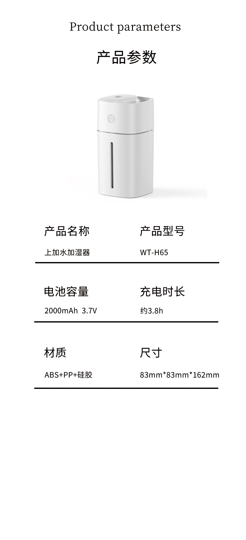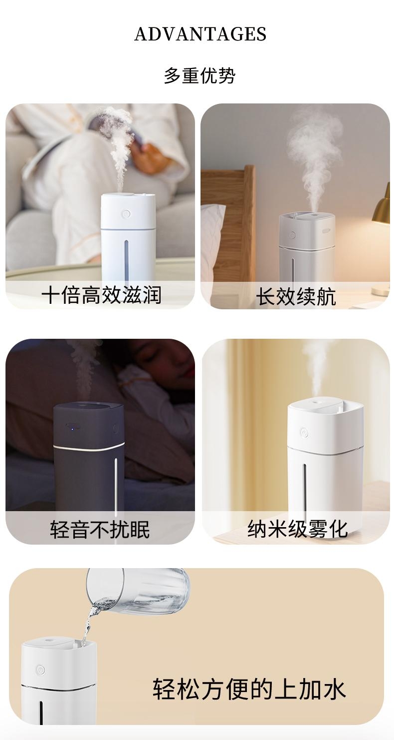 便携上加水设计、间歇14H/持续喷7H;2000毫安电池无线加湿、350ML容量;电池使用时间连续喷雾5.2h, 间歇喷雾10.4h