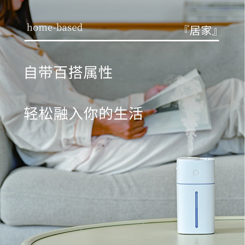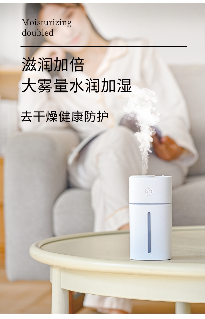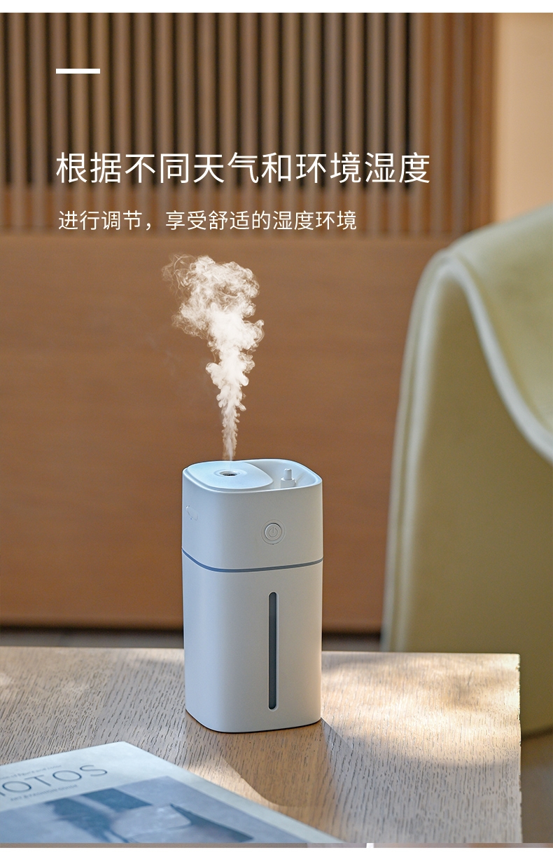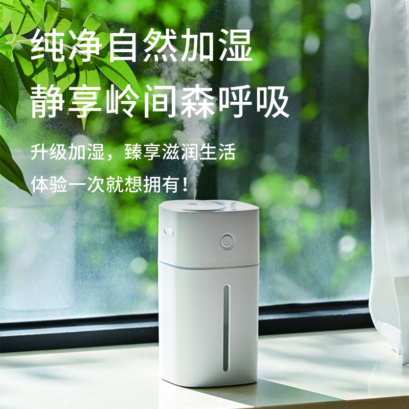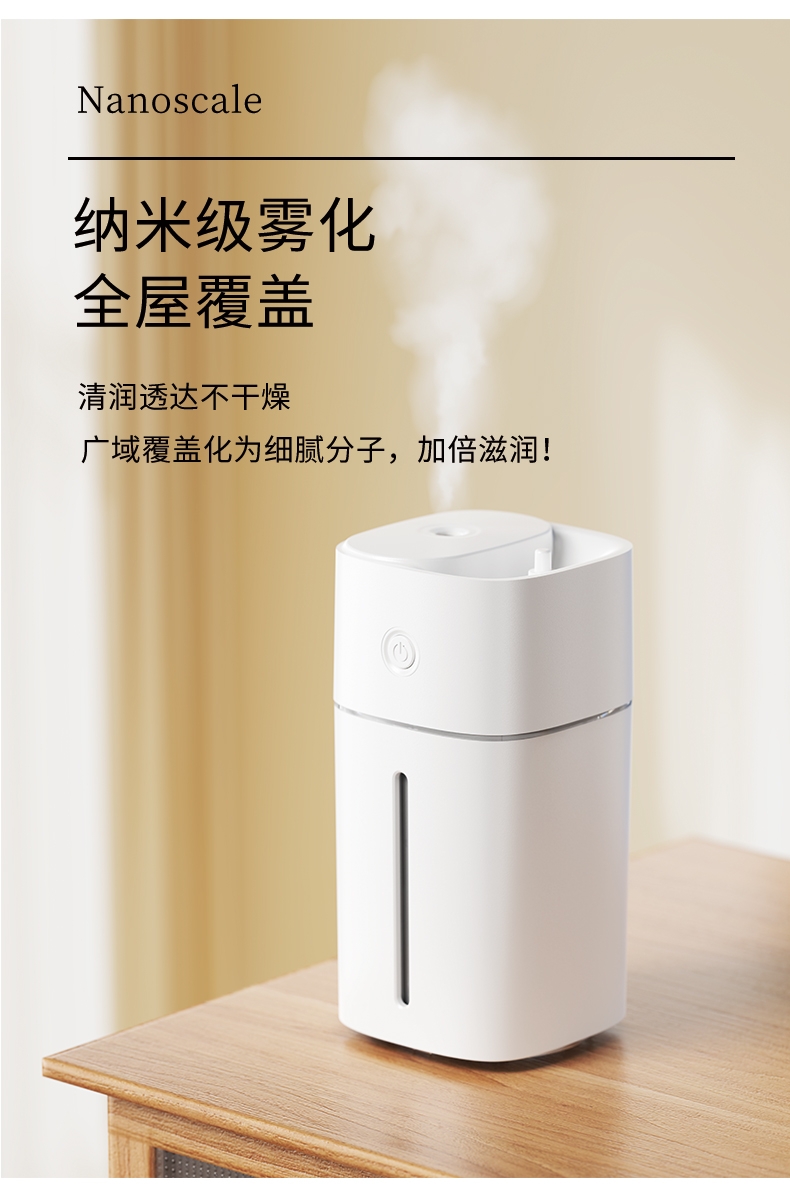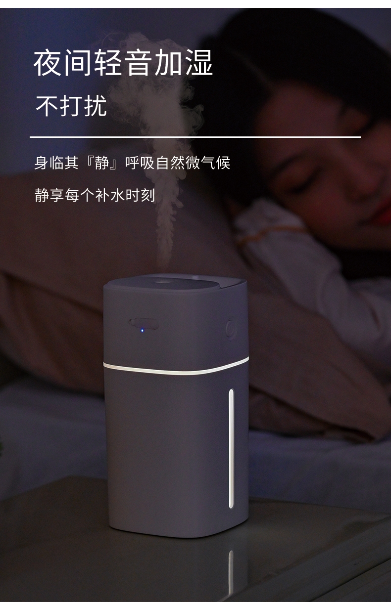 便携上加水设计、间歇14H/持续喷7H;2000毫安电池无线加湿、350ML容量;电池使用时间连续喷雾5.2h, 间歇喷雾10.4h
