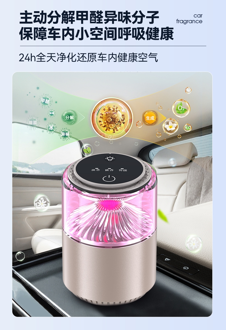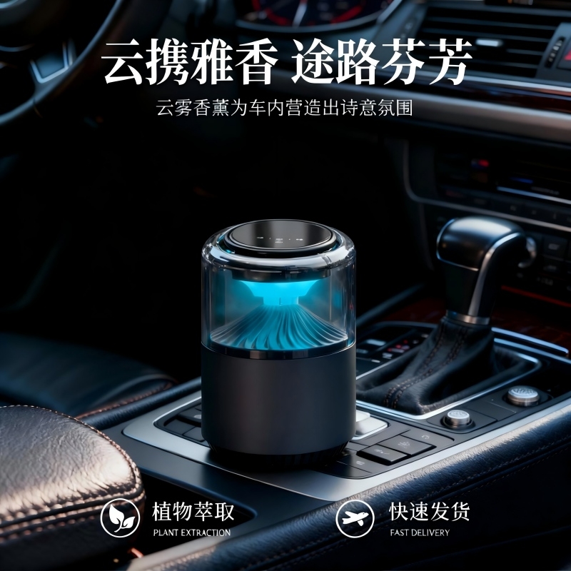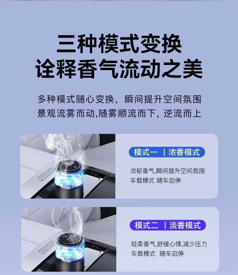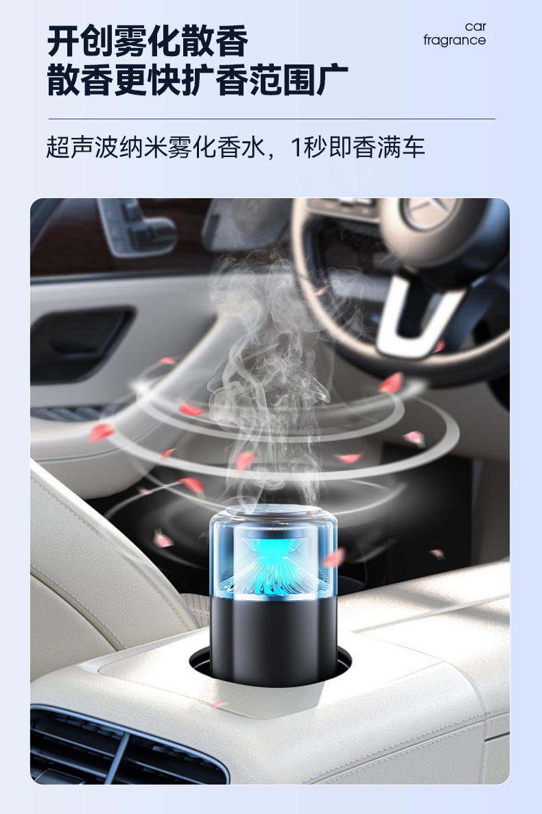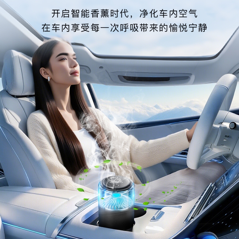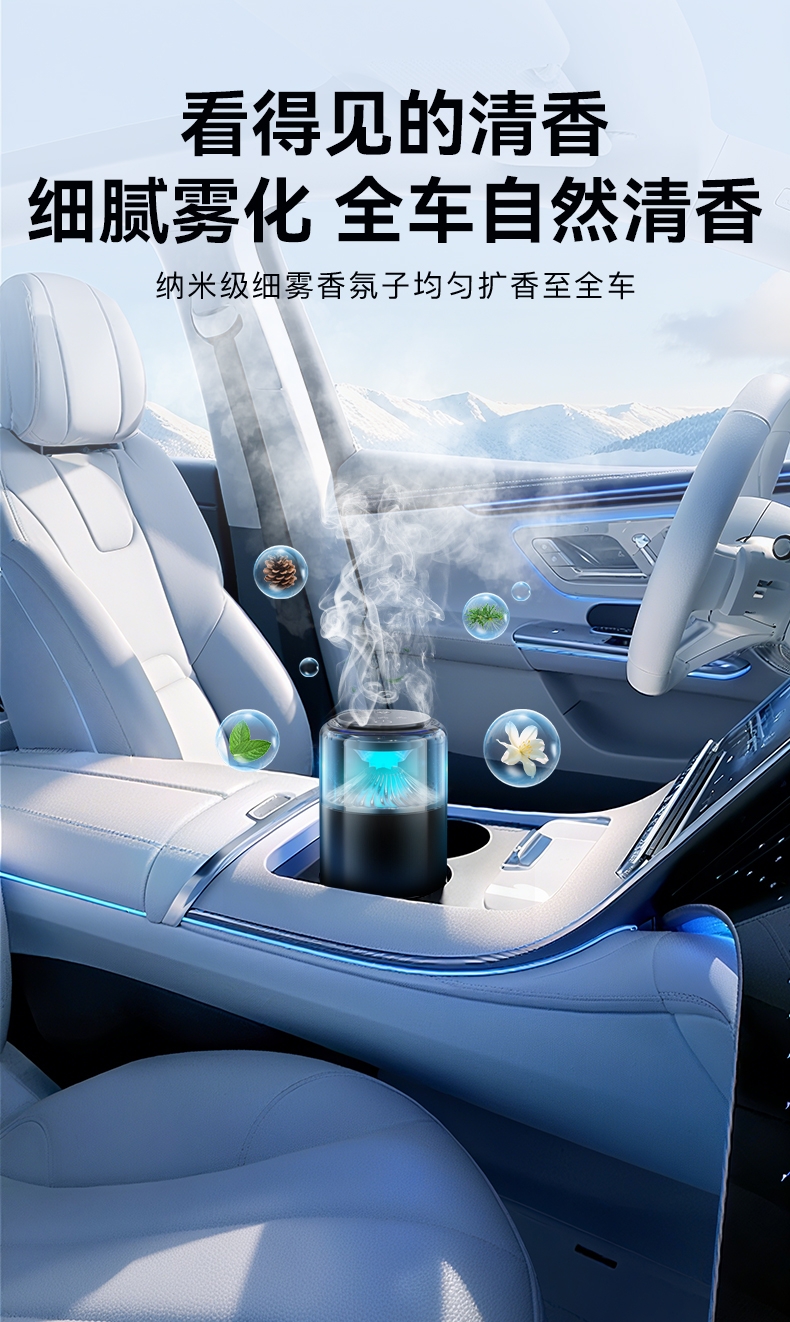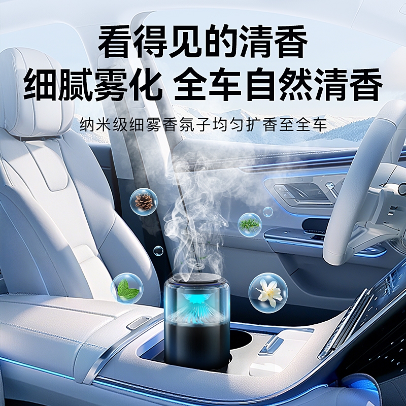 随车启动,三种模式可选,喷雾式散香;配高级精油,可替换,带炫彩氛围灯;800mAh电池,五种香型可选、高级金属色
