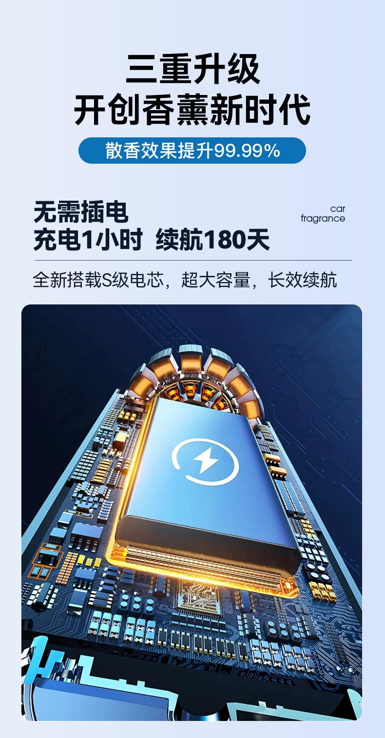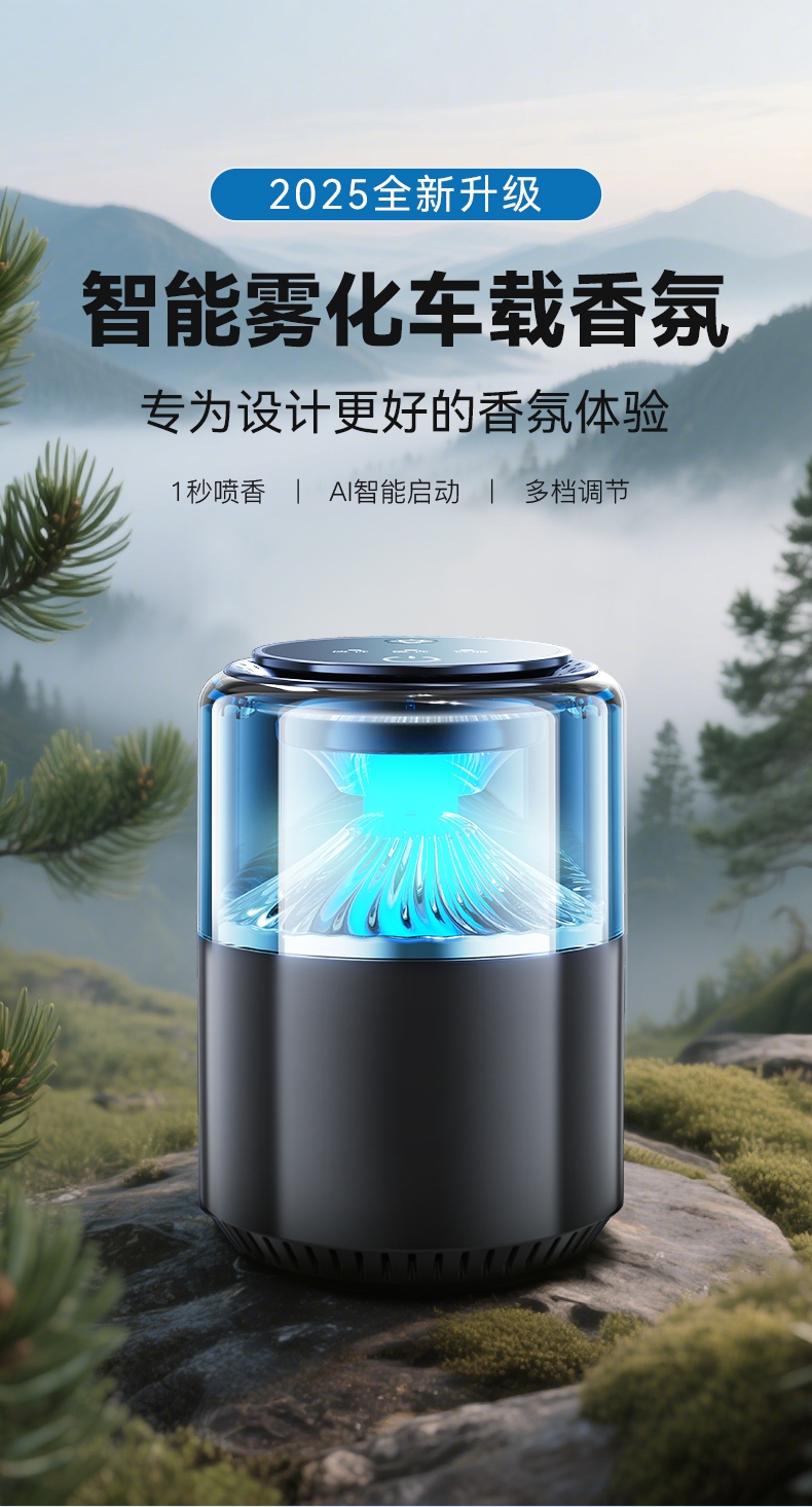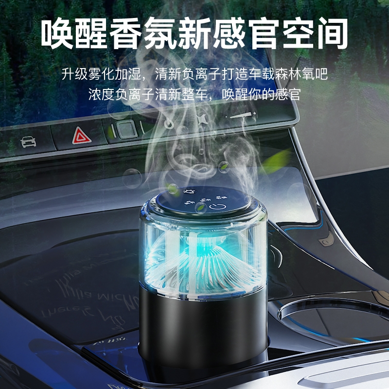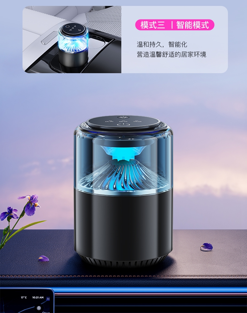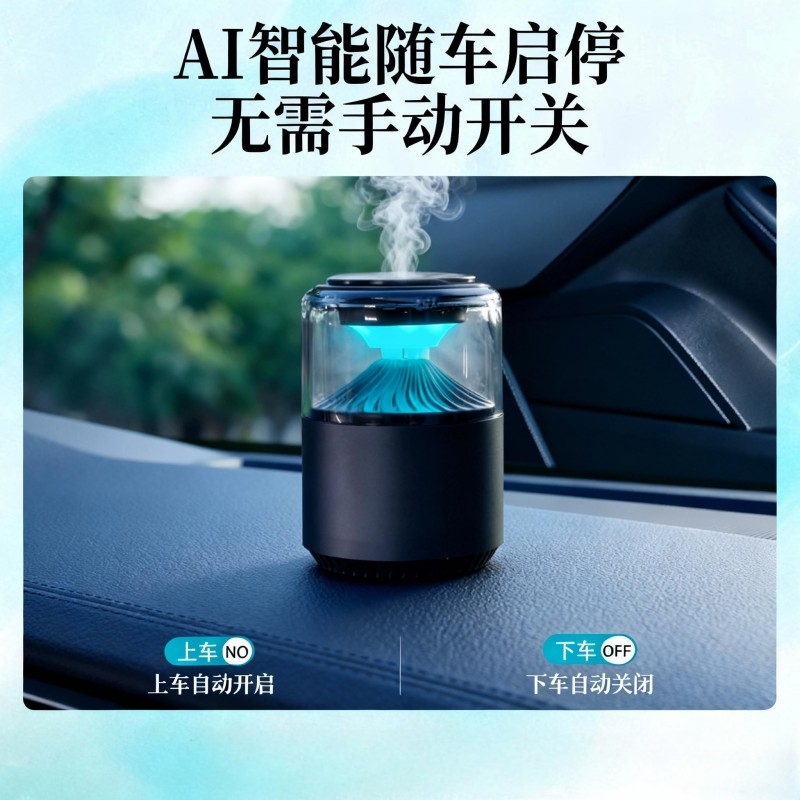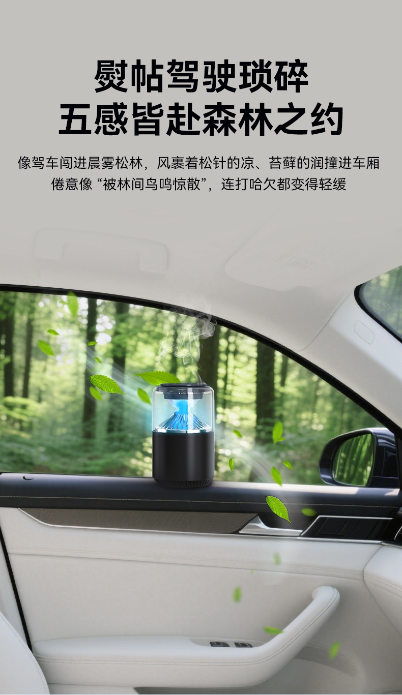 随车启动,三种模式可选,喷雾式散香;配高级精油,可替换,带炫彩氛围灯;800mAh电池,五种香型可选、高级金属色