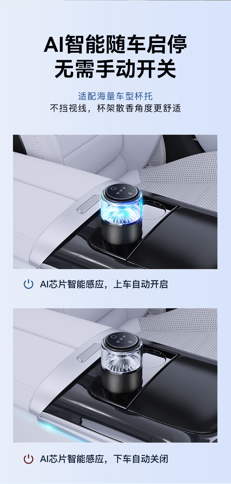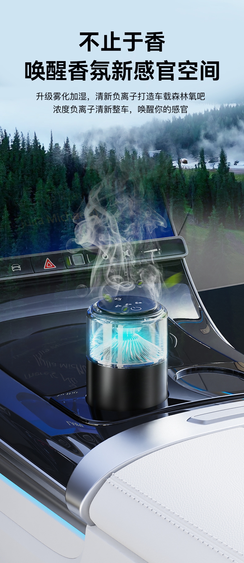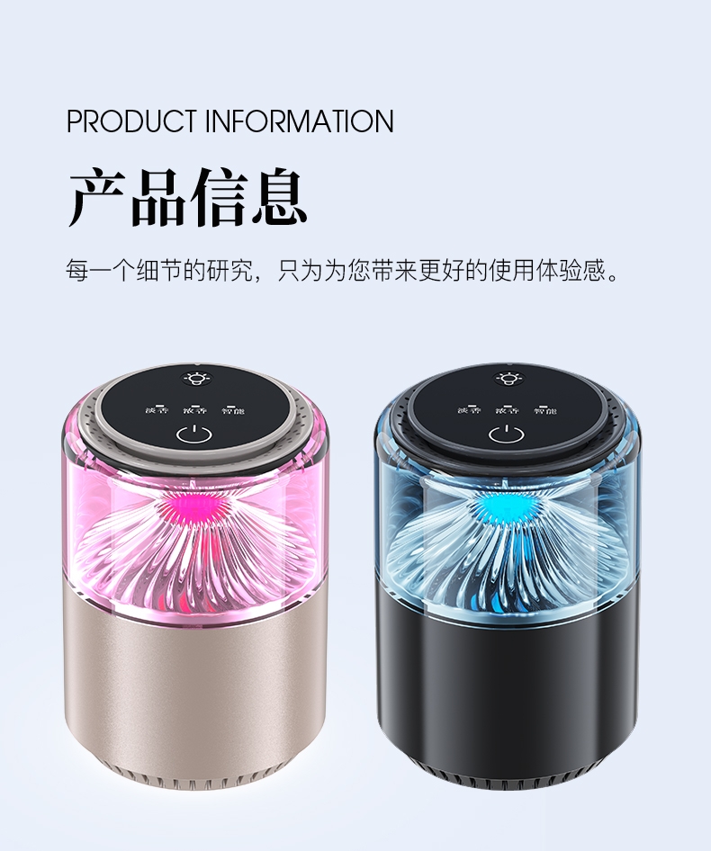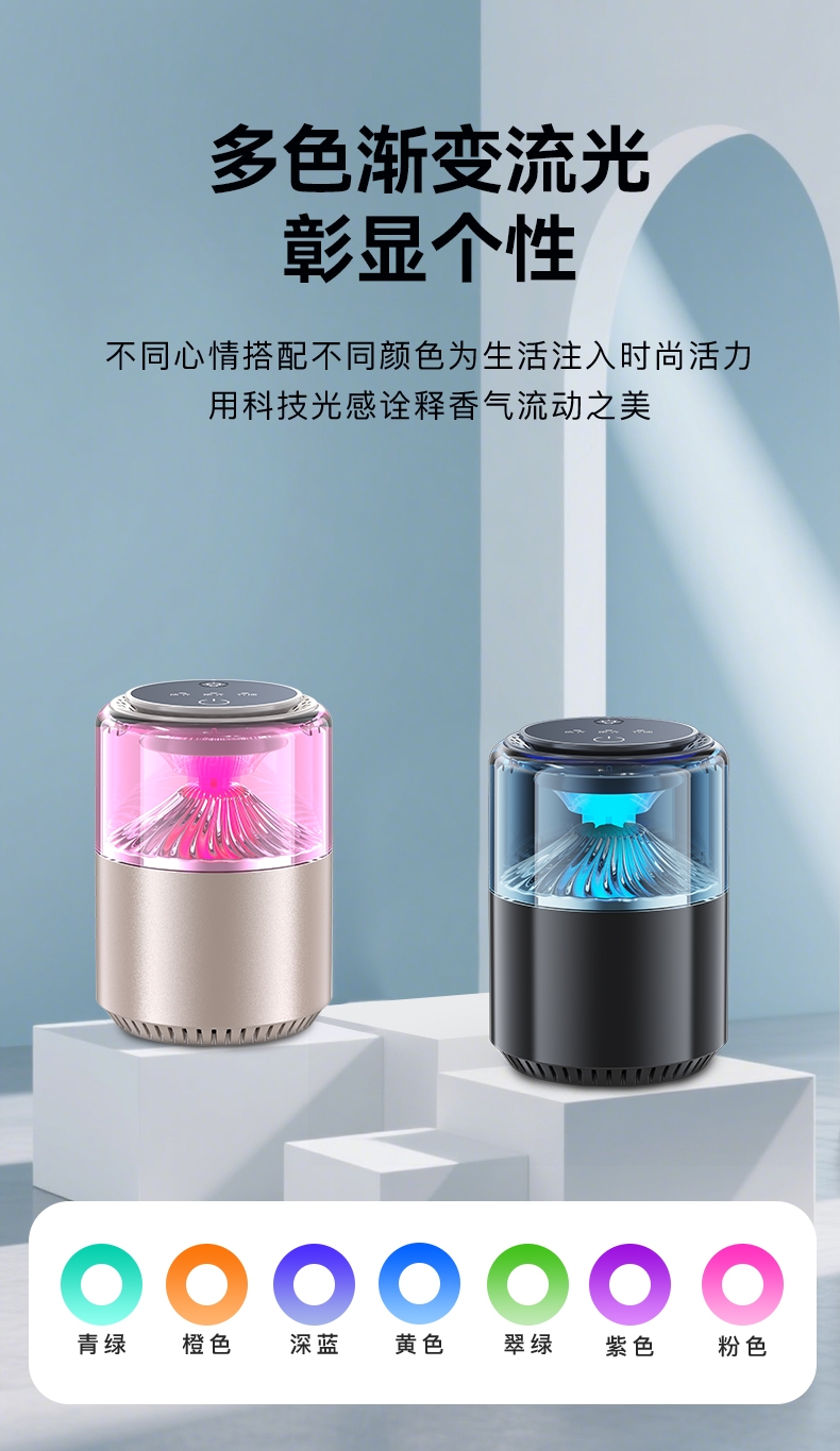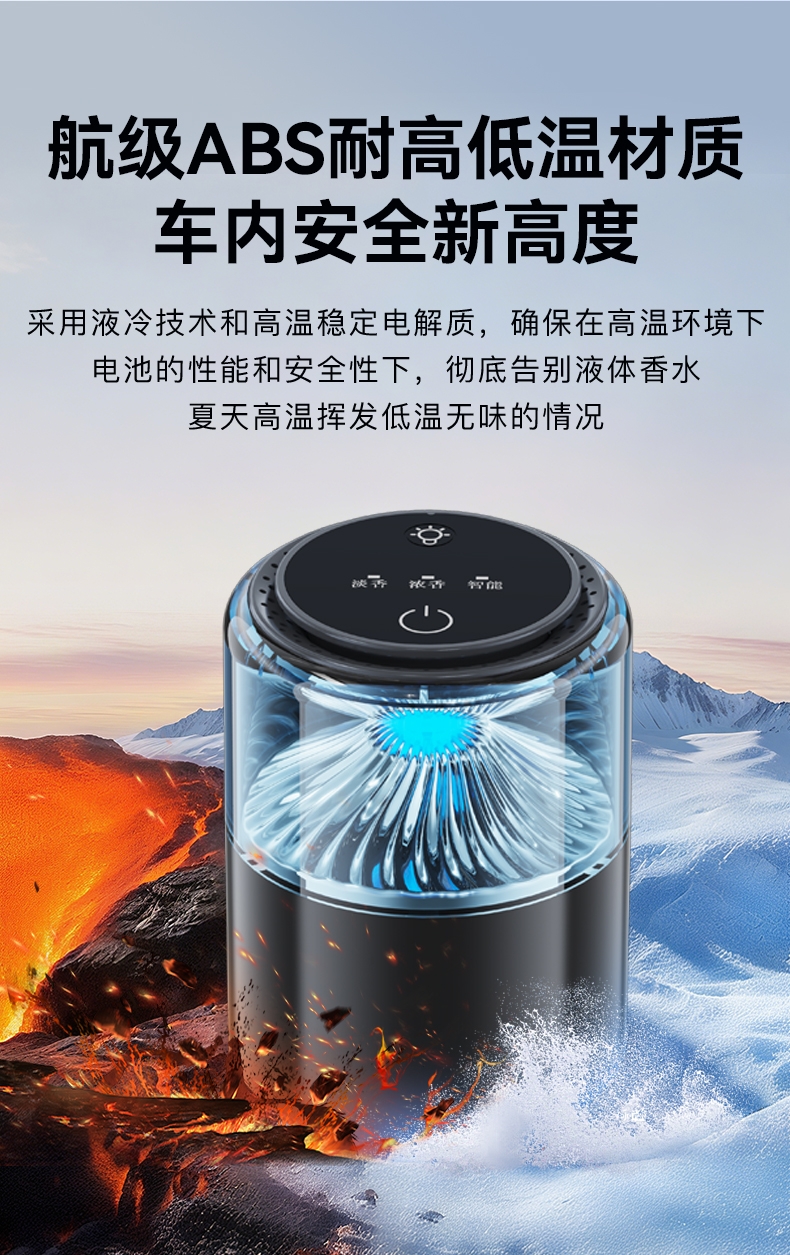 随车启动,三种模式可选,喷雾式散香;配高级精油,可替换,带炫彩氛围灯;800mAh电池,五种香型可选、高级金属色