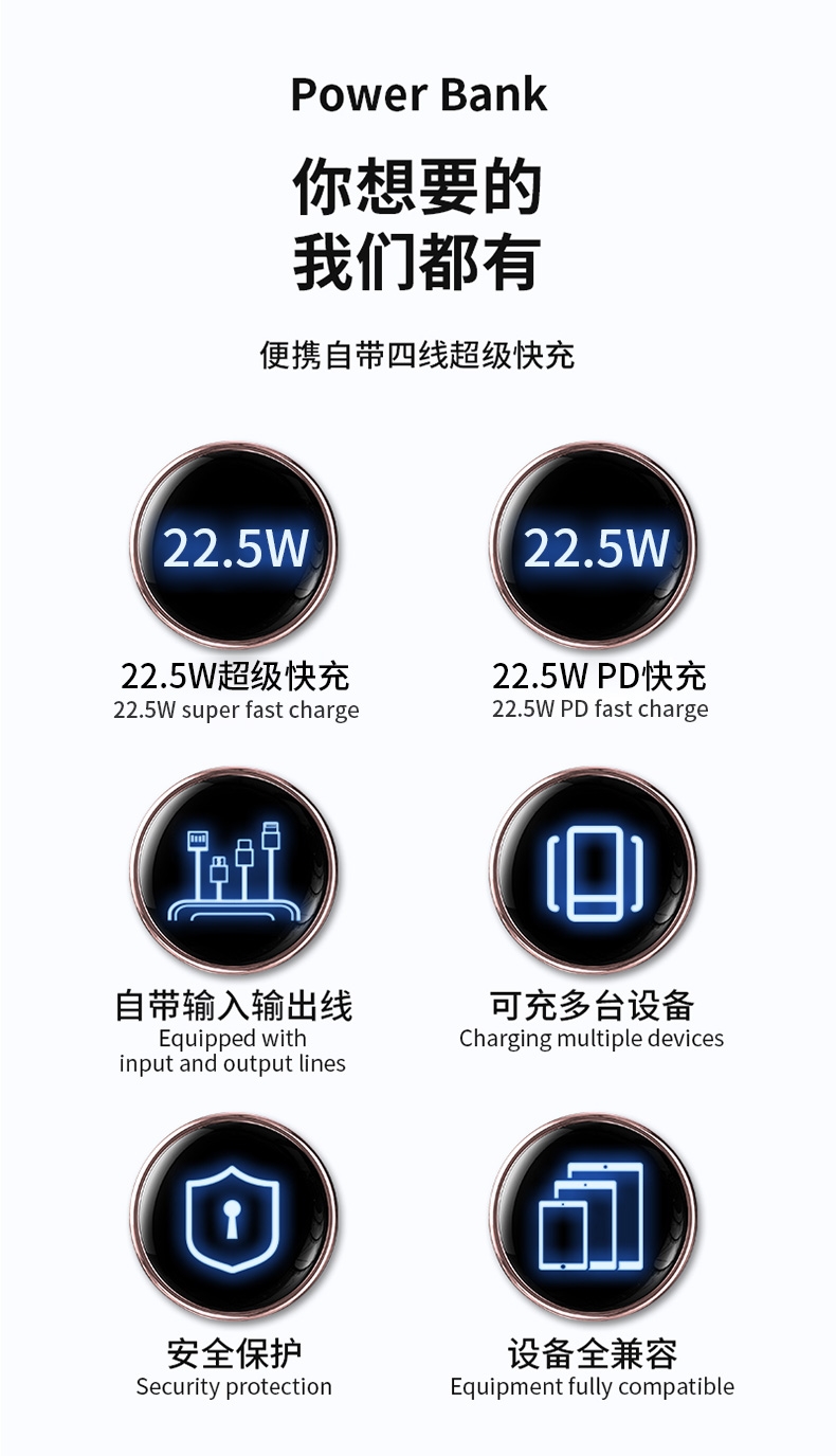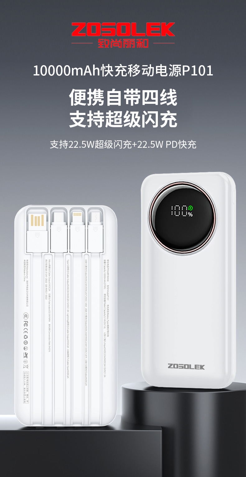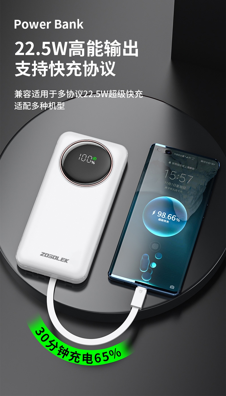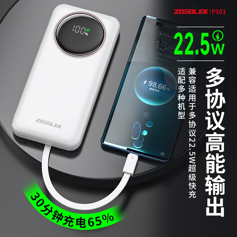 实标10000mAh容量,不玩虚假;自带2种输入方式及6种输出方式,使用方便;支持22.5W超级闪充及PD快充协议,快速充电