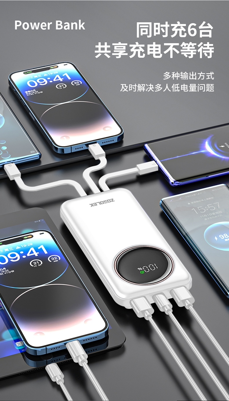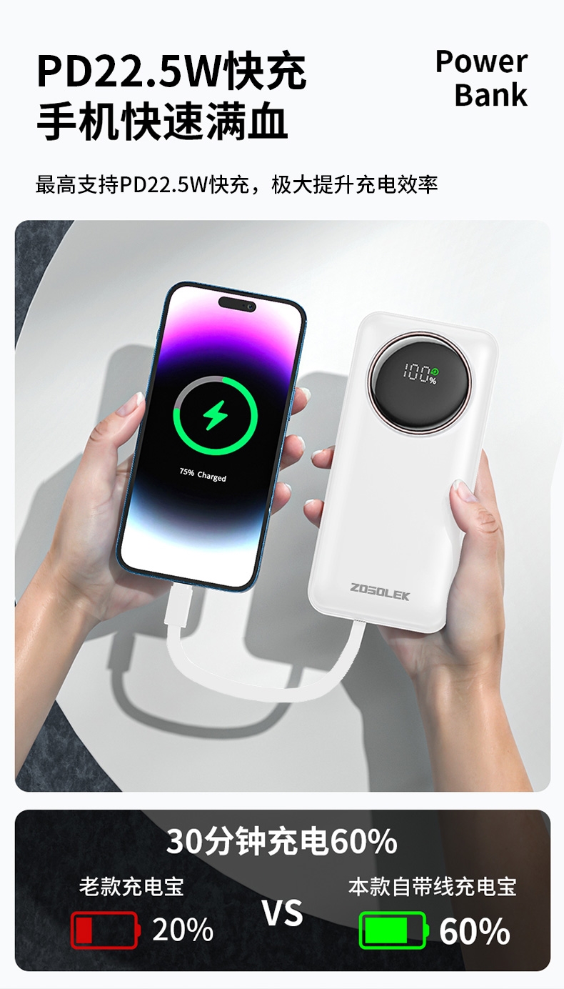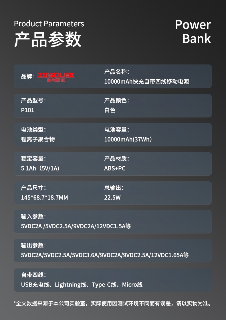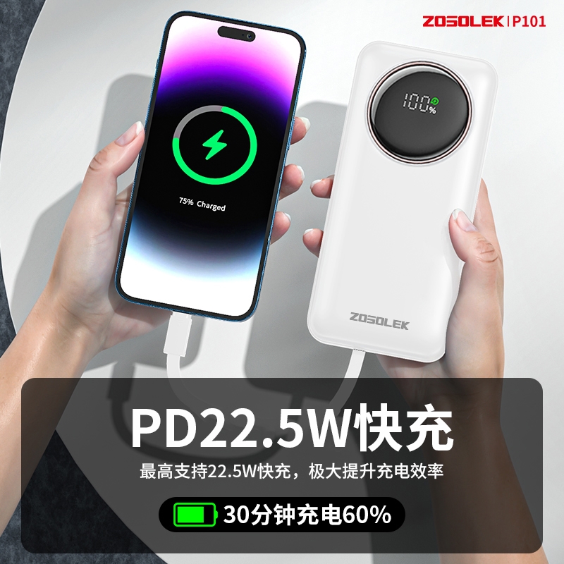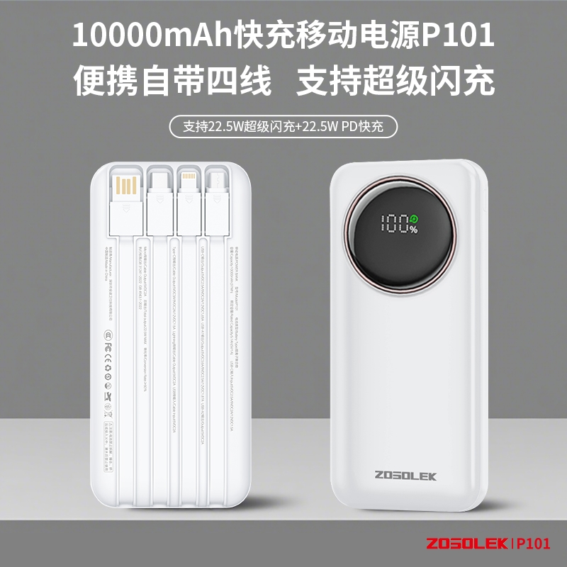 实标10000mAh容量,不玩虚假;自带2种输入方式及6种输出方式,使用方便;支持22.5W超级闪充及PD快充协议,快速充电
