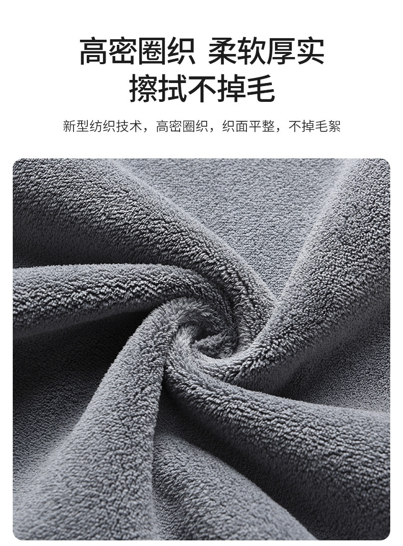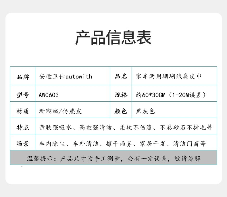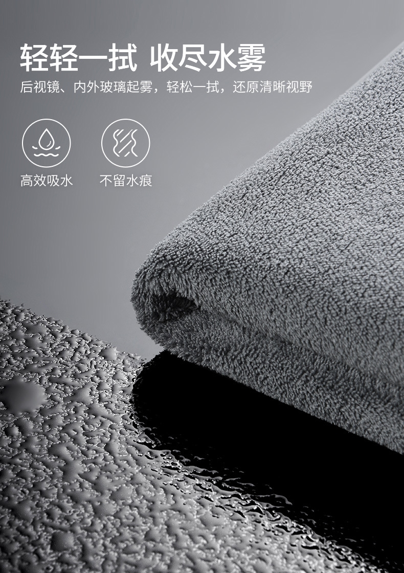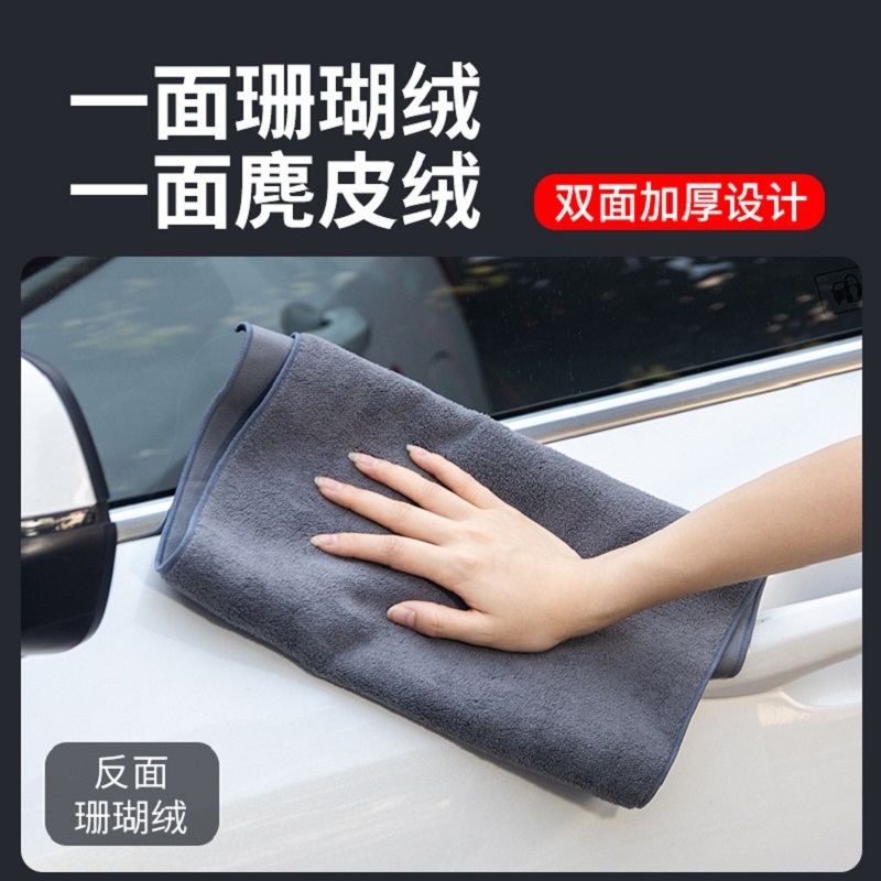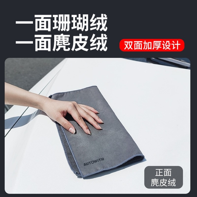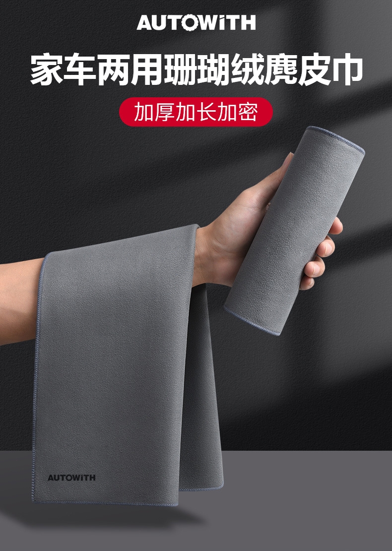 创新采用麂皮绒珊瑚绒双面材质,实现一巾多用;短毛珊瑚绒细腻柔软不留沙粒硬物,防止表面划伤;产品采用灰黑耐脏色系,易清洗,实用性强