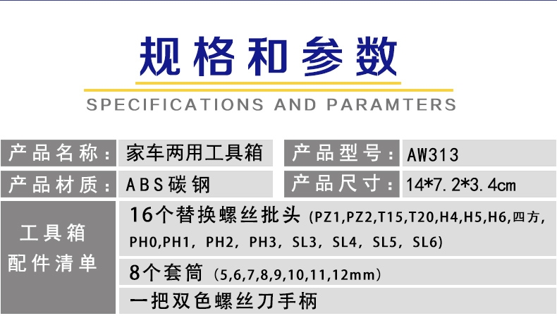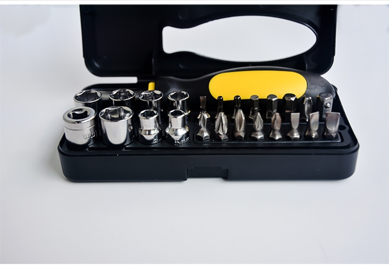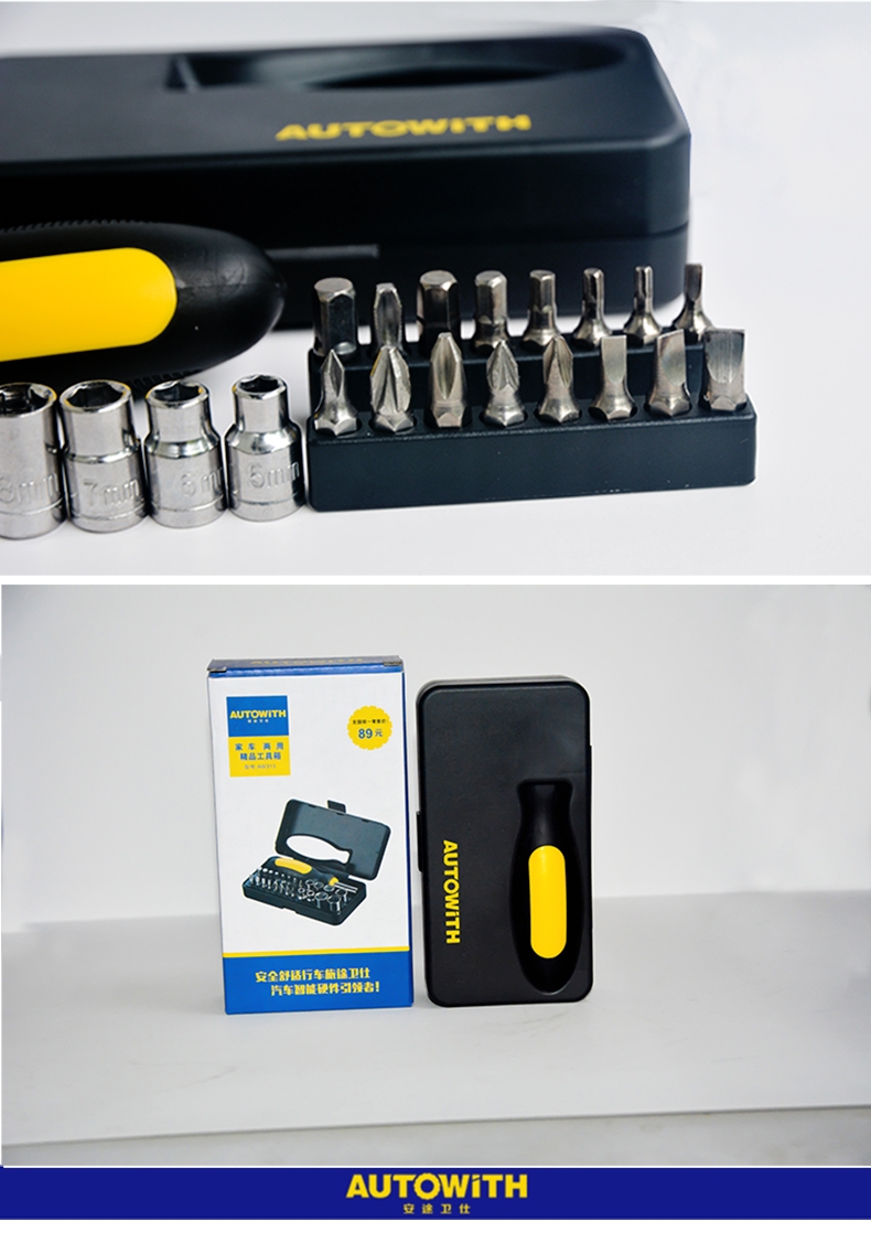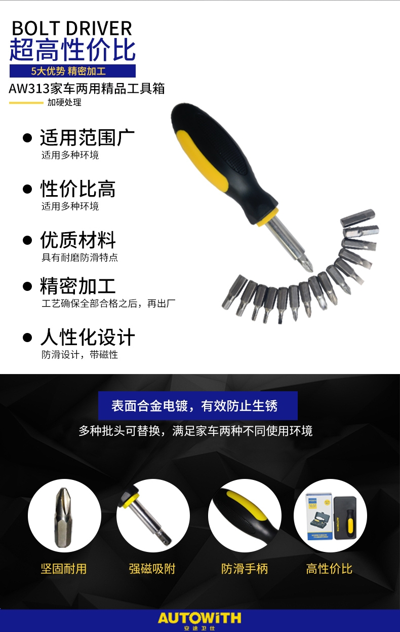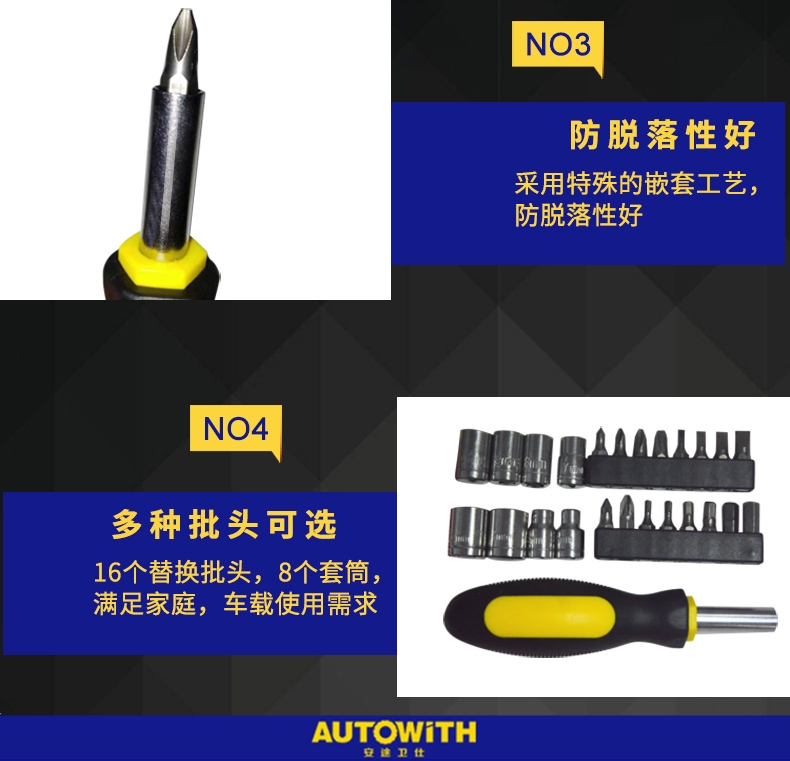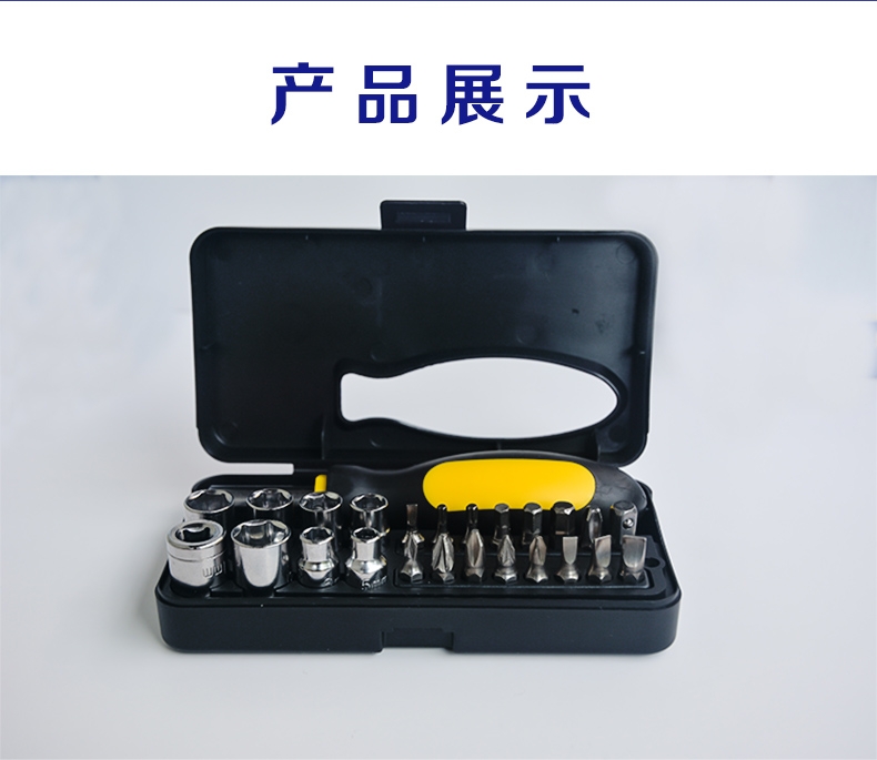 产品组成:16个替换螺丝批头 8个套筒 1把双色螺丝刀手柄