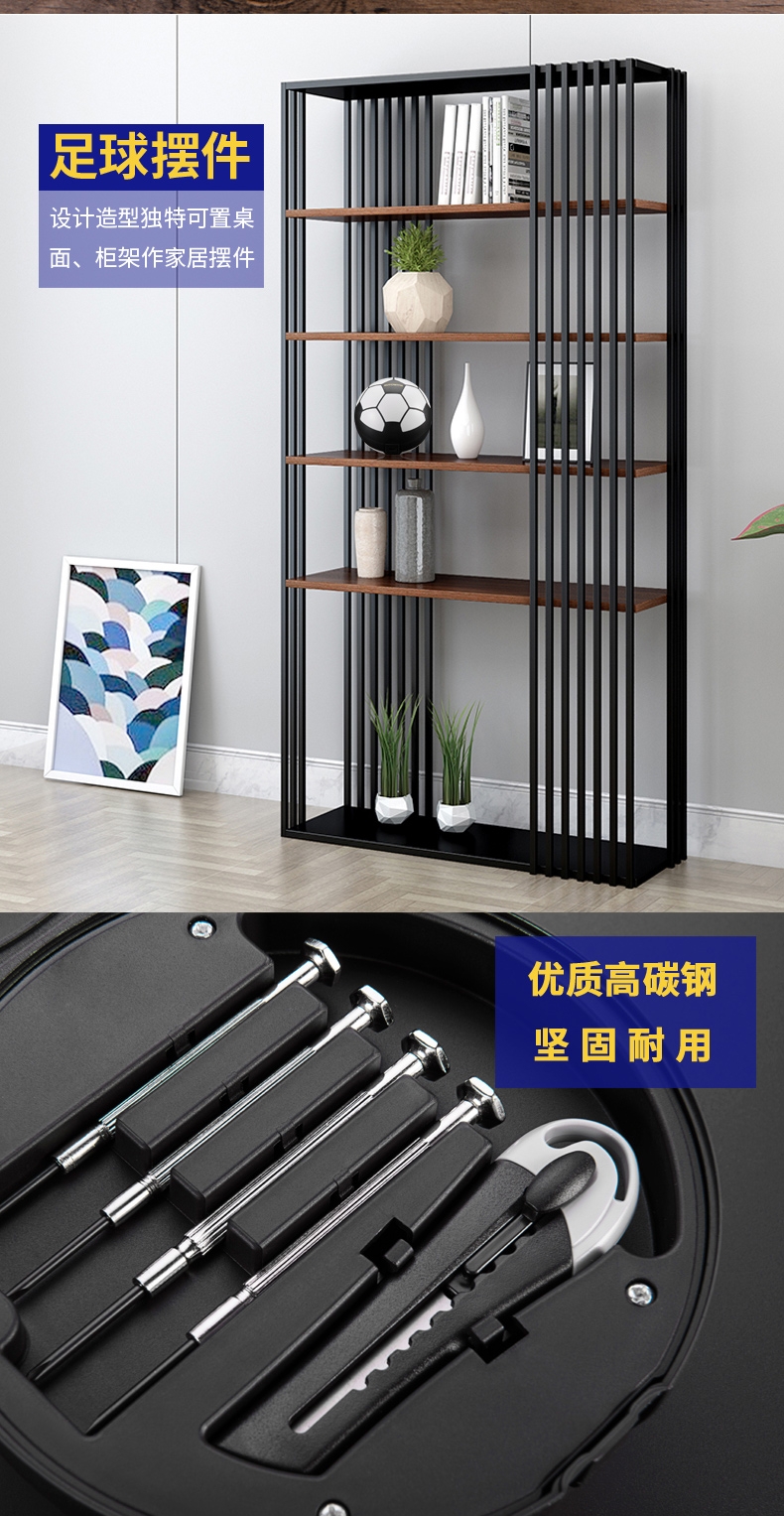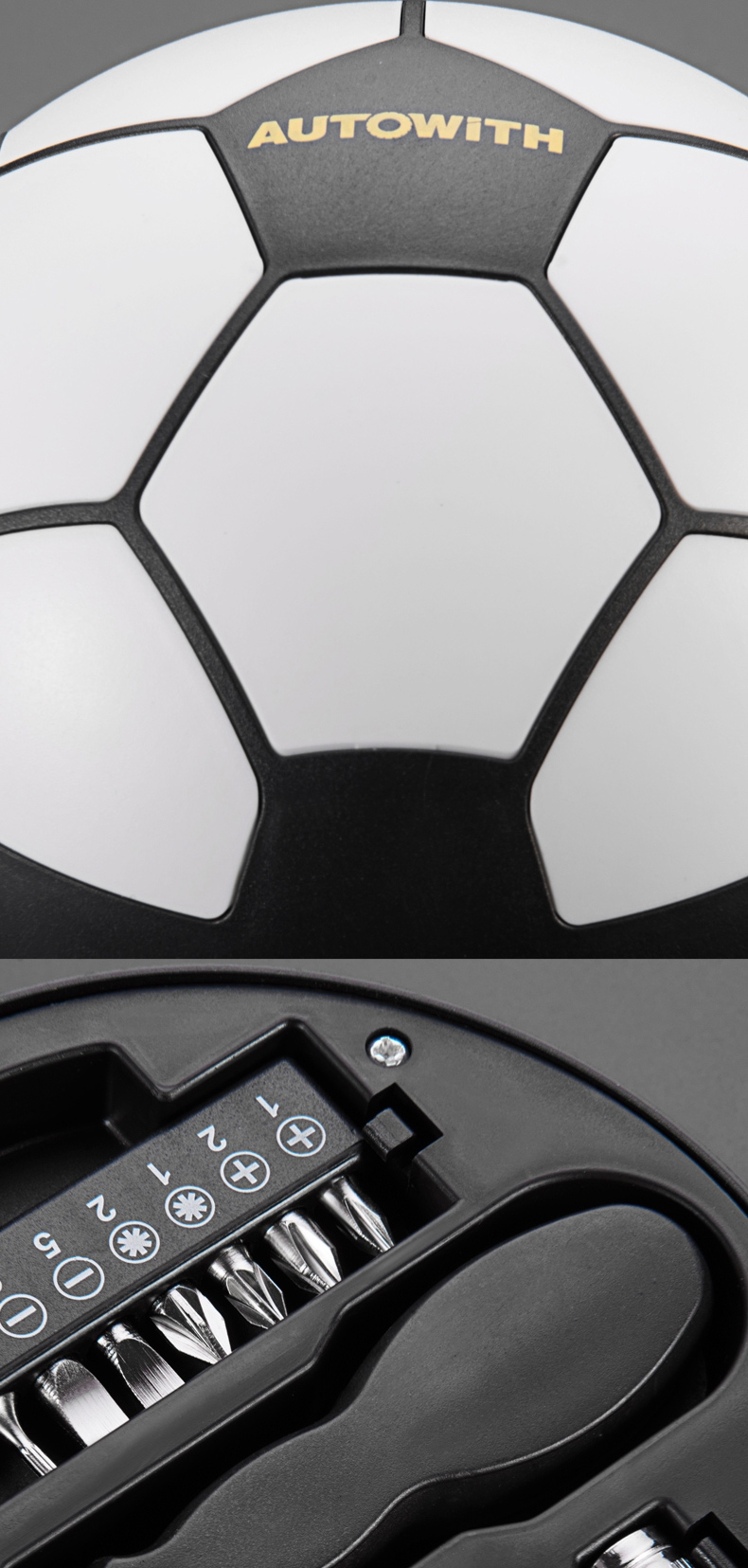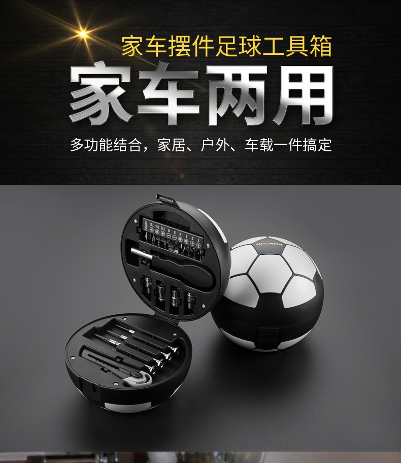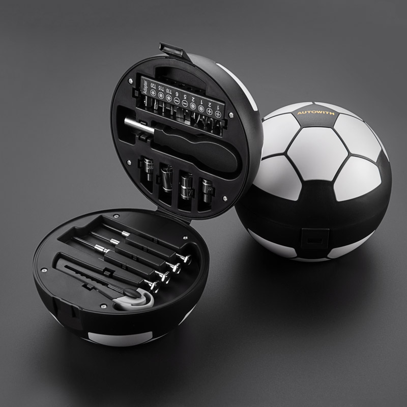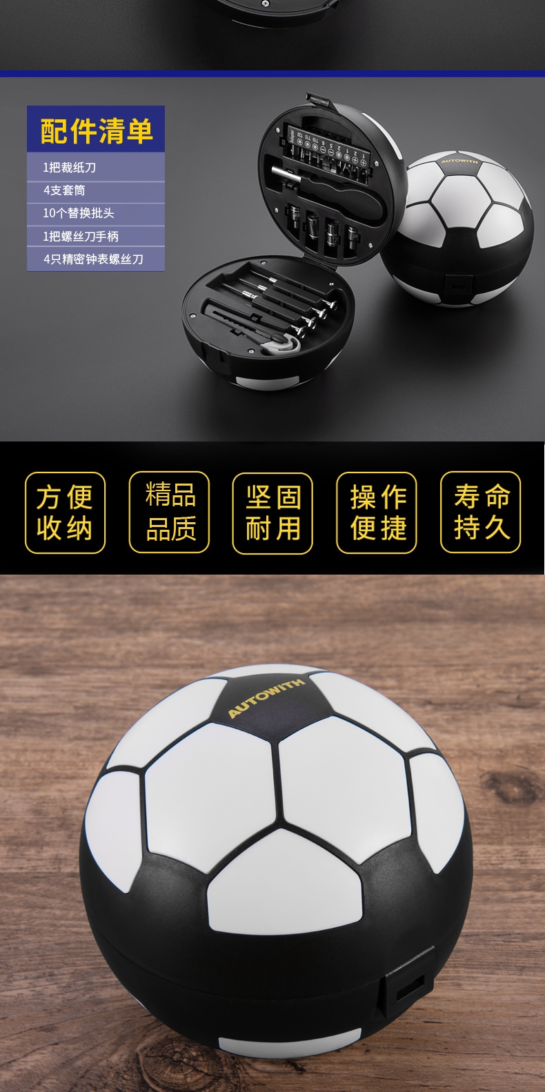全新足球摆件设计造型,不使用工具的时候可置于桌面;工具采用人体工学造型设计,使用舒适;工具采用优质高碳钢,坚固耐用