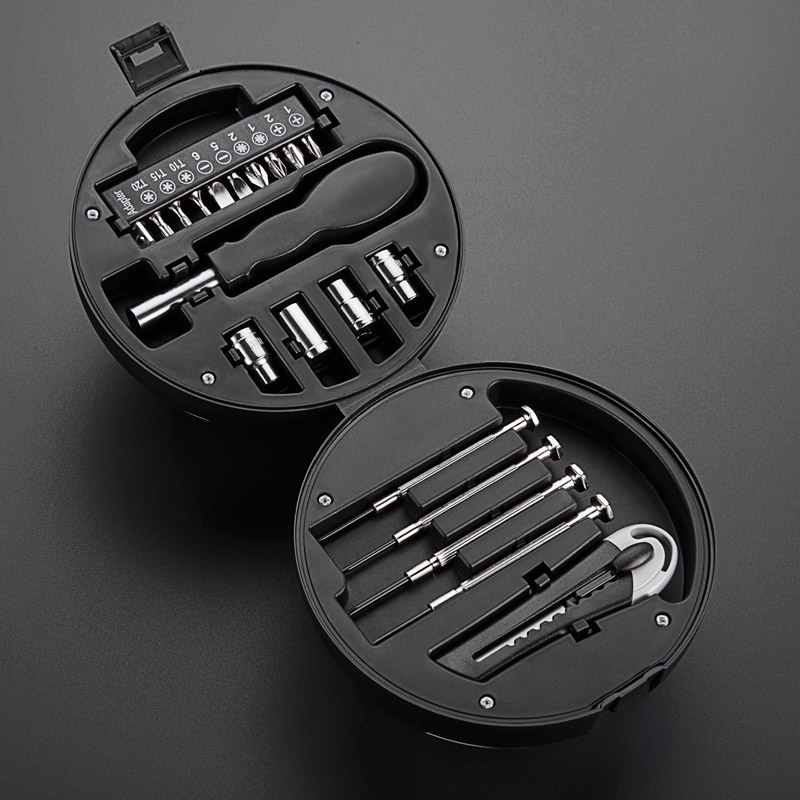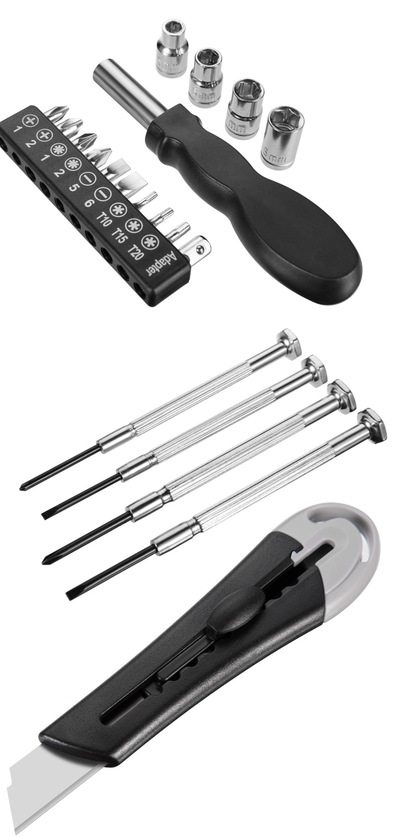产品组成:1把裁纸刀 4支套筒 10个替换批头 1把螺丝刀手柄 4只精密钟表螺丝刀