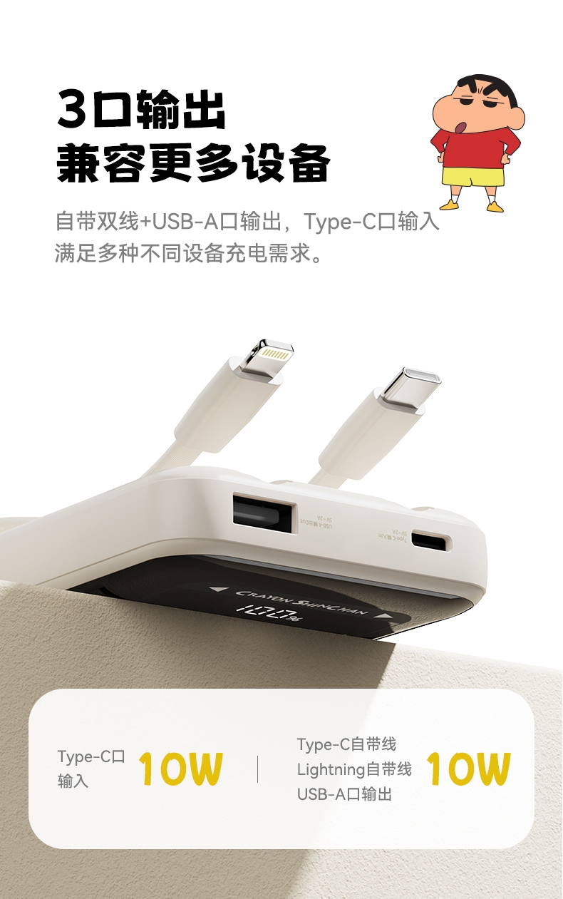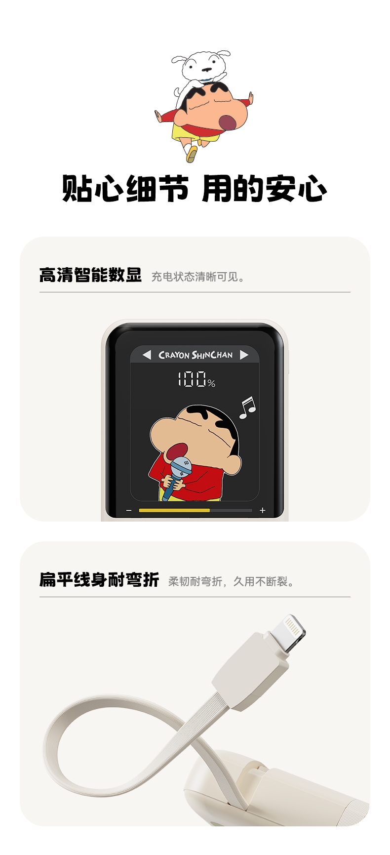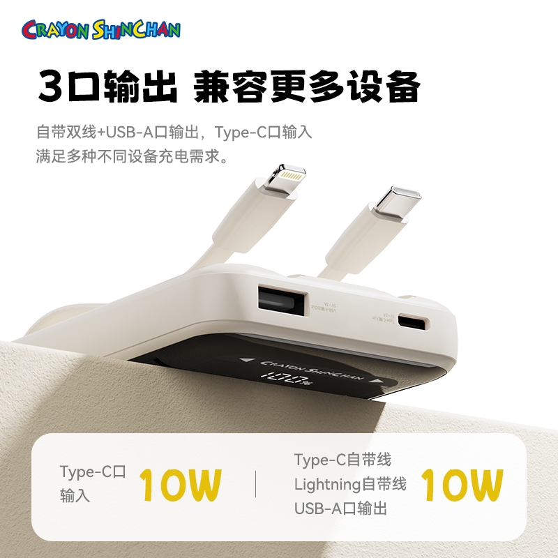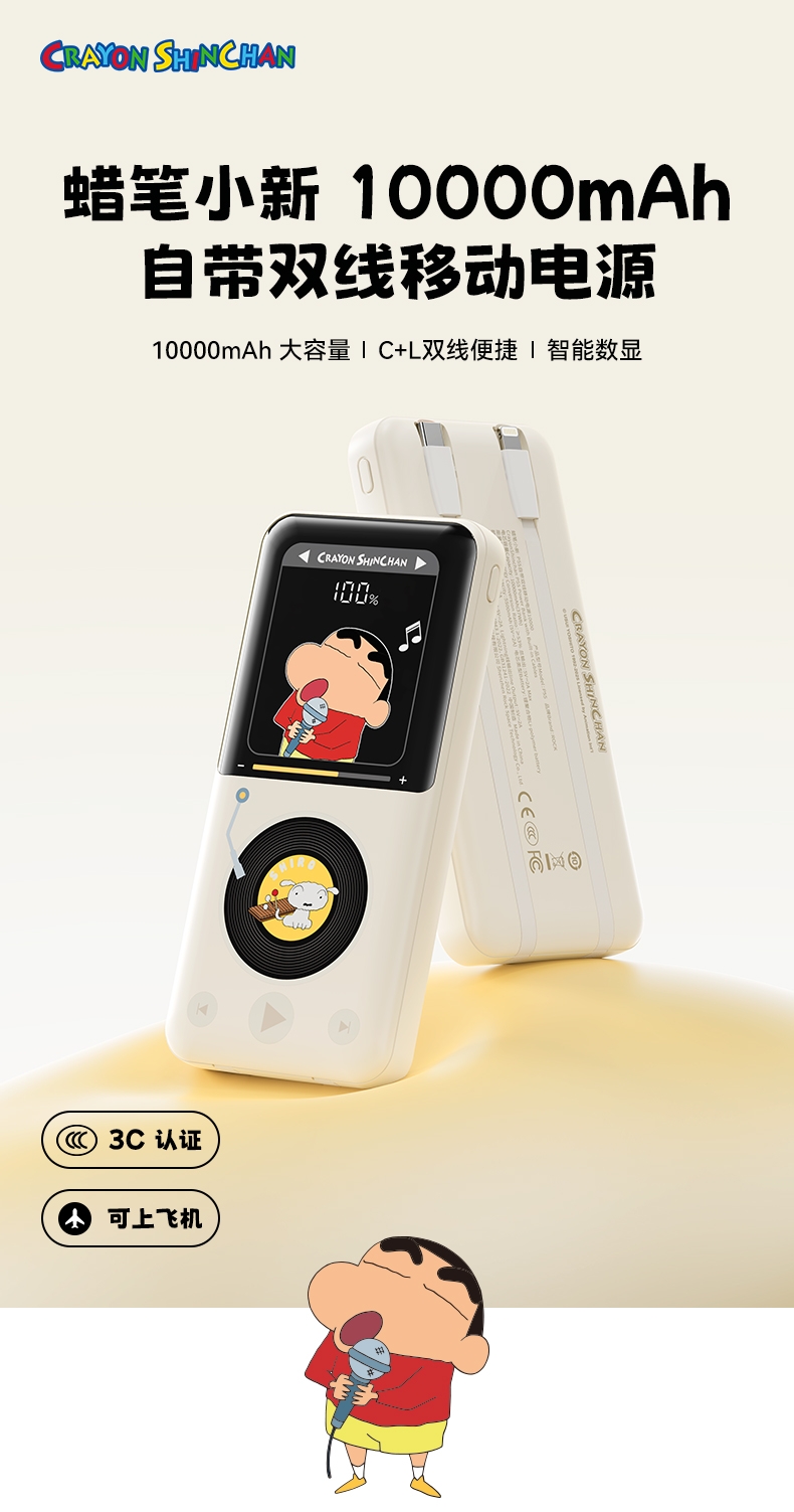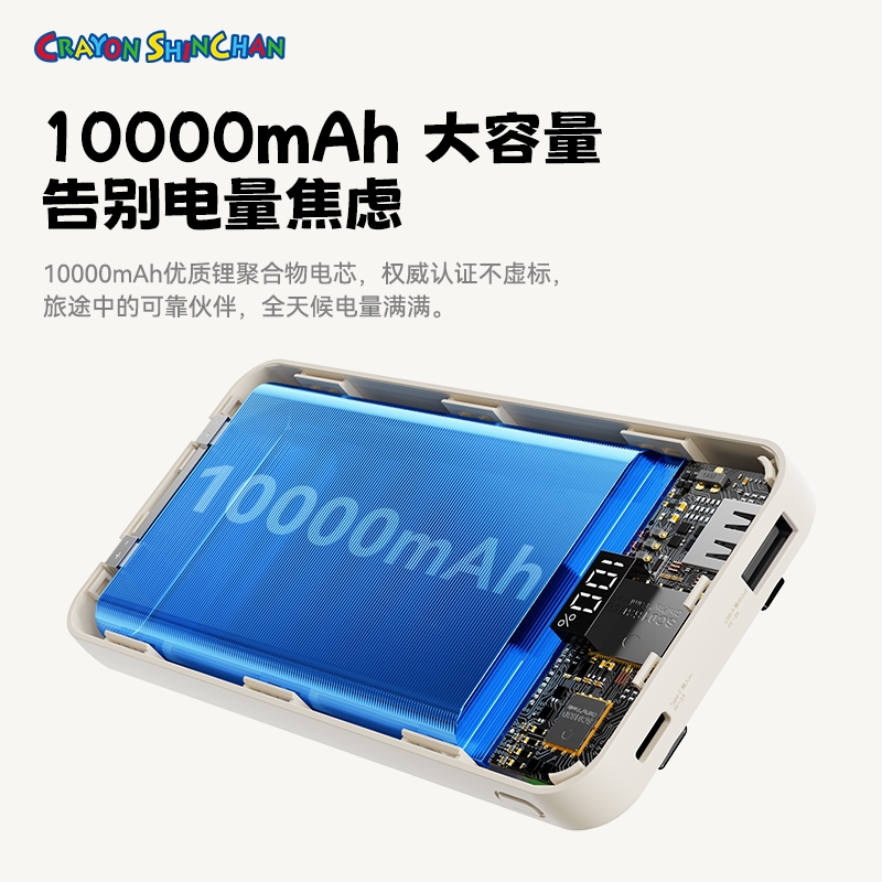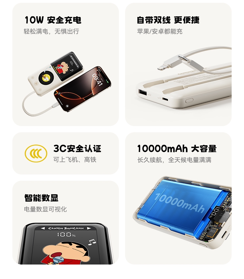 自带双线,轻松出行、一机搞定多设备,出门更从容;内置智芯监测,实时控温+涓流保护;产品清晰标注“CCC”标志,符合民航标准;高清数显实时电量,充电状态一目了然 扁平线材耐弯折
