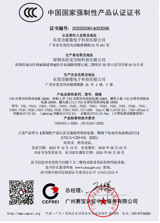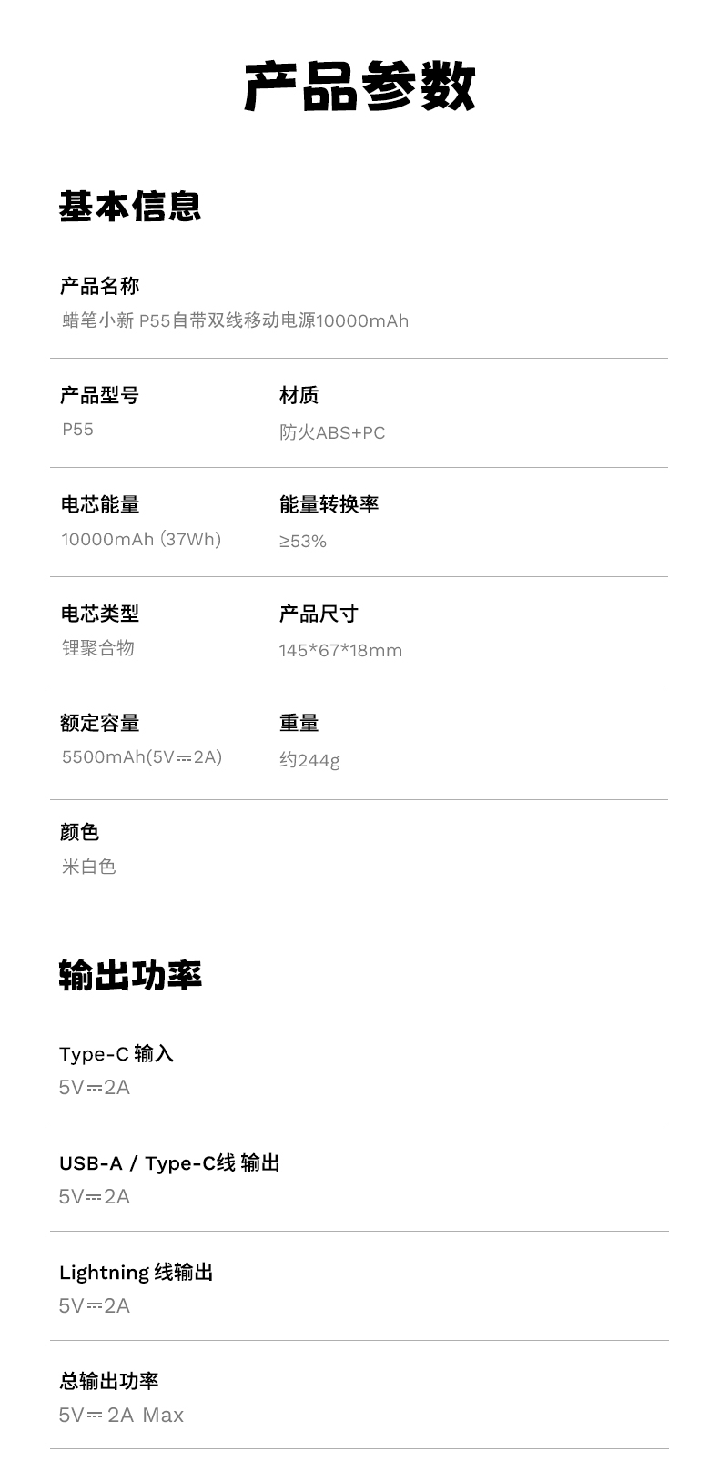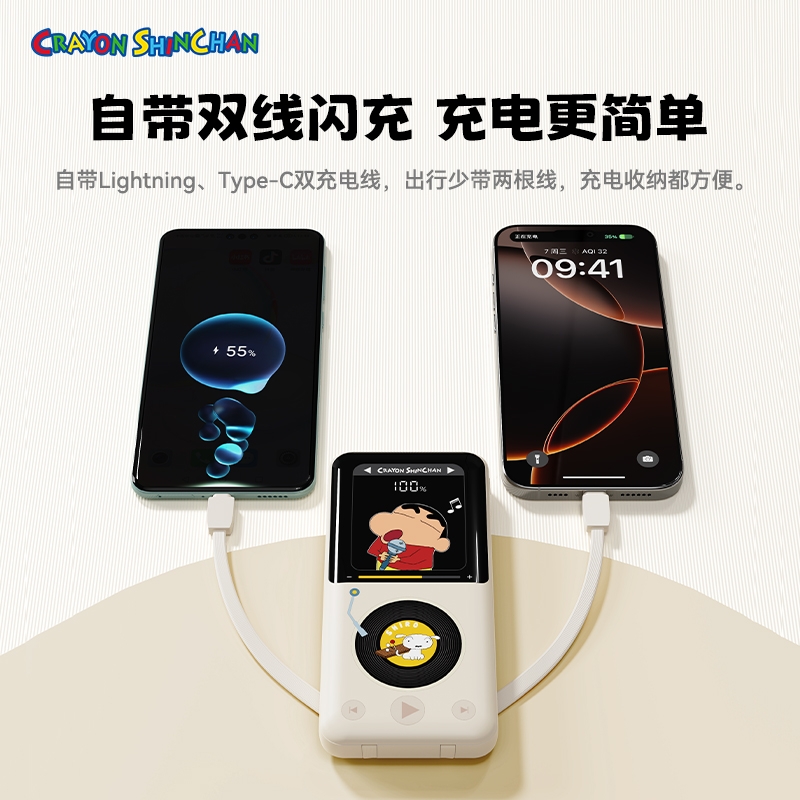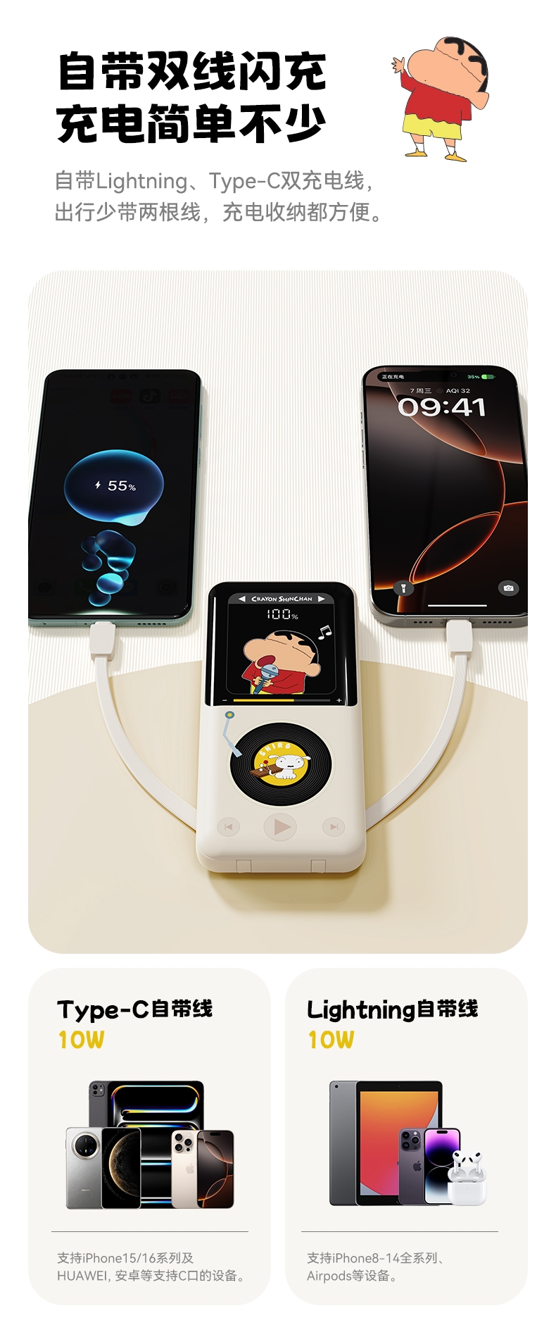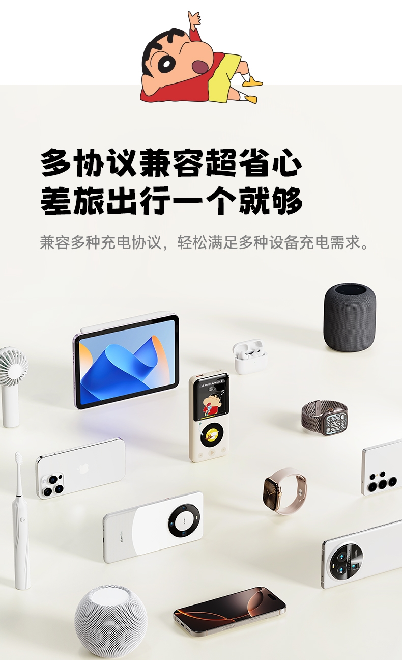 自带双线,轻松出行、一机搞定多设备,出门更从容;内置智芯监测,实时控温+涓流保护;产品清晰标注“CCC”标志,符合民航标准;高清数显实时电量,充电状态一目了然 扁平线材耐弯折