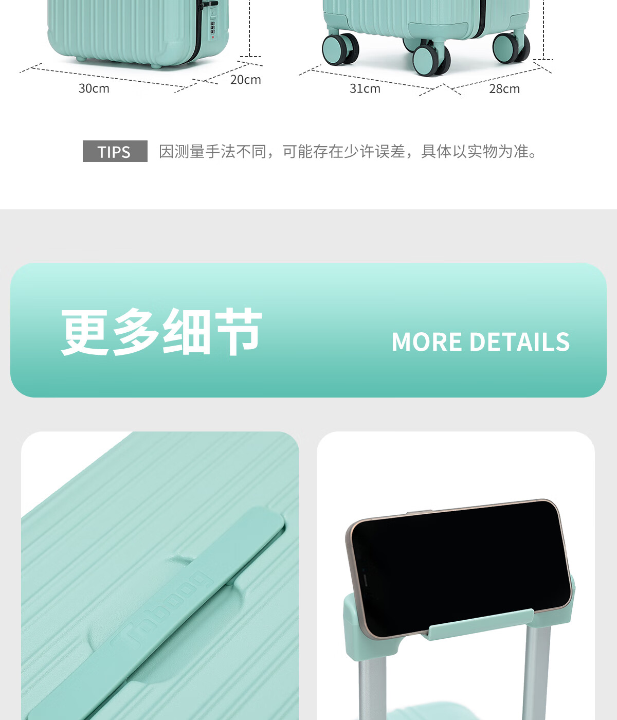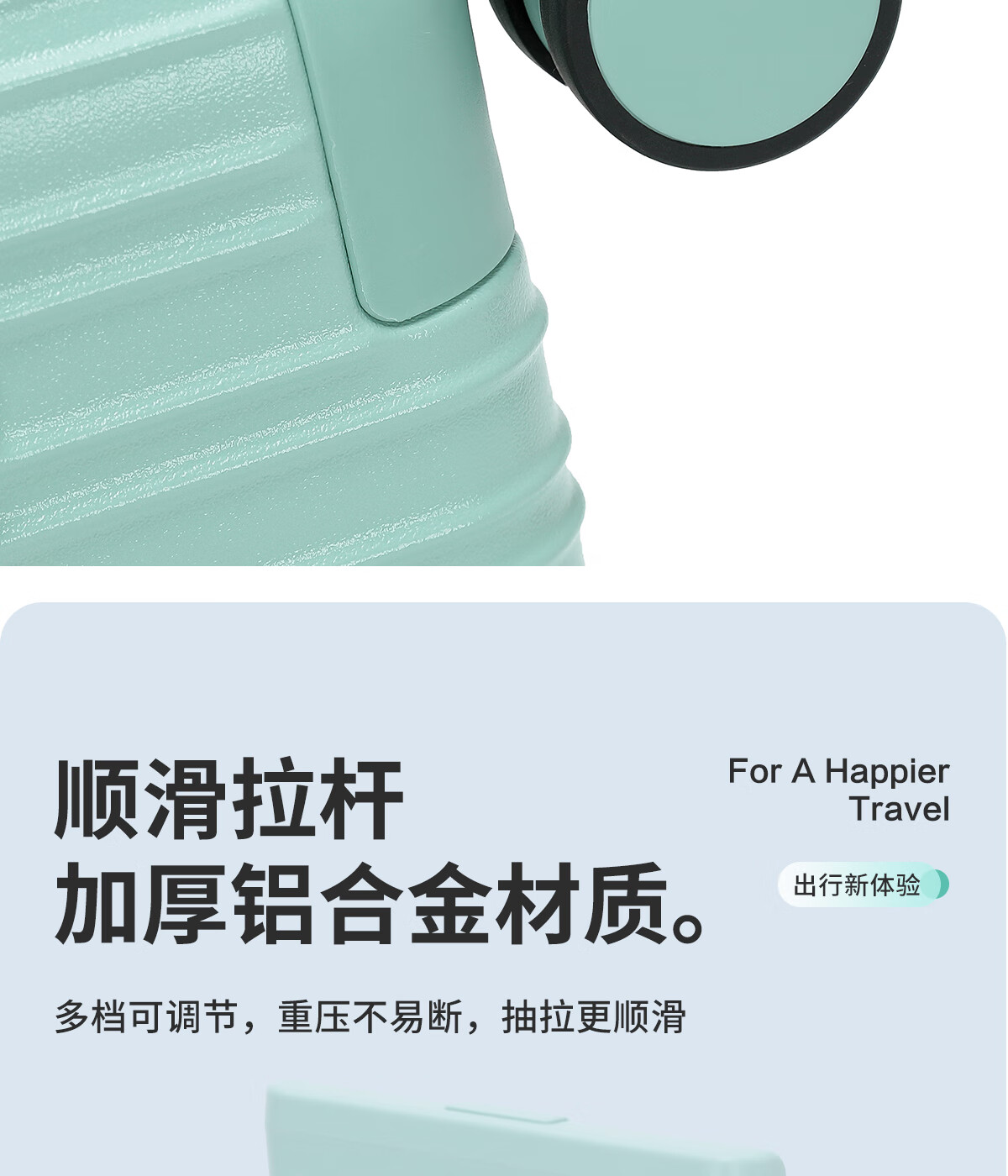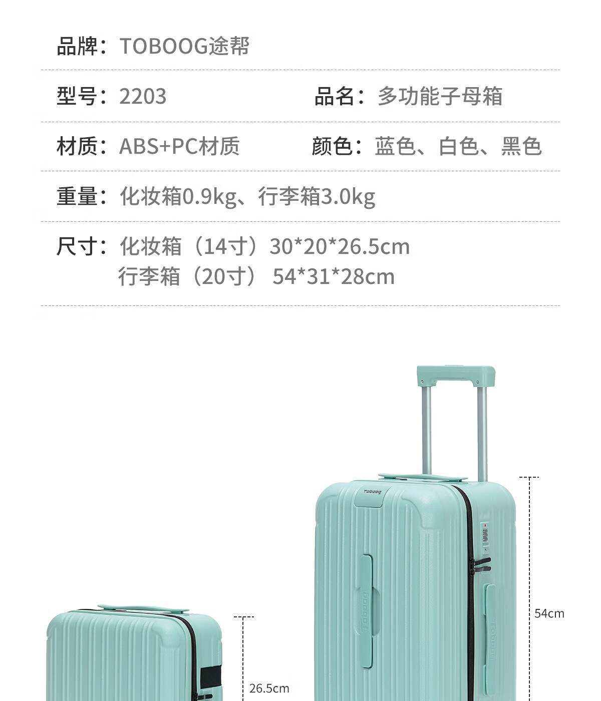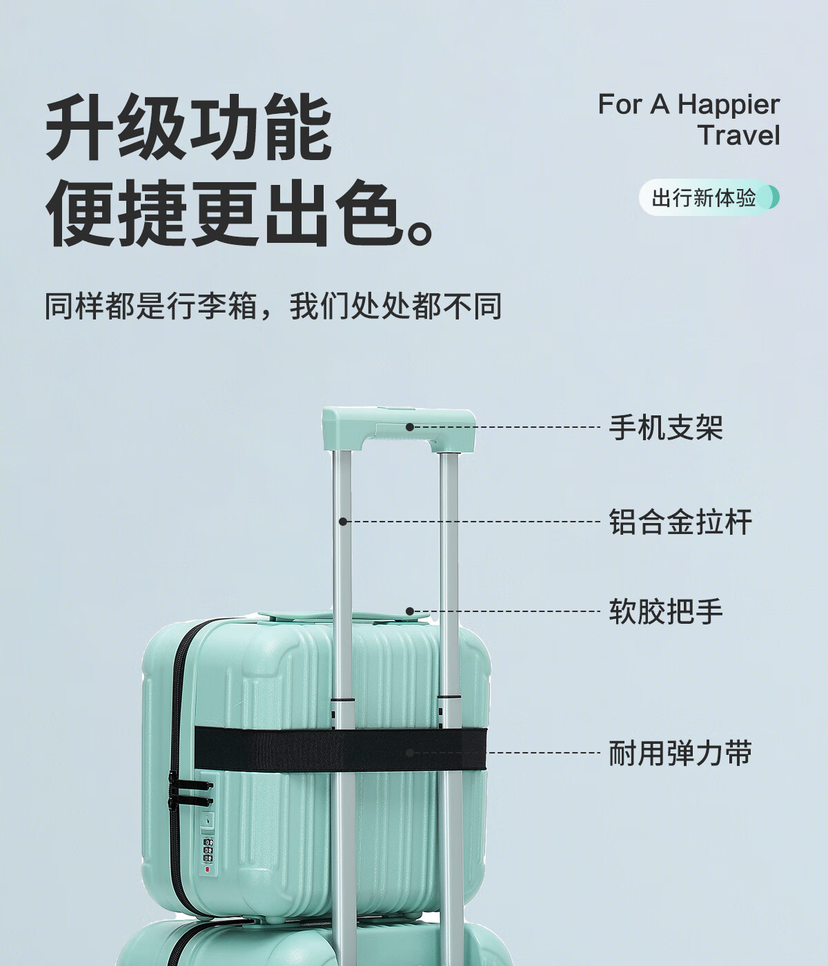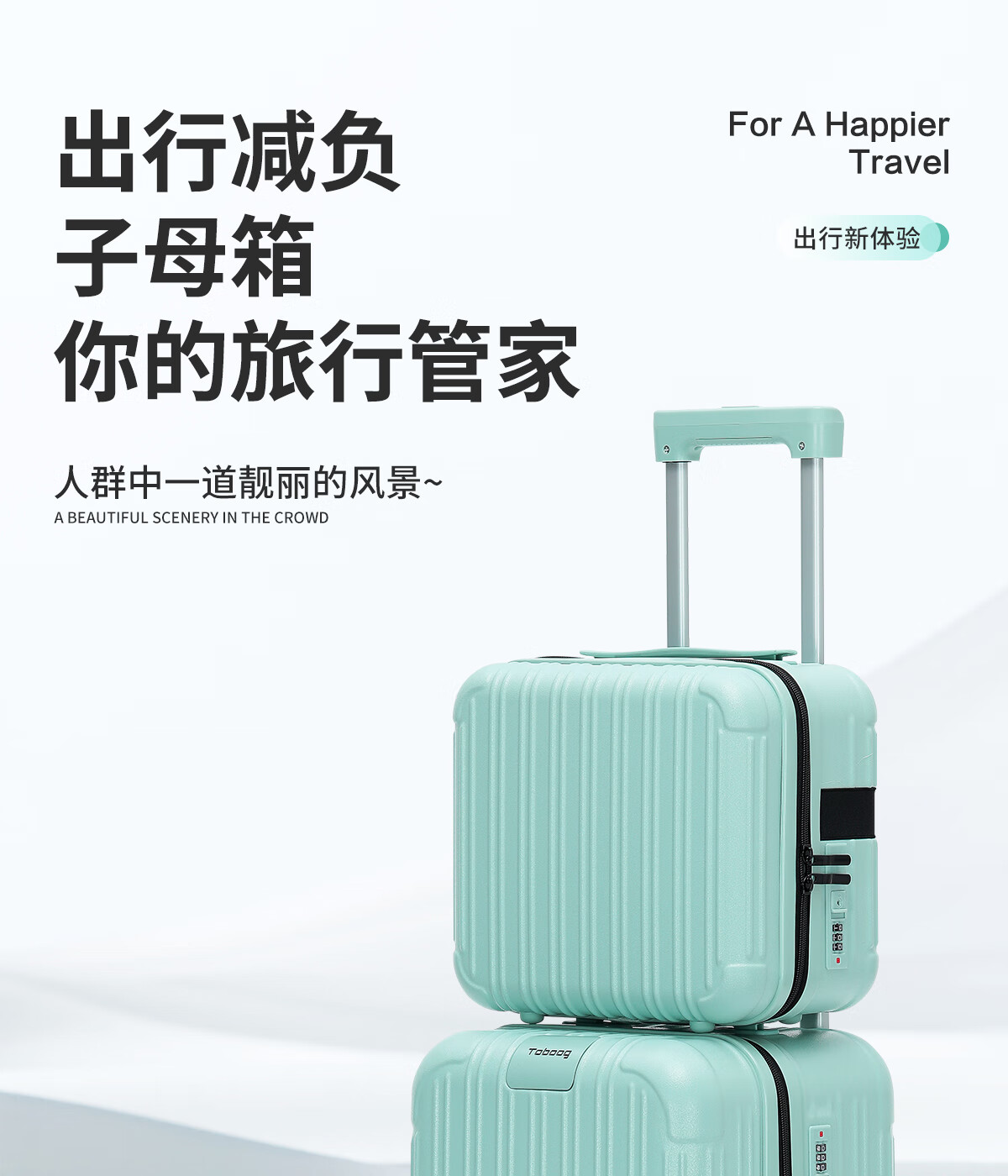 大小搭配 出行不累 小物放置,随手取用更方便;三档高度可调节拉杆;科学归纳随身物品 合理分配内部空间收纳更多衣物