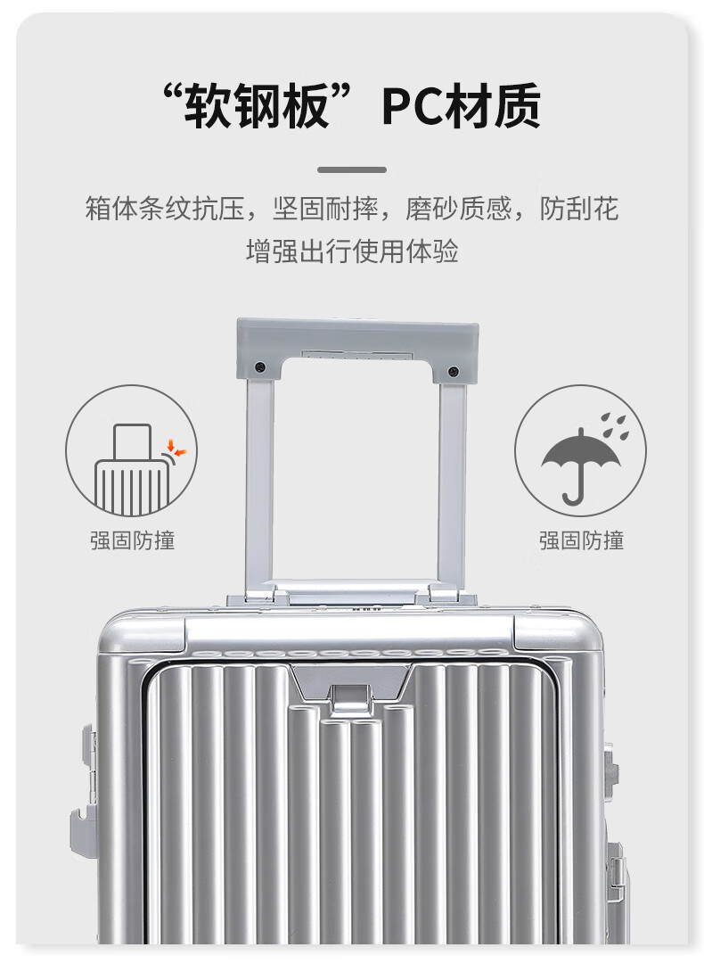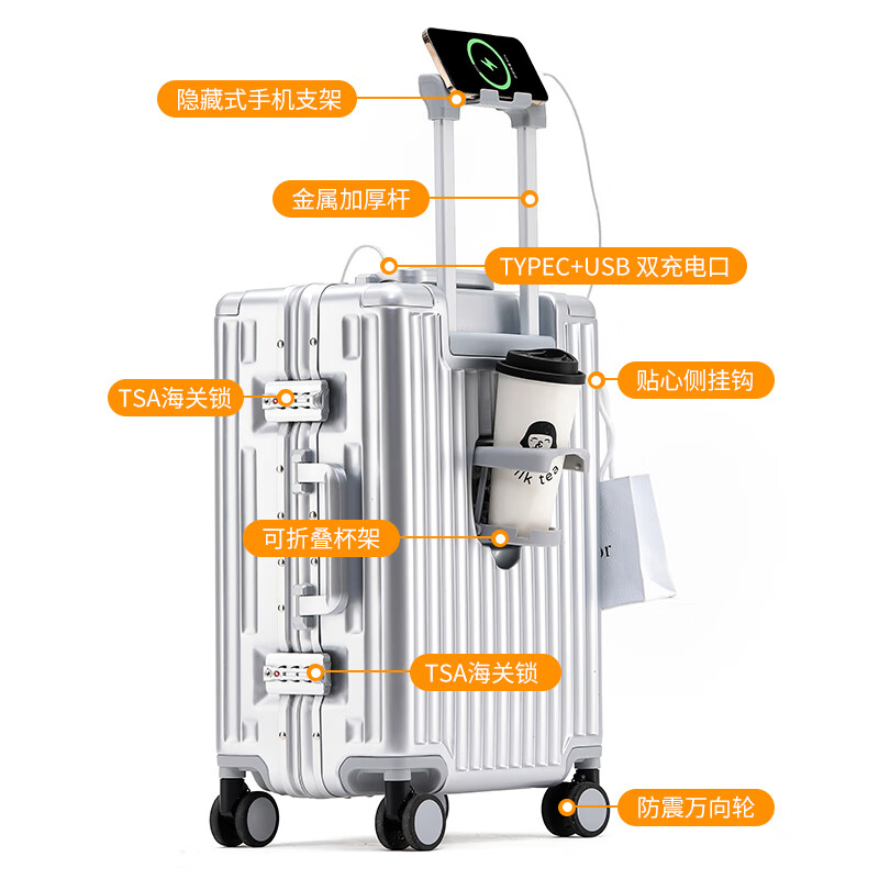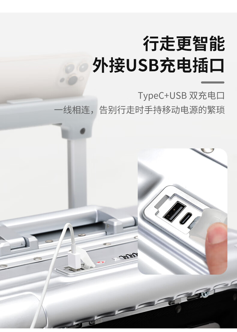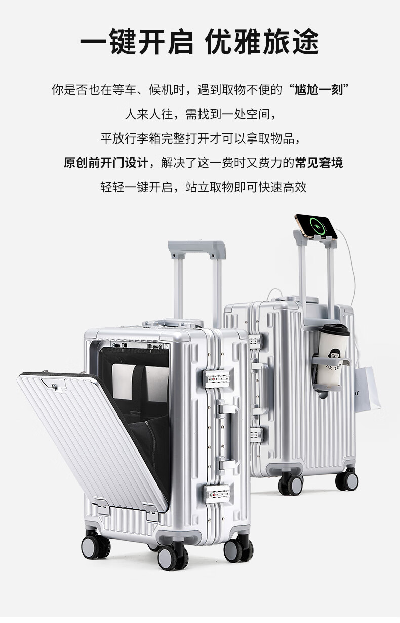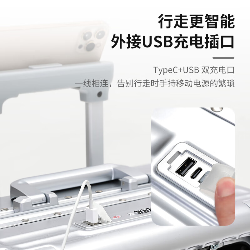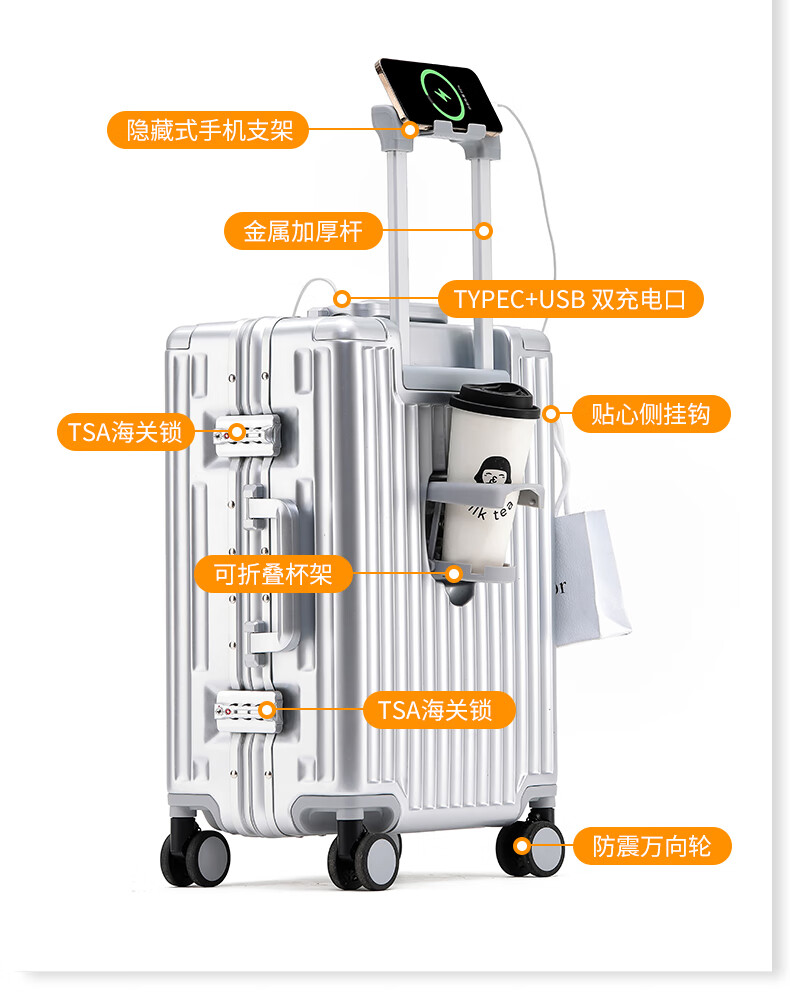 行走更智能,外接USB充电插口;TSA海关密码锁,360度轻音轮;可折叠杯架,防磨提手,贴心侧挂钩;拉杆强度升级,加厚加固,多档可调节;多功能前仓,软钢板PC材质,合理分区