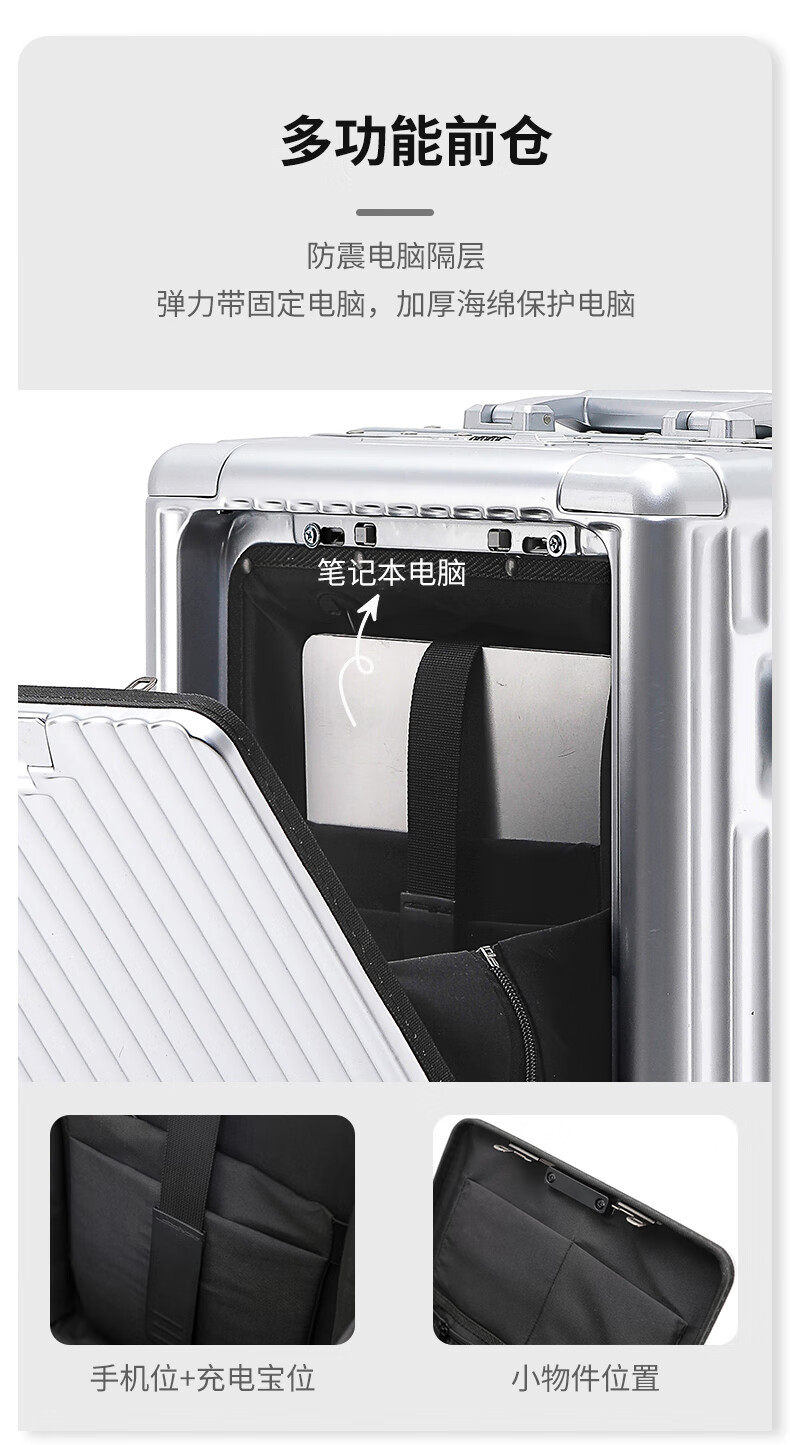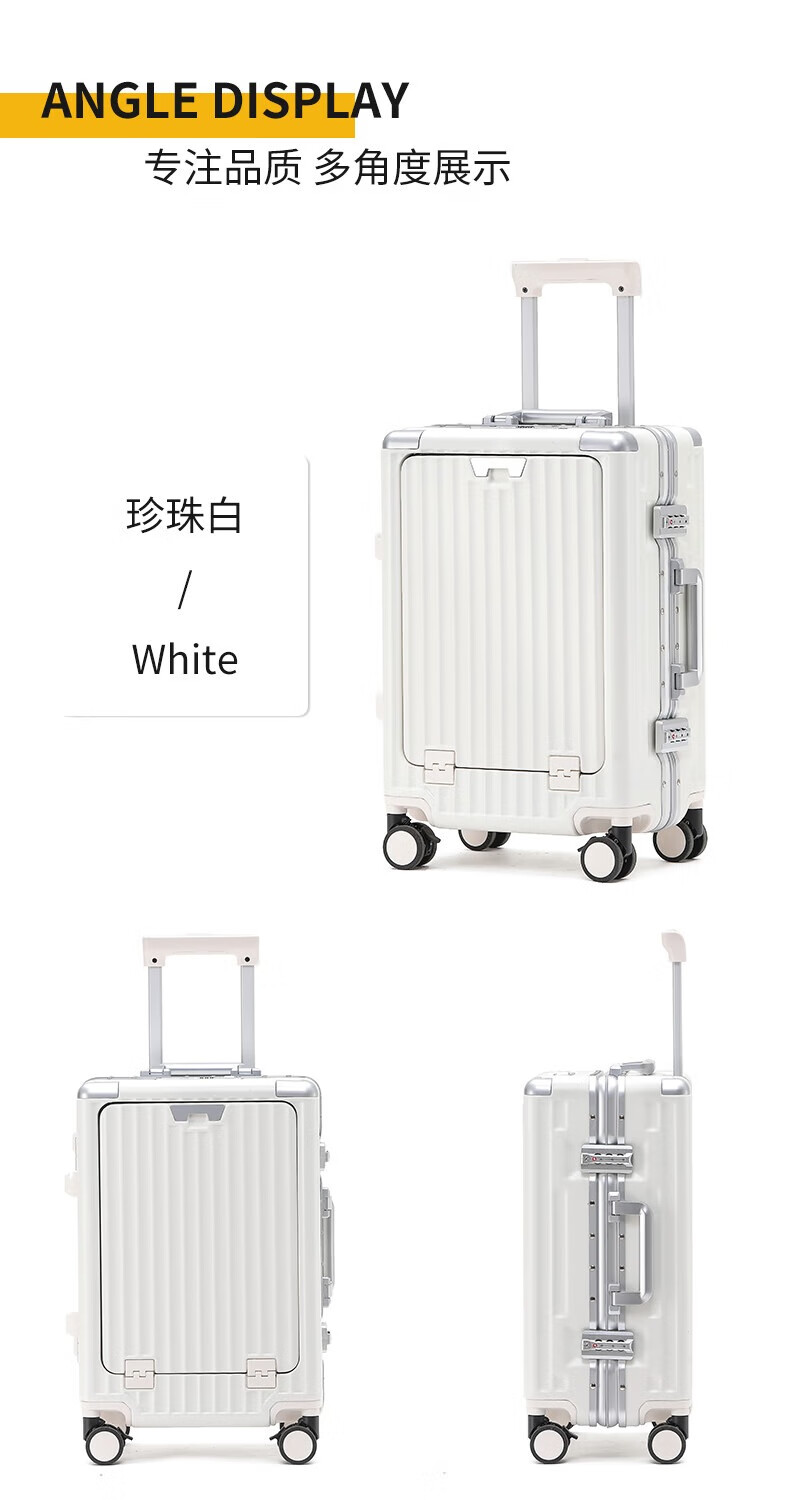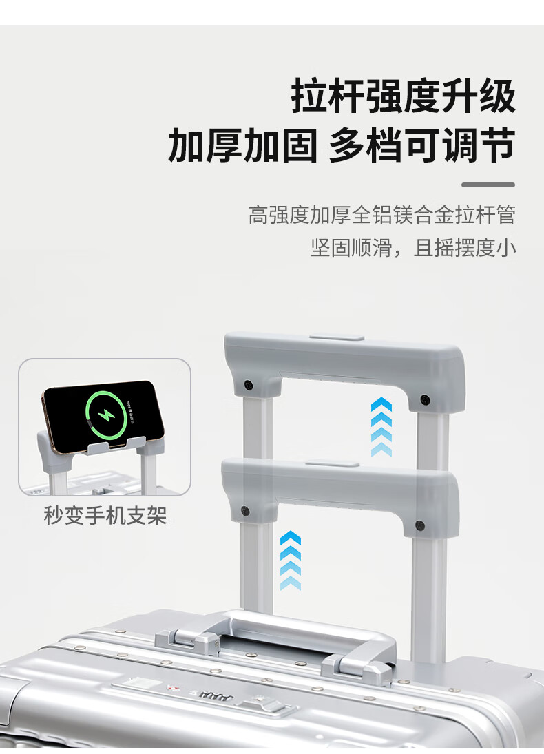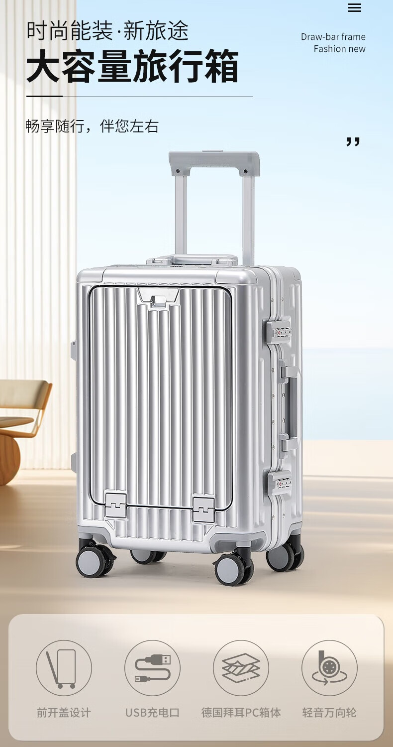 行走更智能,外接USB充电插口;TSA海关密码锁,360度轻音轮;可折叠杯架,防磨提手,贴心侧挂钩;拉杆强度升级,加厚加固,多档可调节;多功能前仓,软钢板PC材质,合理分区