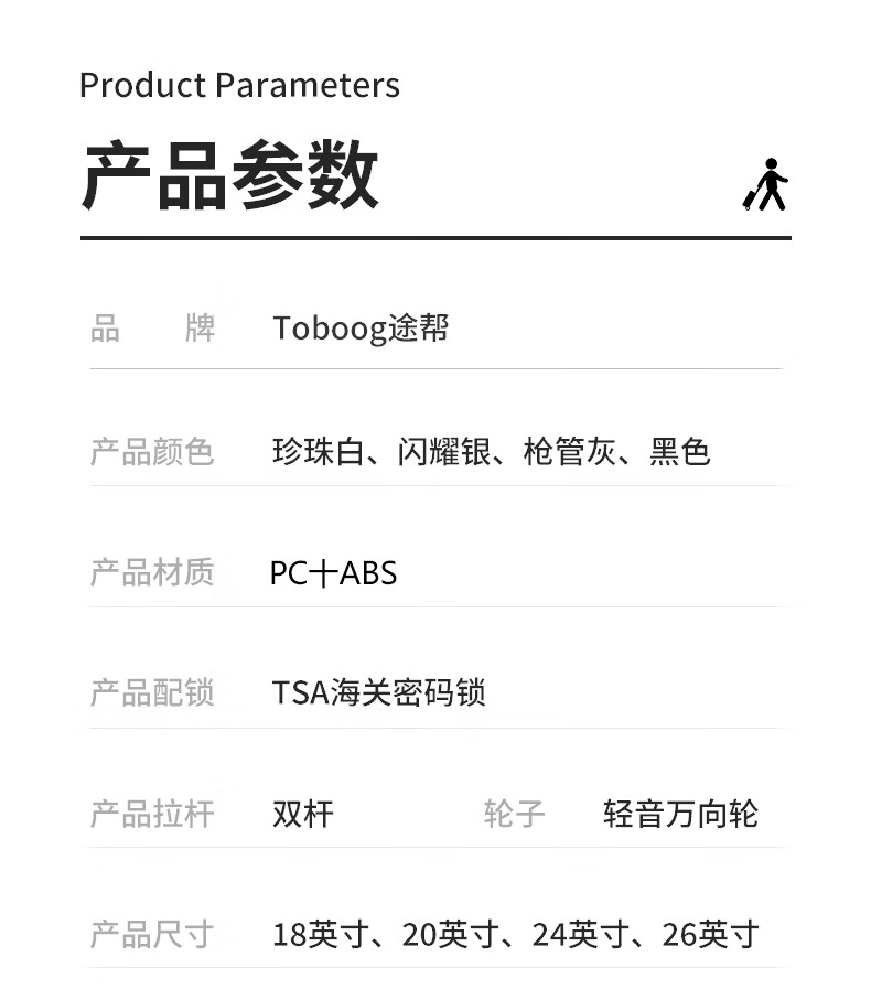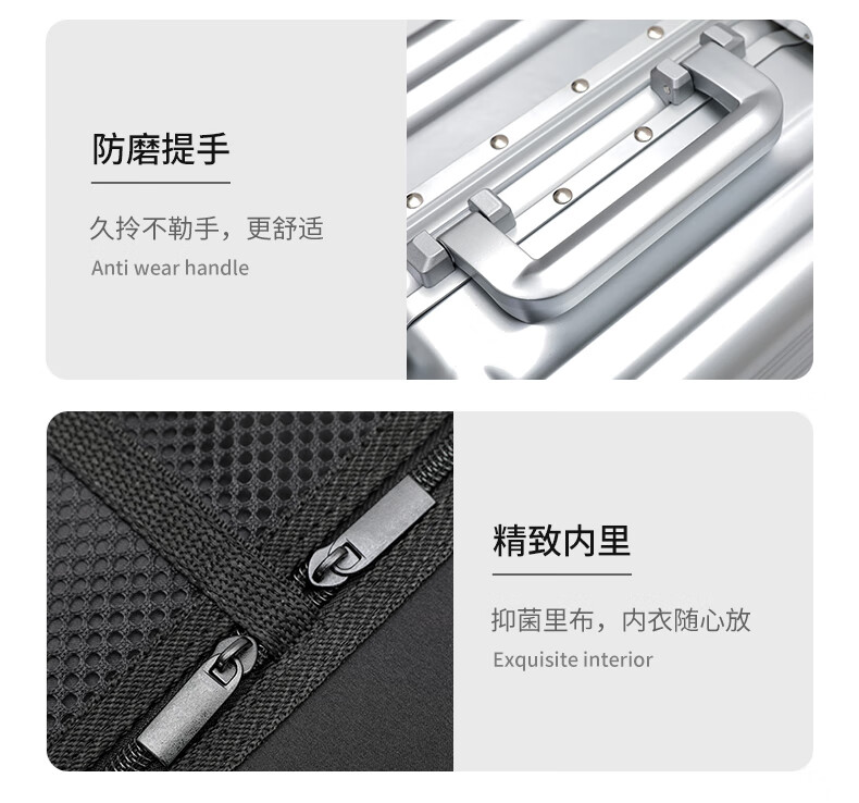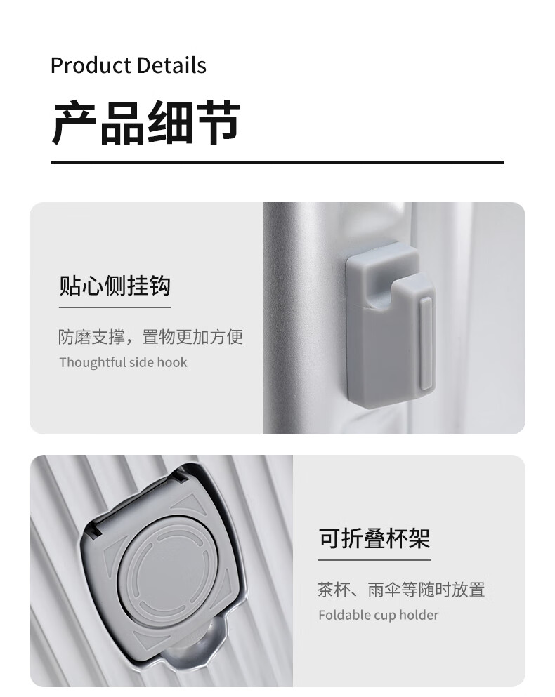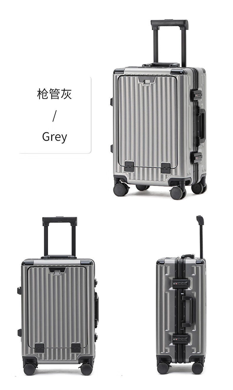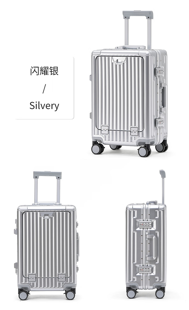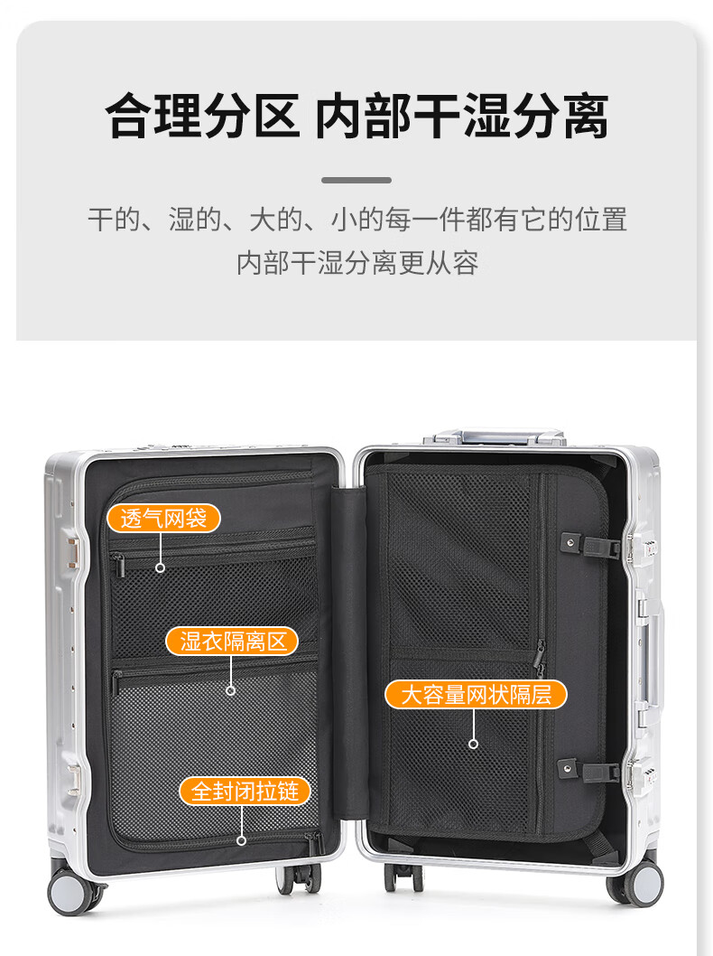 行走更智能,外接USB充电插口;TSA海关密码锁,360度轻音轮;可折叠杯架,防磨提手,贴心侧挂钩;拉杆强度升级,加厚加固,多档可调节;多功能前仓,软钢板PC材质,合理分区