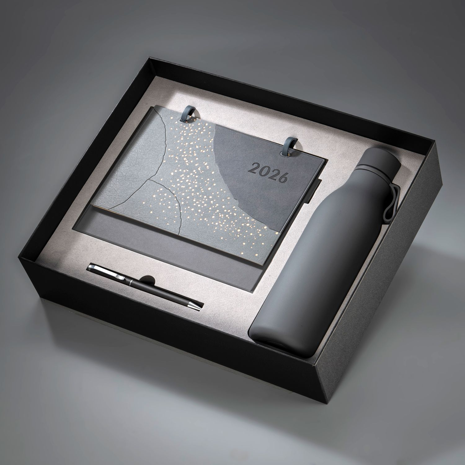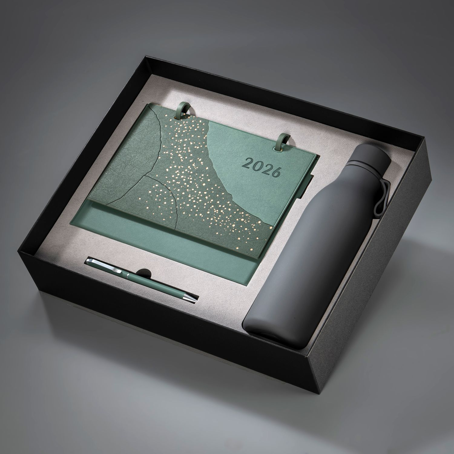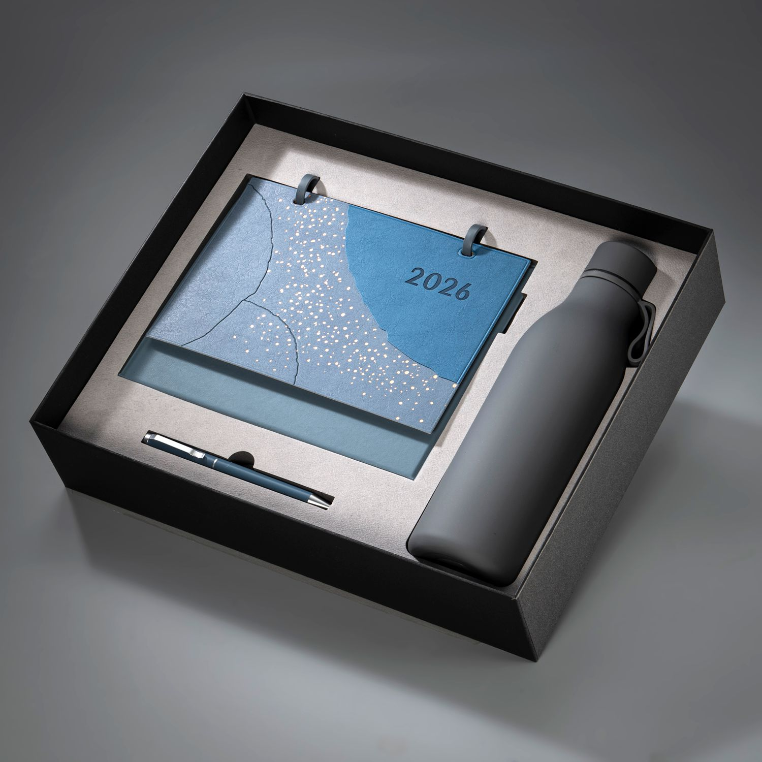 配置清单:金属烤漆台历环、12张内页(内容有可书写记录月计划)、皮质台历架、皮质封面(可按要求定制内容)、金属中性笔、保温杯、天地盖礼盒。