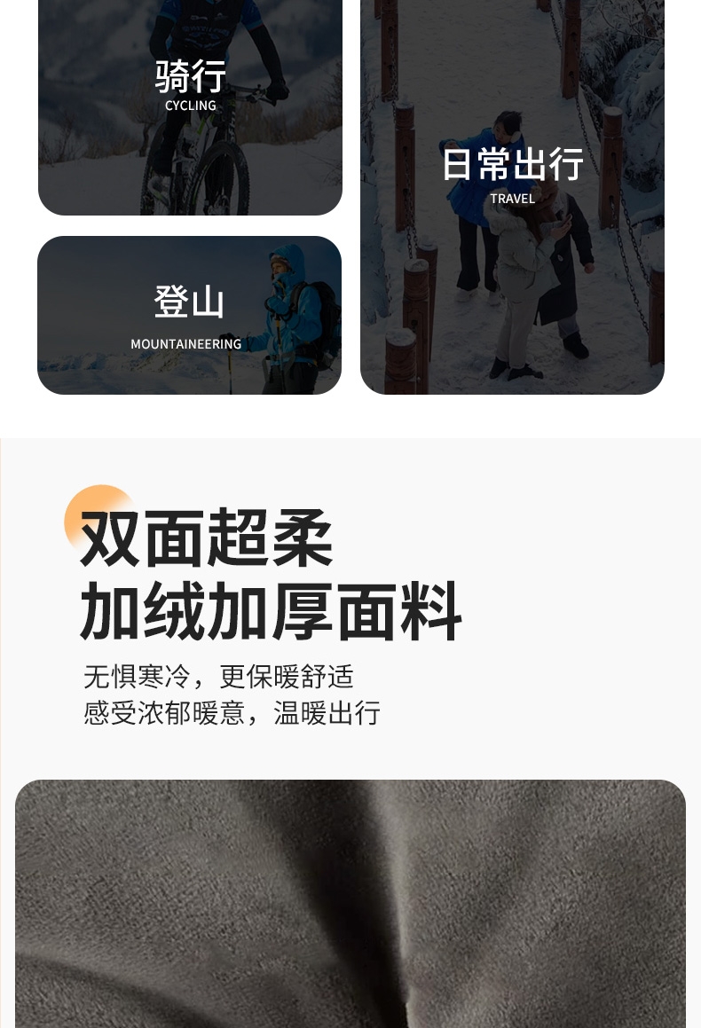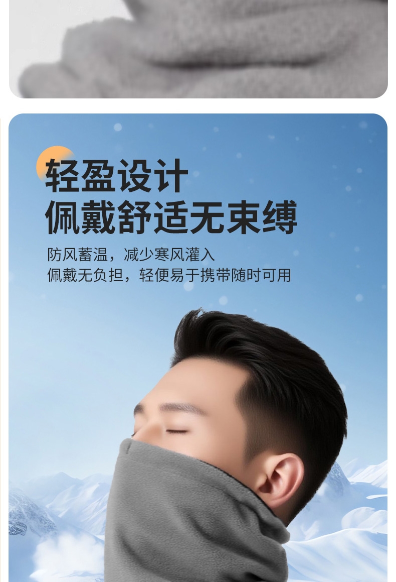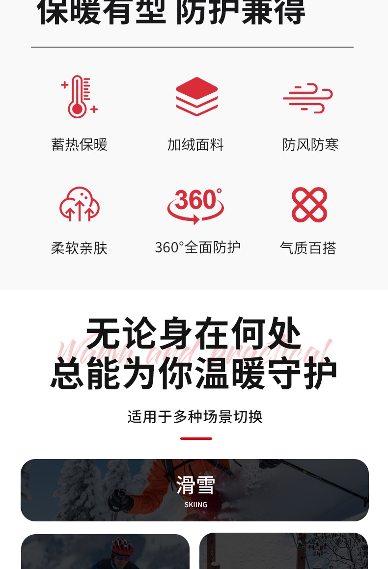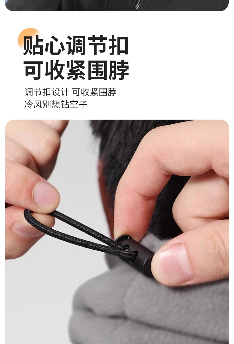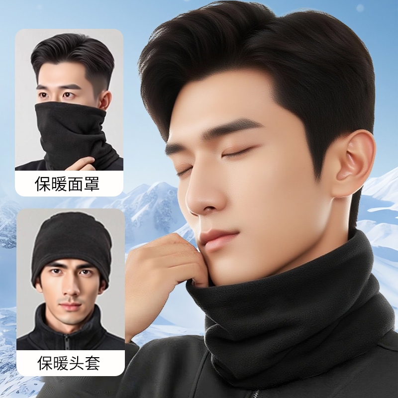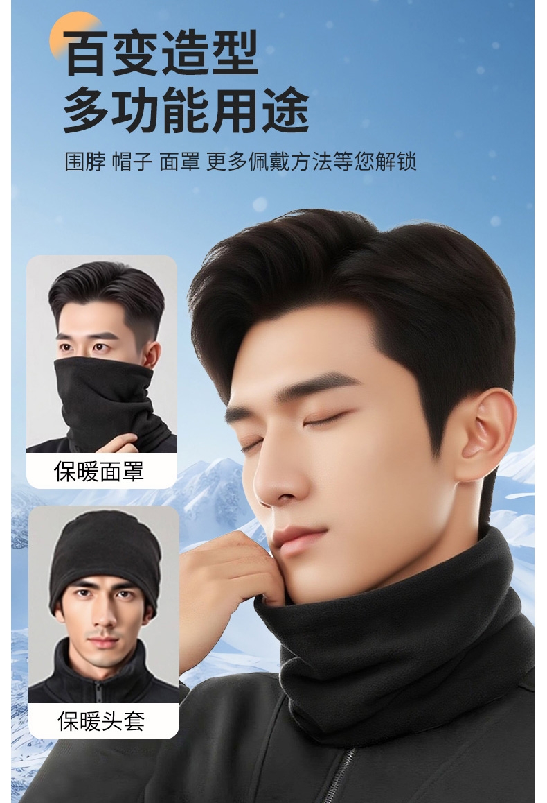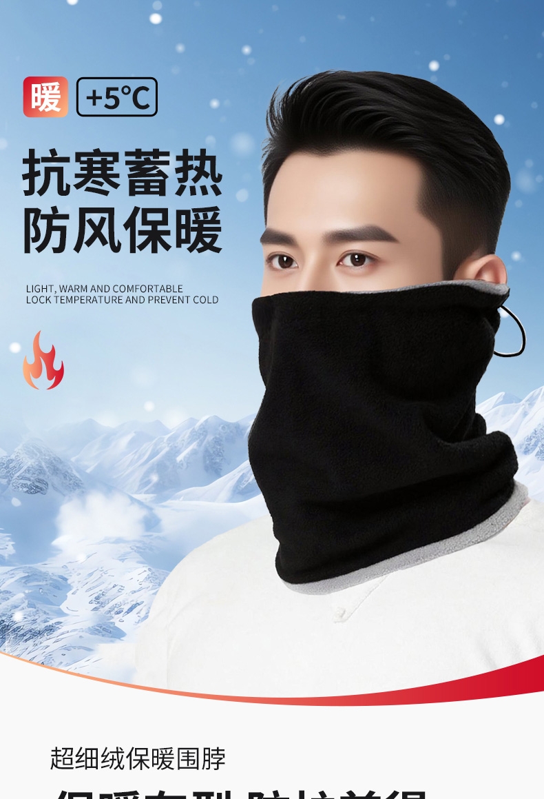 表面超柔面料,里面摇粒绒面料,亲肤柔软,保暖性强;一品多用,可以用做面罩使用,也可以用作围脖使用;可调节抽拉绳设计,防止滑落