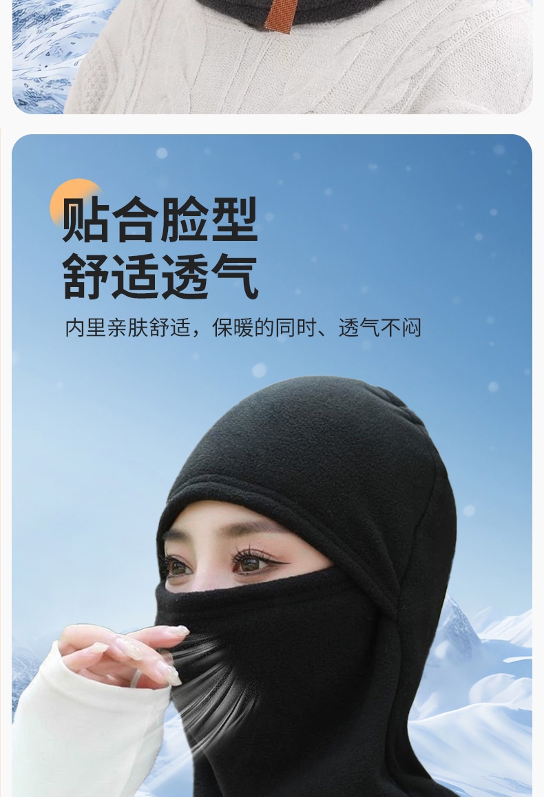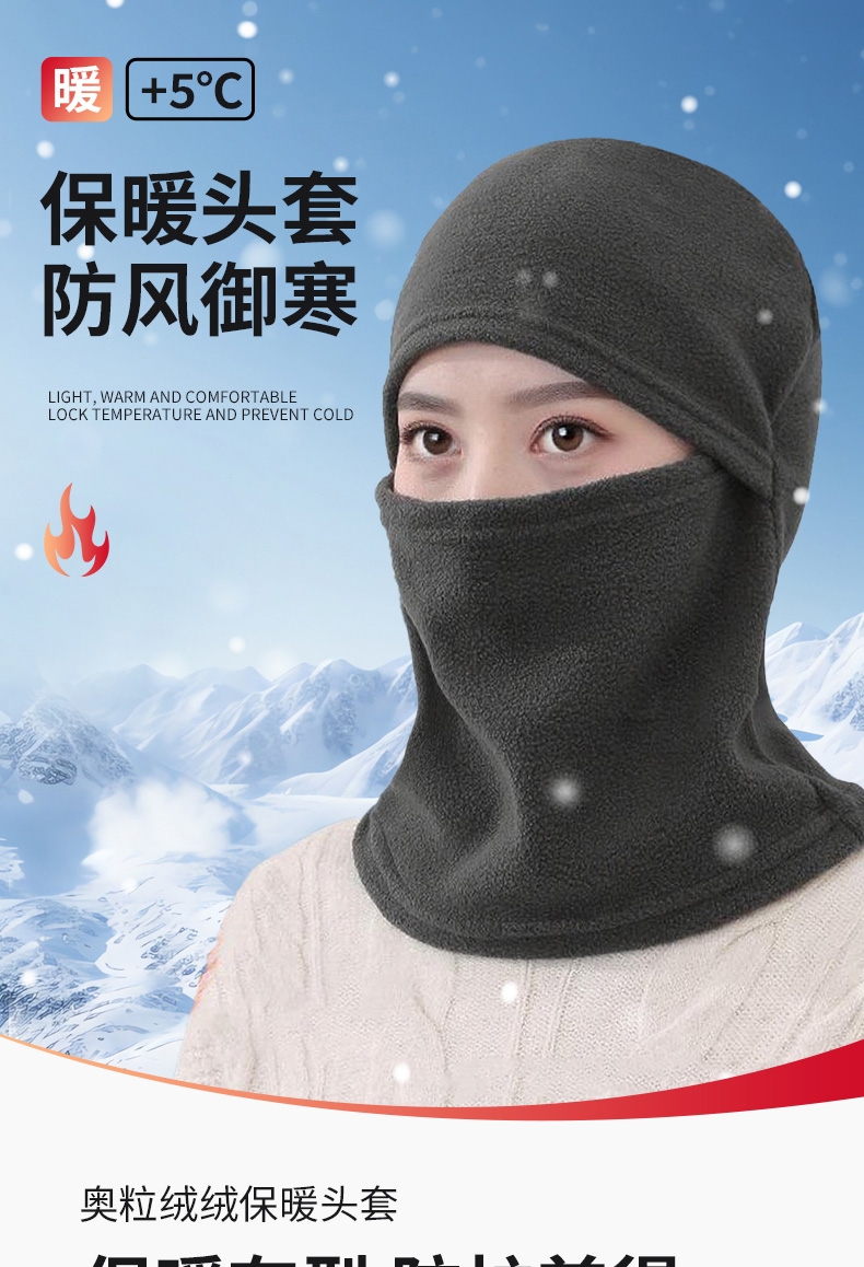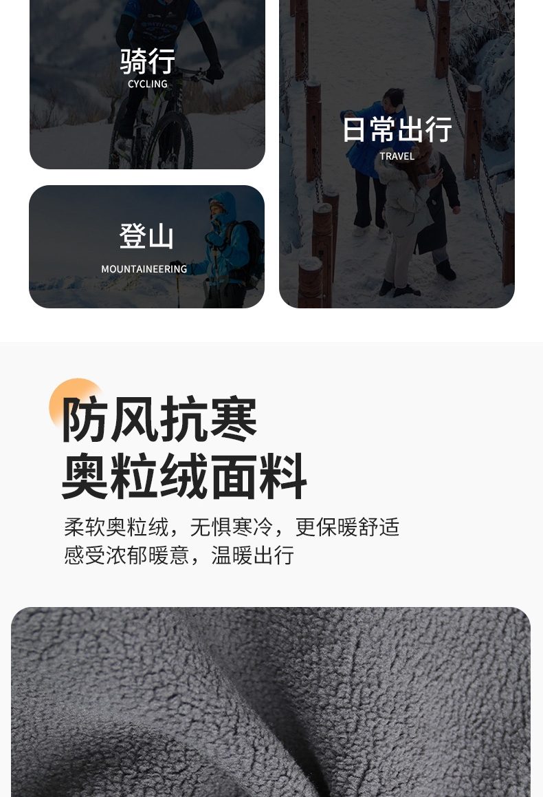 奥粒绒面料,亲肤柔软,保暖性强;强 护头护耳护颈设计;全方位保暖,无惧寒冷