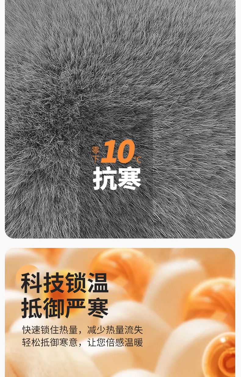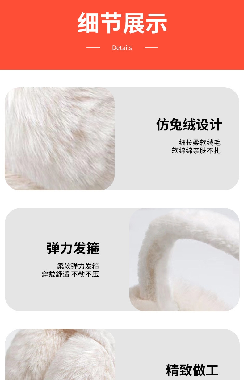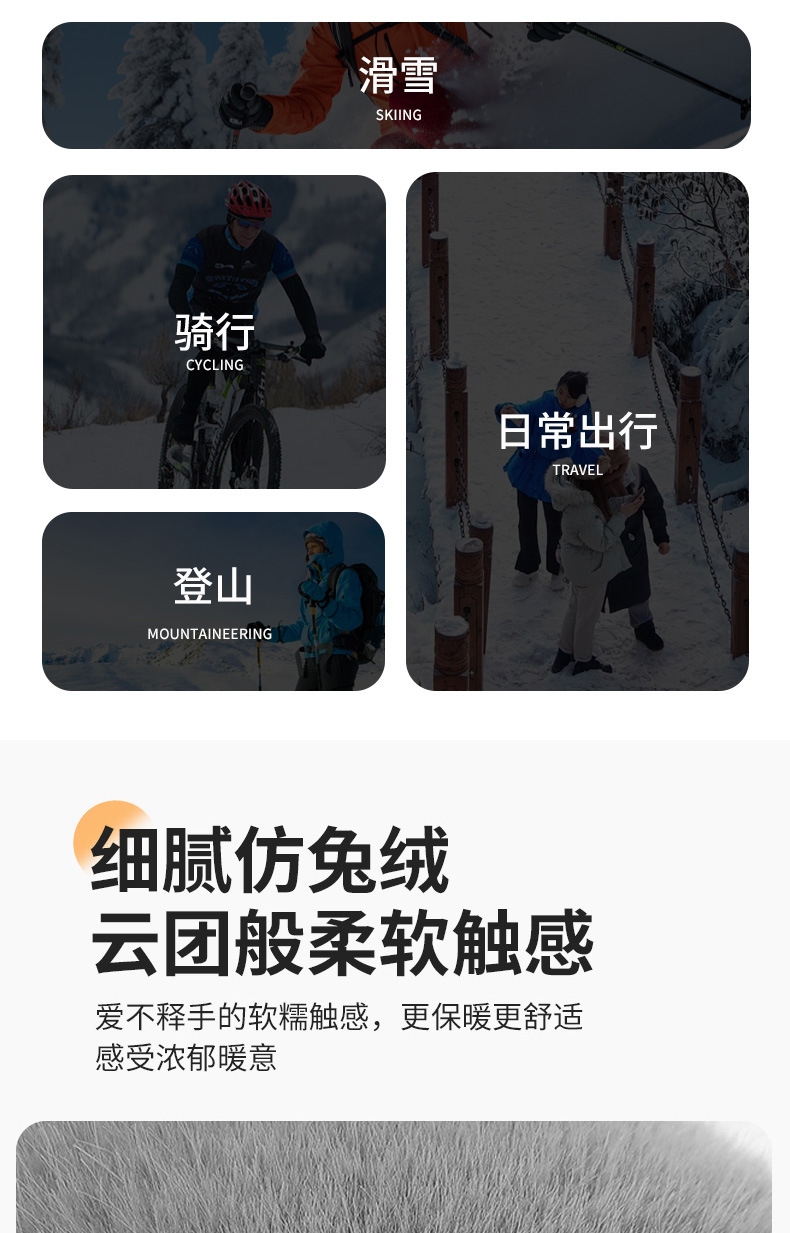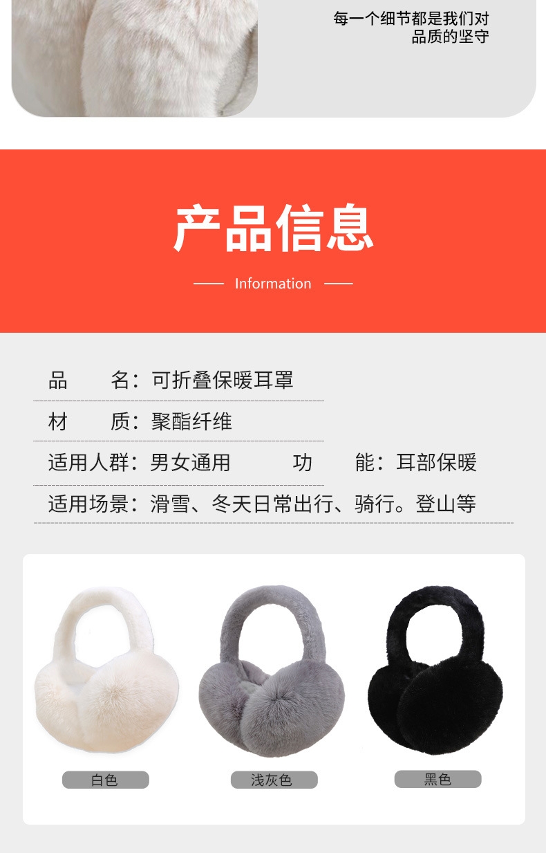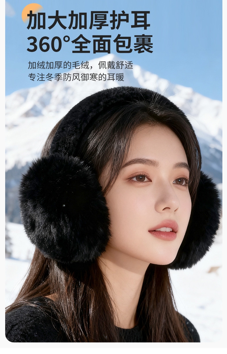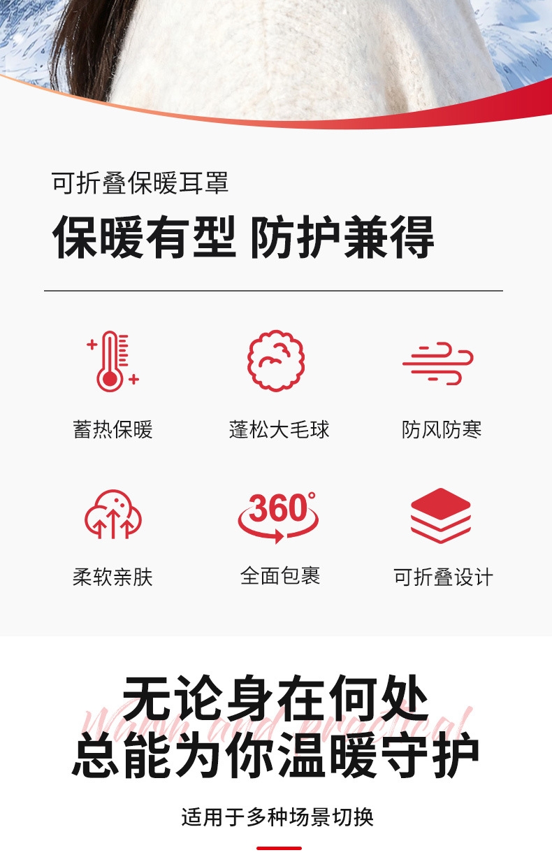 仿兔毛绒,柔软亲肤 加大设计,覆盖范围大,保暖效果;可折叠,方便收纳;耳套可拆卸设计,方便清洗