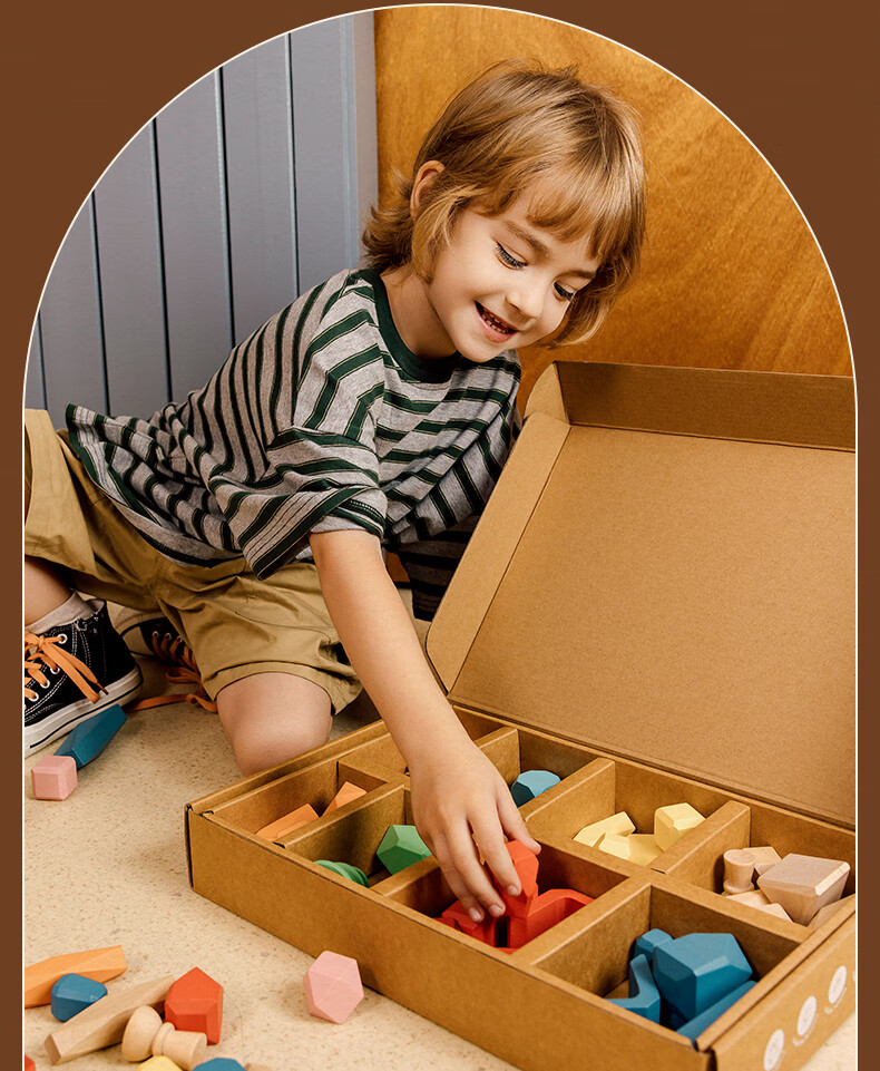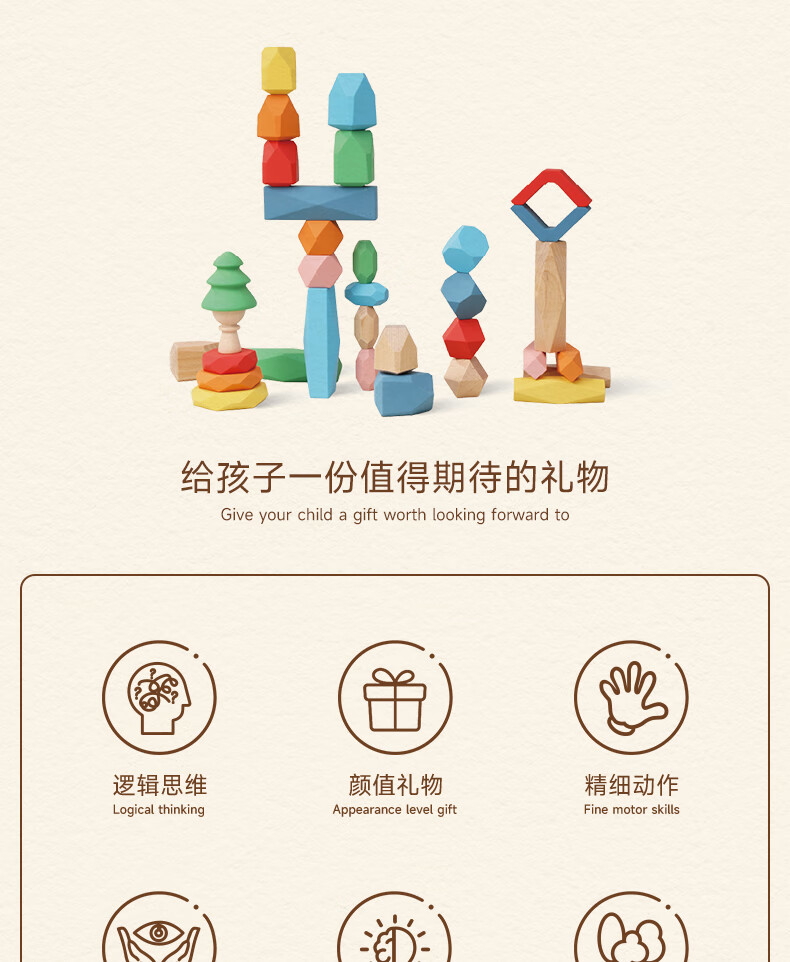 经过精细打磨,表面光滑无倒刺;大颗粒设计,握感舒适,每套包含13种立体造型;环保水性漆层呈现柔和哑光质感,8种色彩鲜艳饱满