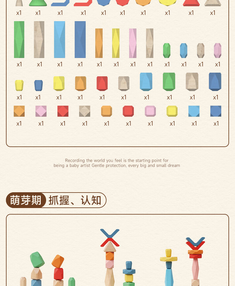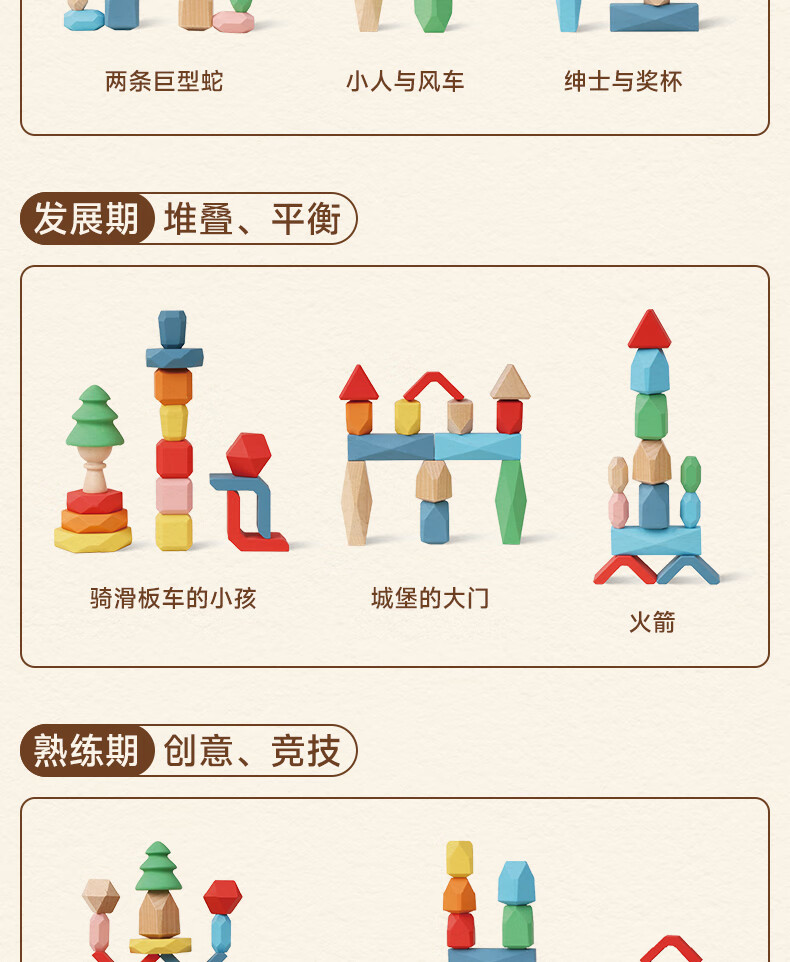 配置清单:产品组成:大号立方体*6、小号立方体*4、小号长方体*2、中号长方体*4、大号长方体*4、大号钻石块*4、中号钻石块*4、小号钻石块*4、三角柱*2、小号八棱柱*2、中号八棱柱*1、大号八棱柱*1、V形模块*2、塔形模块*1、圣杯形模块*1。
