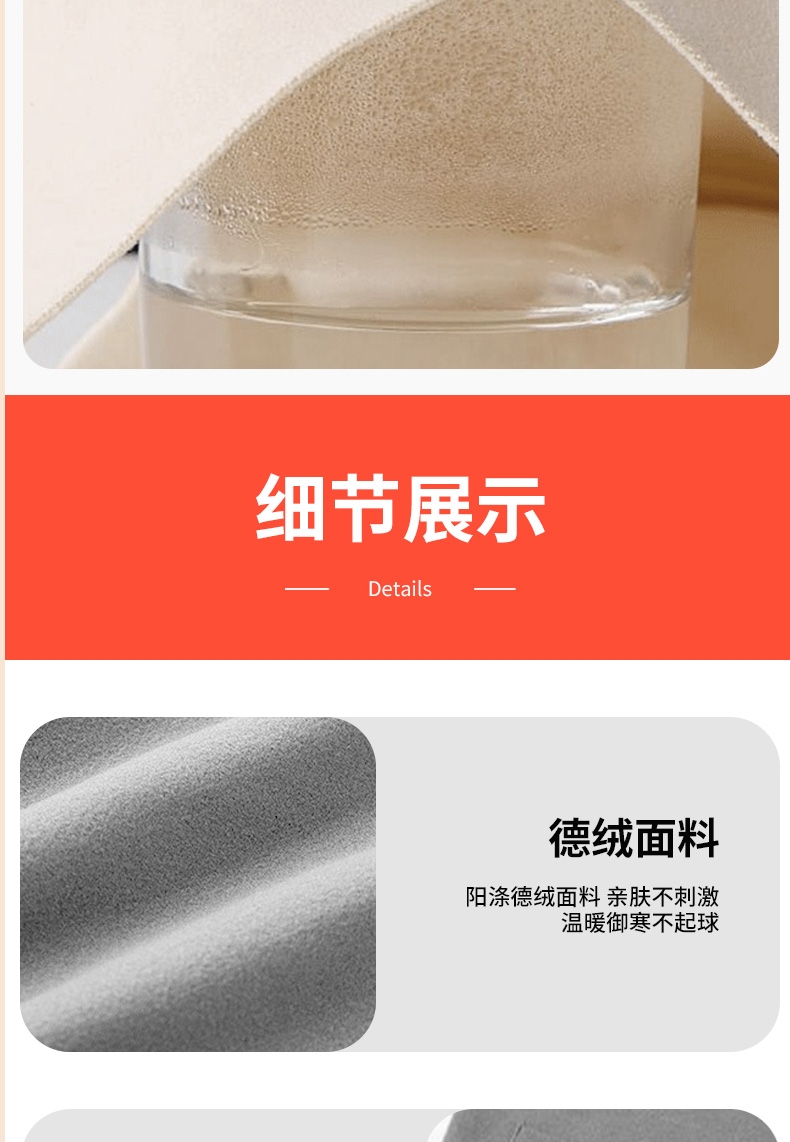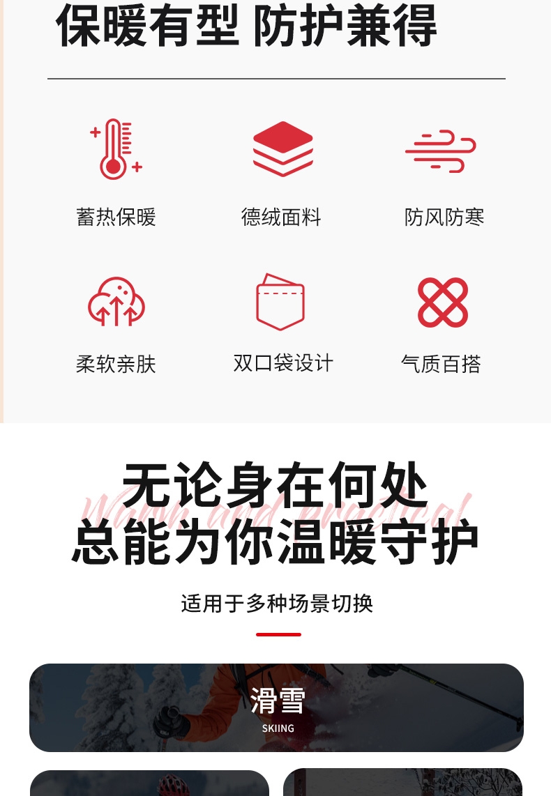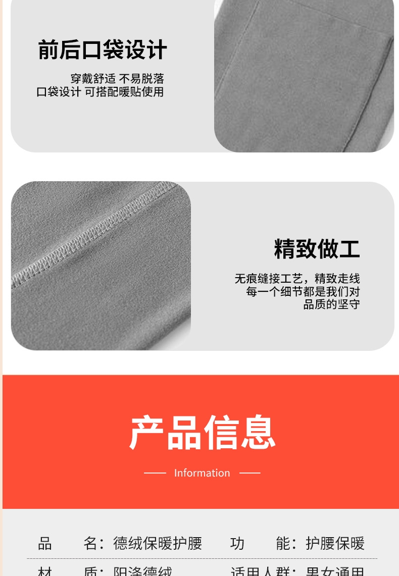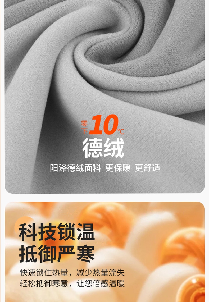 阳离子涤纶德绒面料,亲肤柔软,透气性佳,保暖性强;无痕设计,更加美观 前后部均有口袋设计;可放置暖贴,温暖加倍