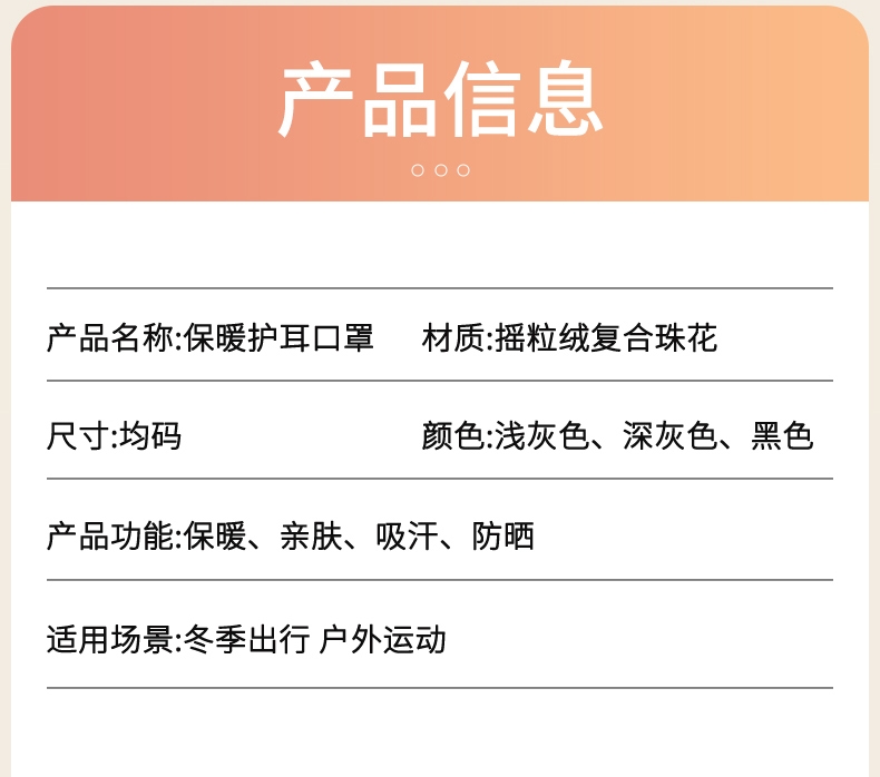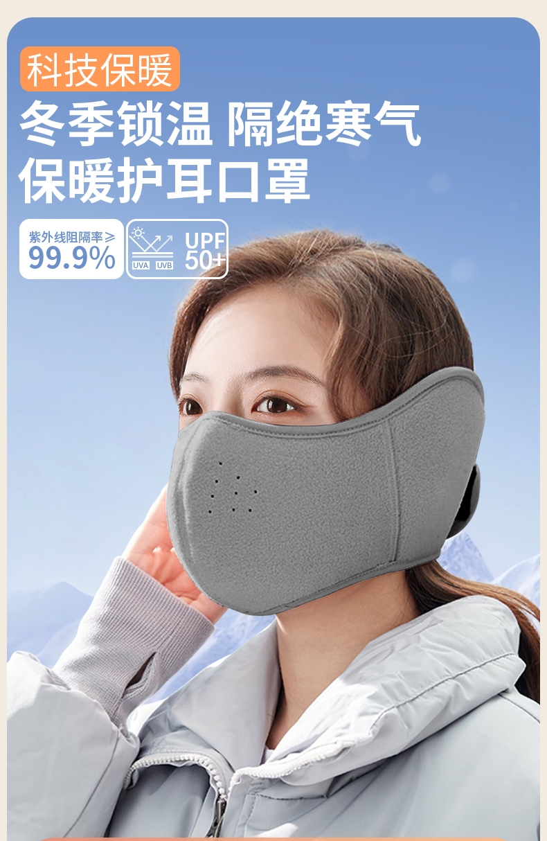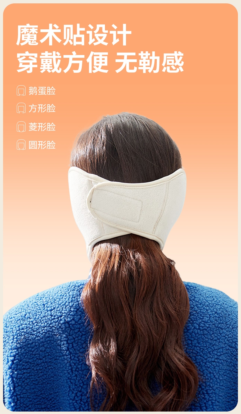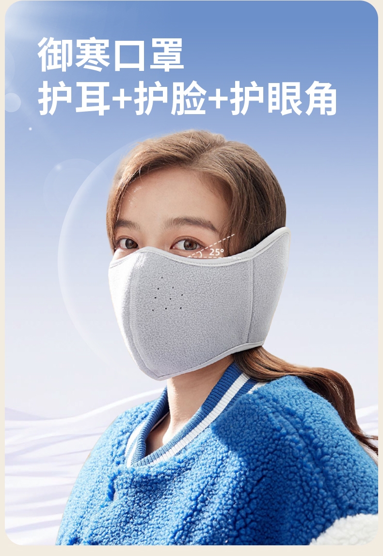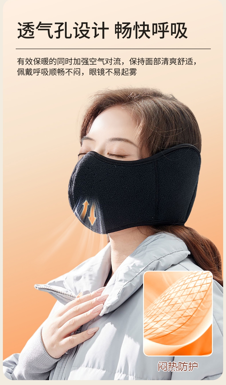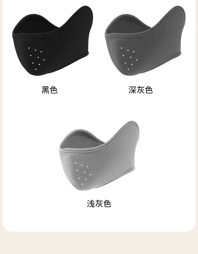 摇粒绒面料,亲肤柔软,防风保暖;加大护耳设计,不冻加耳朵 激光透气网孔,呼吸更通畅;背部魔术贴设计,更牢固,不滑落