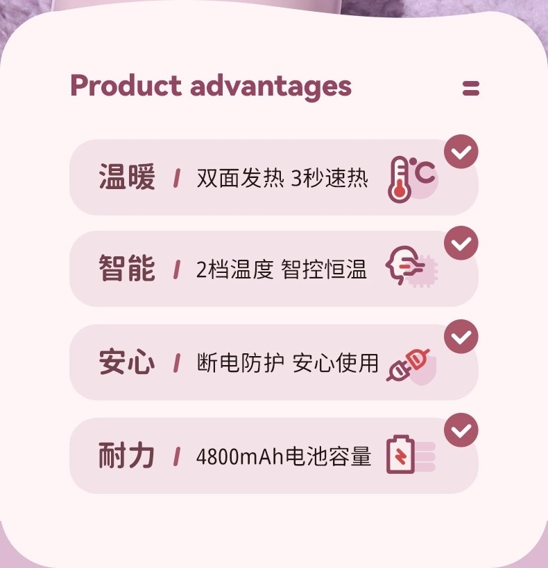双面发热,3秒速热;2档温度,智控恒温;断电防护,使用安全