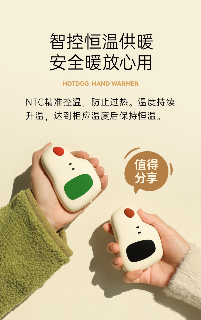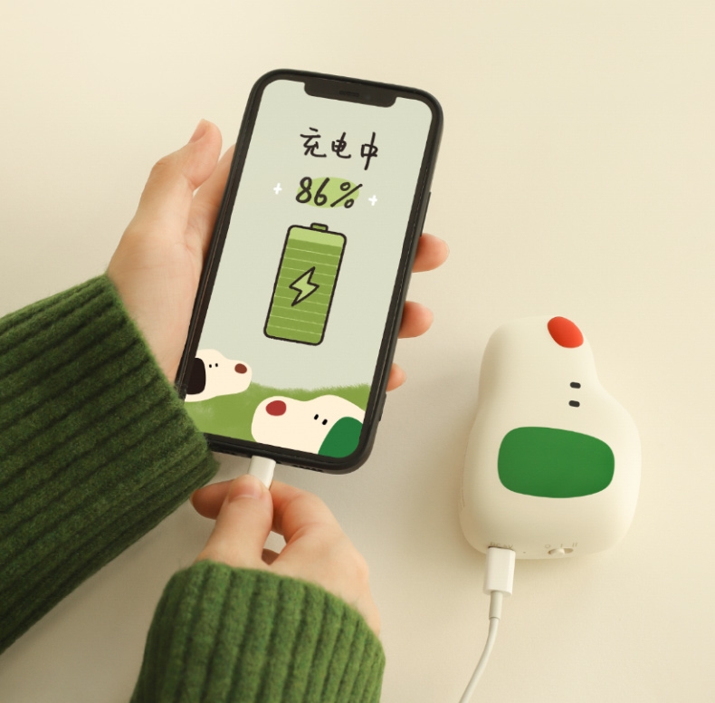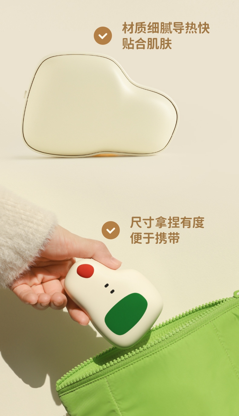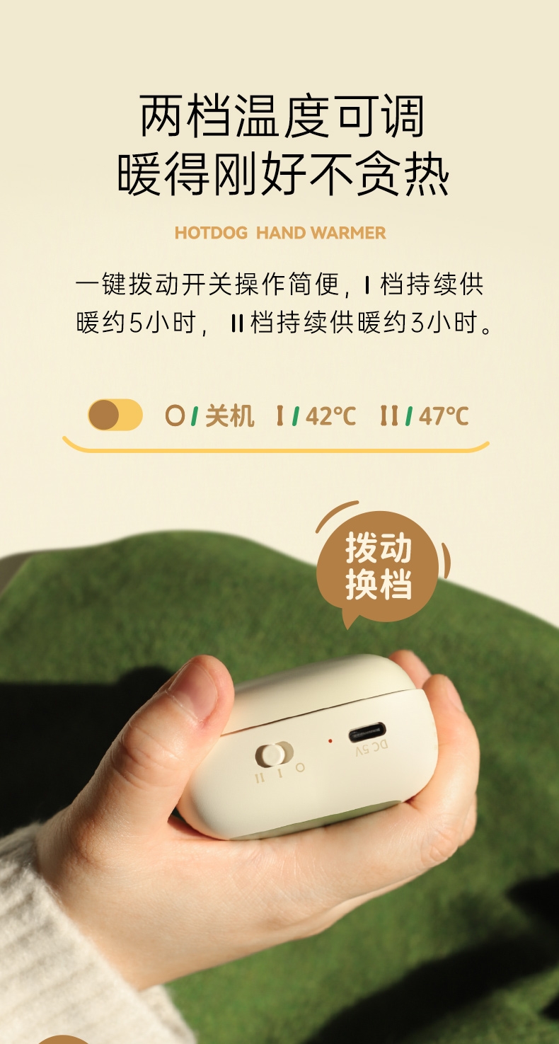 造型握感舒适,均匀高效制热;一键拨动开关,操作简单;暖手宝/充电宝, 双向皆可充电