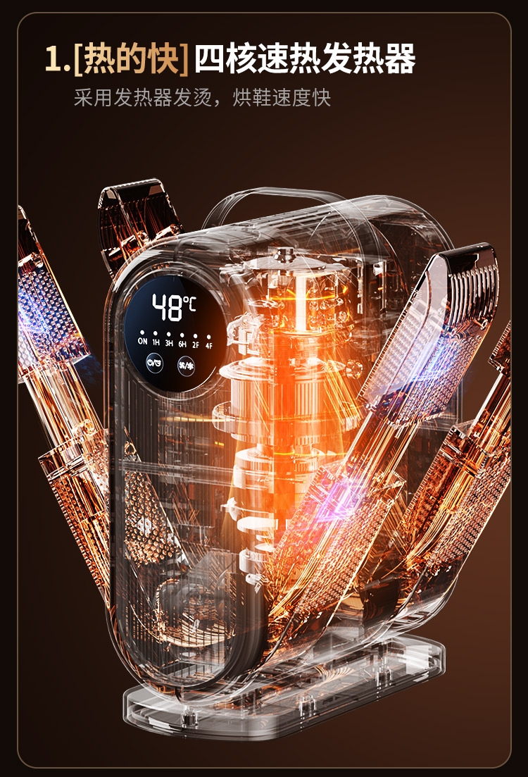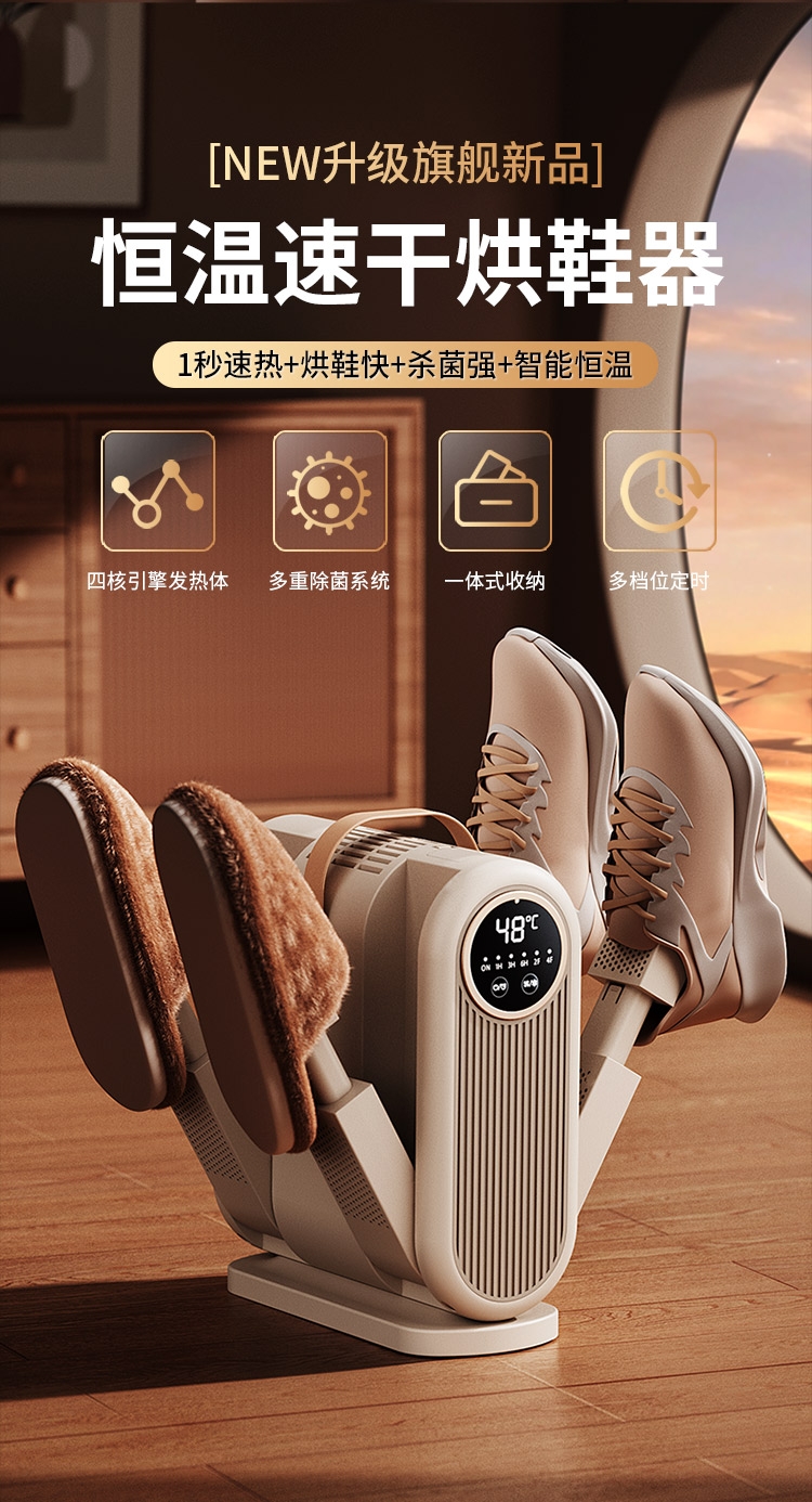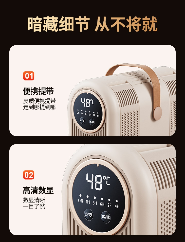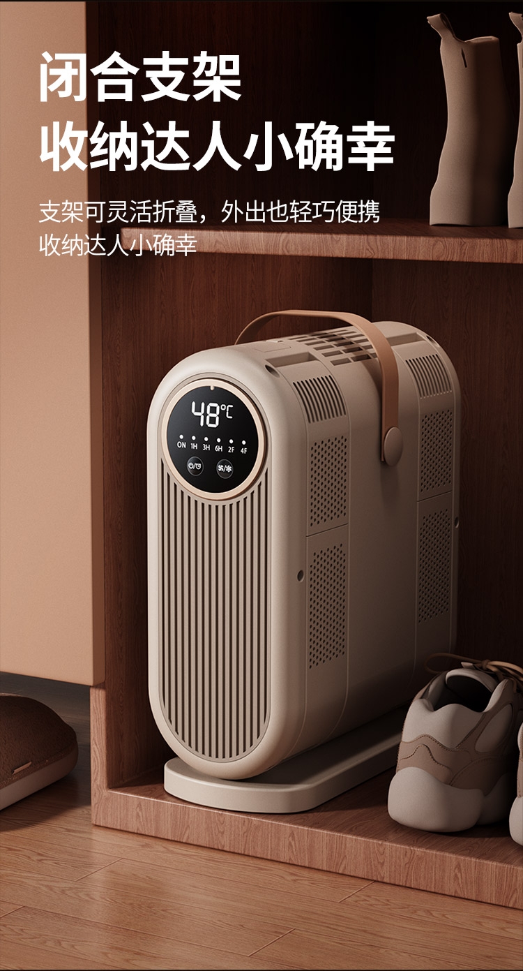 UV 紫外线深度除菌,告别脚气、异味根源;48℃恒温烘鞋皮质 / 织物皆适用烘干同时保护鞋型;香薰祛味留香,0-6 小时自由设定烘干时长;高清数显操控屏,老人小孩也能轻松操作;折叠收纳不占地