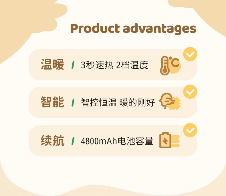 升级高导热元件,3秒速热;NTC精准控温,防止过热;造型圆润,减少日常磕碰