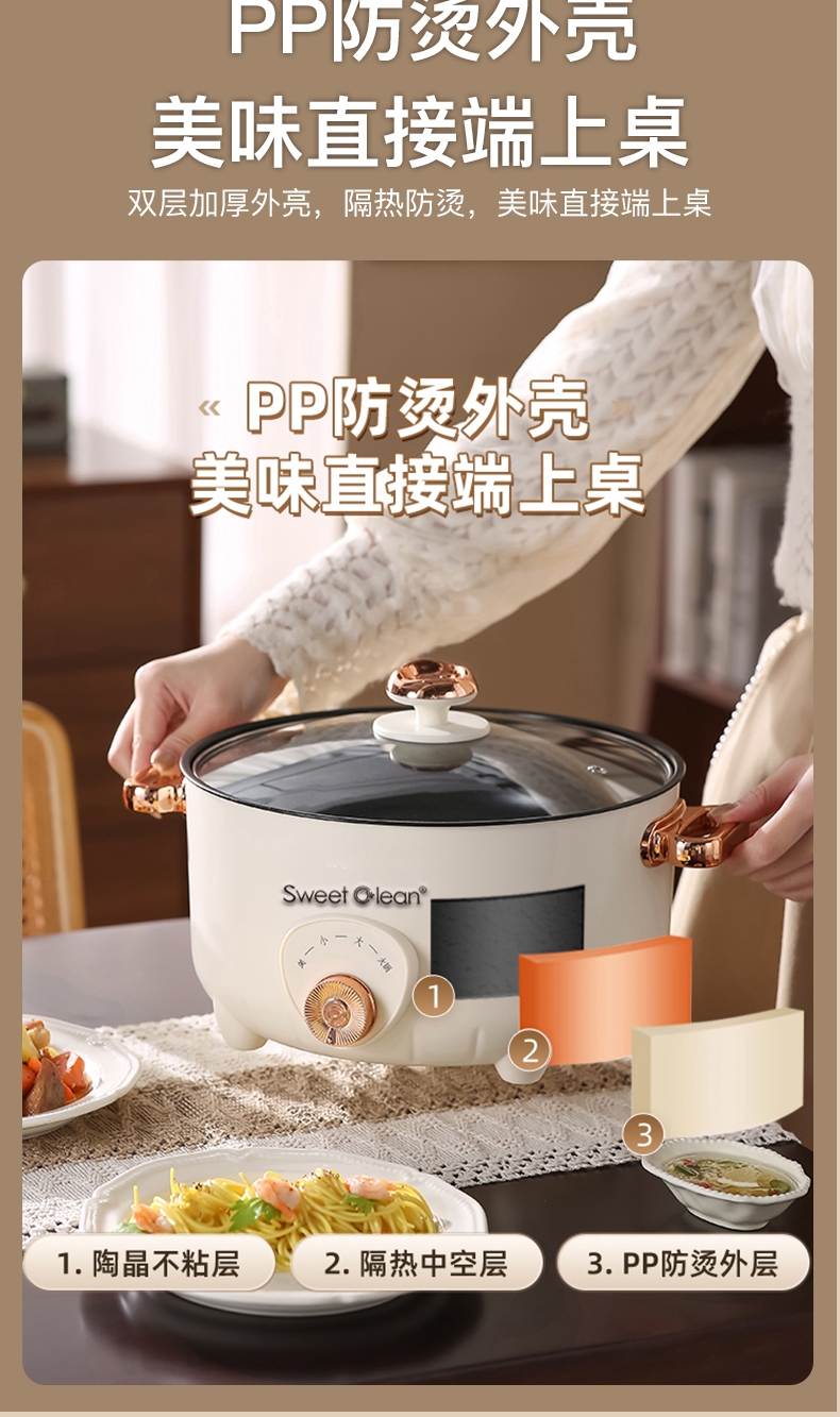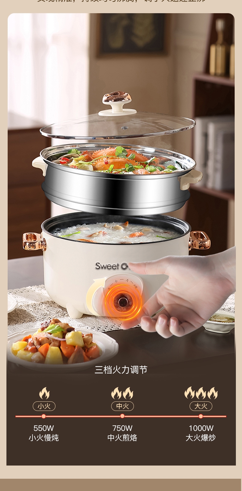 精通蒸/煮/涮的电火锅一锅多用美食享不停;一锅同出两种美食,上蒸下煮方便快捷;不粘锅体熬煮不糊,自动保温美味随时回温;玻璃锅盖,人性化透视化随时可观察食物状态;旋钮一键旋钮选择火力大小可调控操作简单