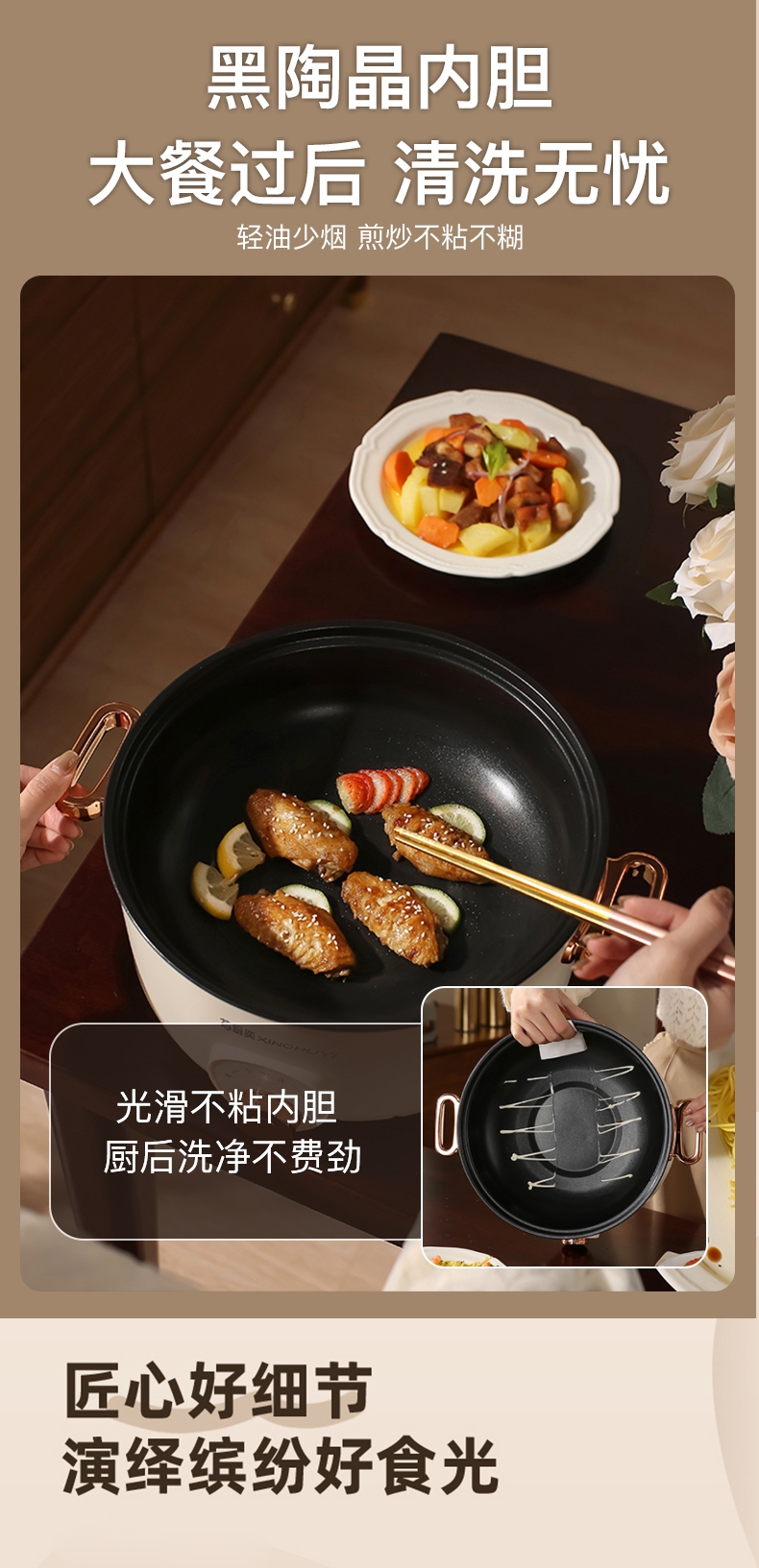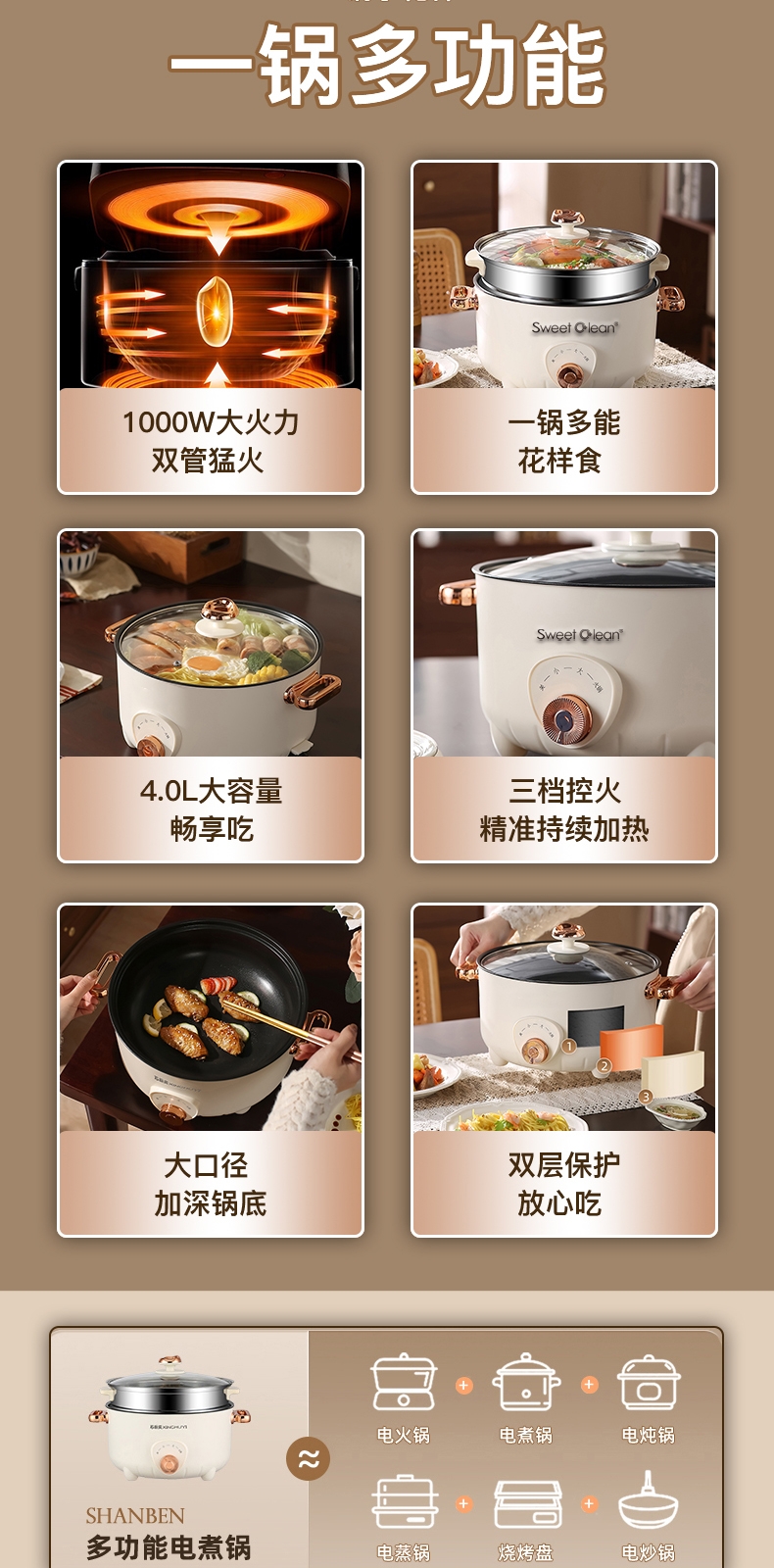 电热火锅功能:火锅,焖,炖,煮,煎,炸,炒,蒸