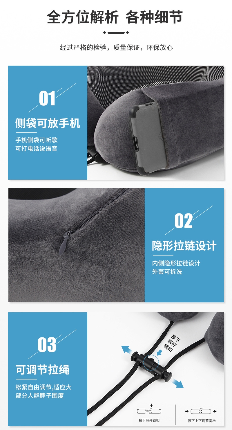 记忆棉U型枕:尺寸26*22*13cm,枕套材质凉感长丝+空气层,枕芯材质记忆棉,记忆U型护颈,长途出行更轻松,布艺收纳盒,一只手机的大小,轻量出行,空气层面料,亲肤透气,凉感更舒适