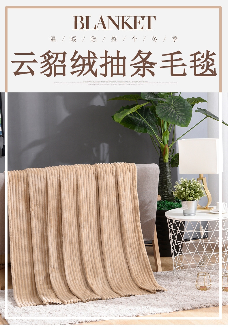 云貂绒抽条午睡毯:材质120D细丝云貂绒,尺寸100*150cm,颜色白灰蓝酒红,净重195g,表面覆盖了超柔软的云貂绒绒毛,编织紧密,手感柔顺机洗不掉毛,采用活性印染工艺,更亲肤贴身,卷边工艺,有效固定毛毯边缘,细节满满