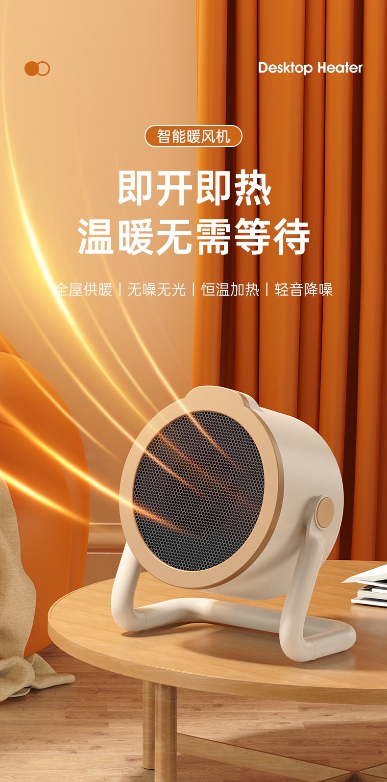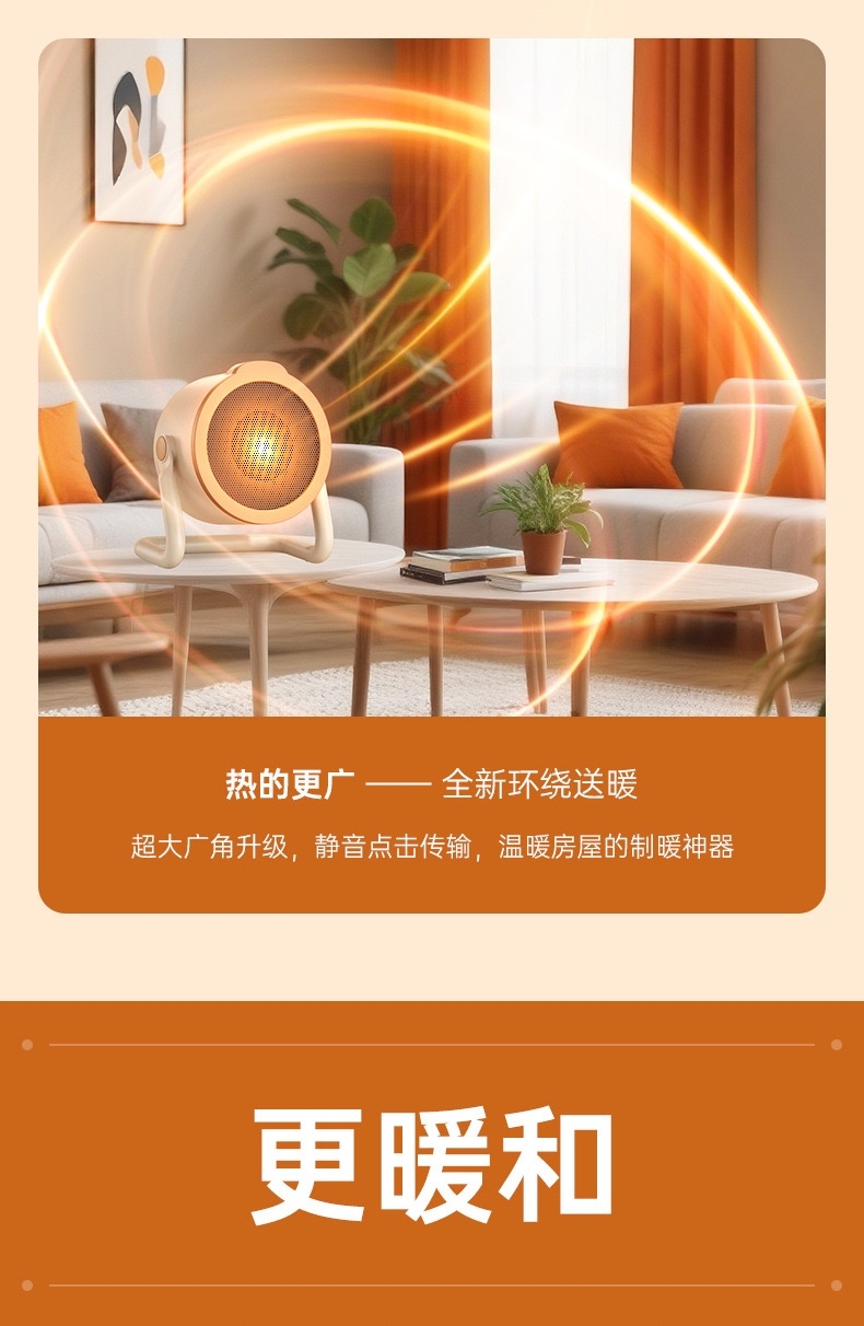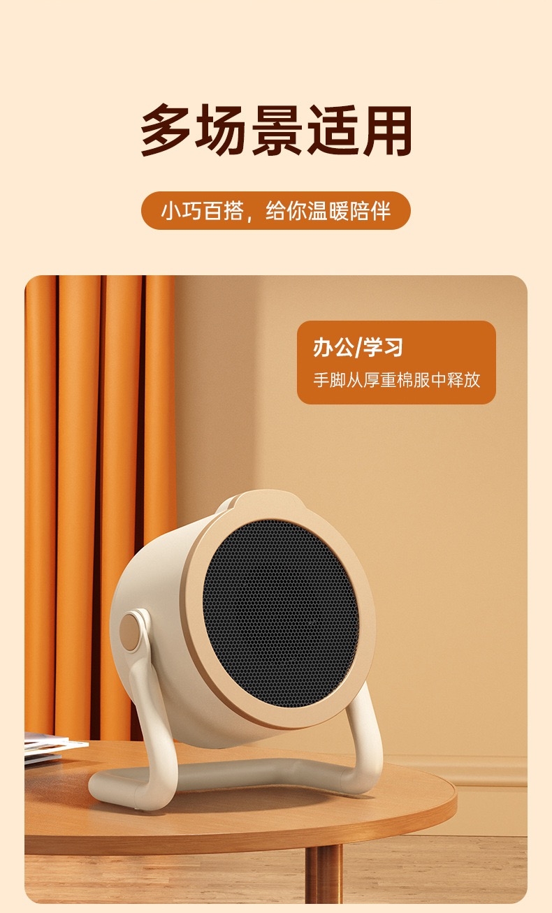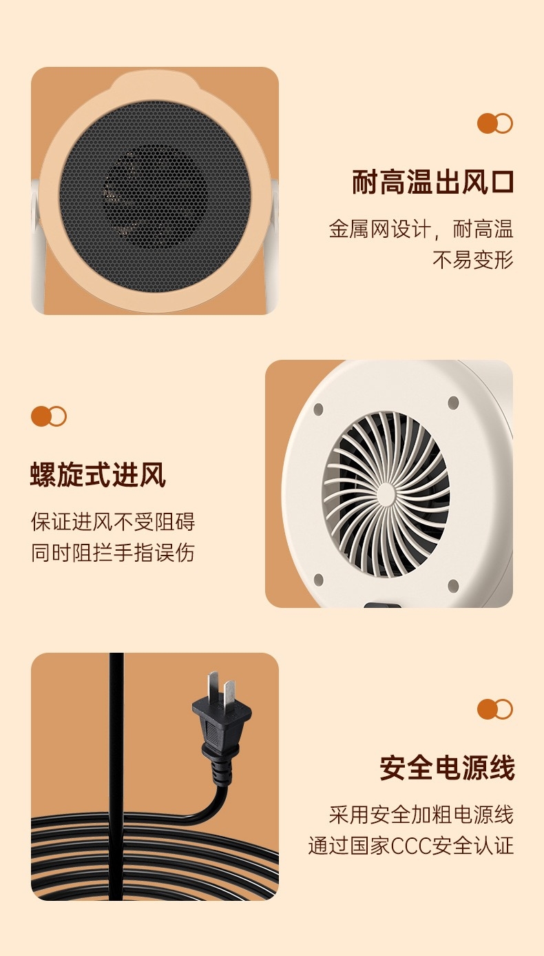 快速发热无噪静音广角送风节能省电;耐高温金属边框温度过高自动断电安全守护;两档风扇选择温暖无需等待