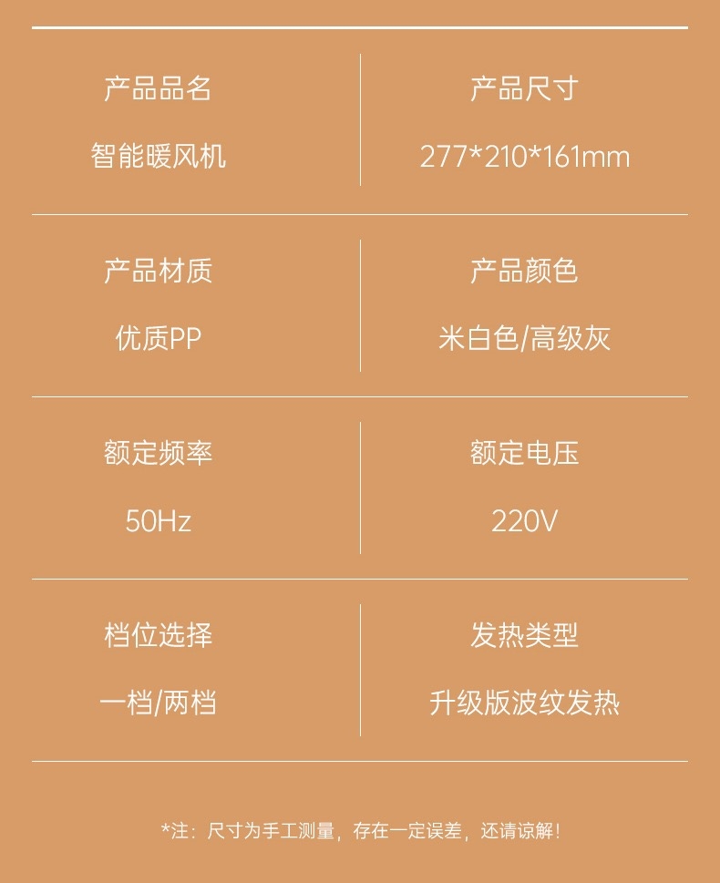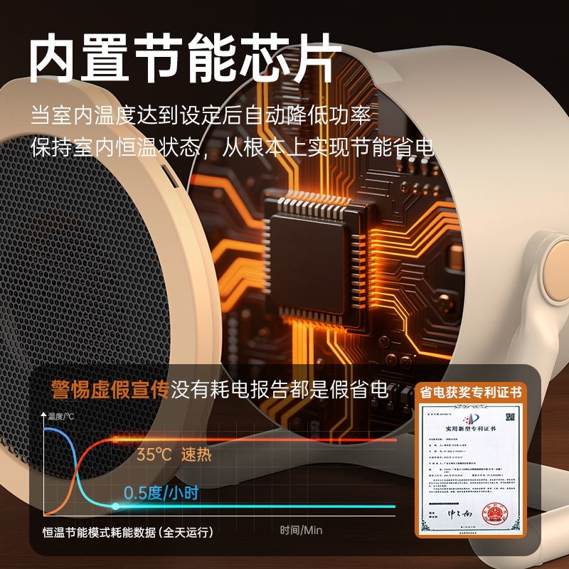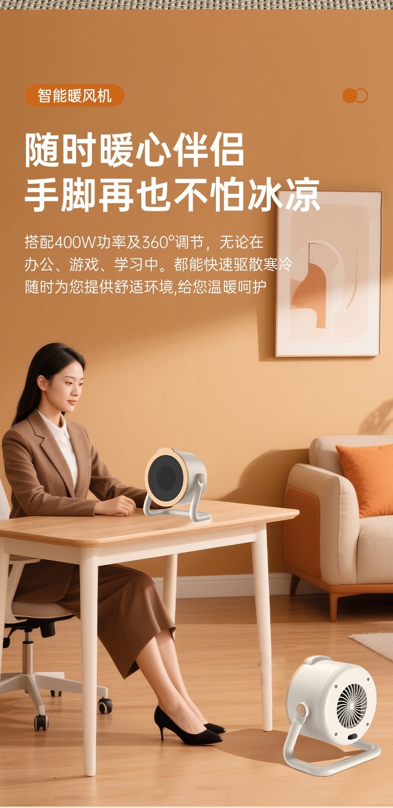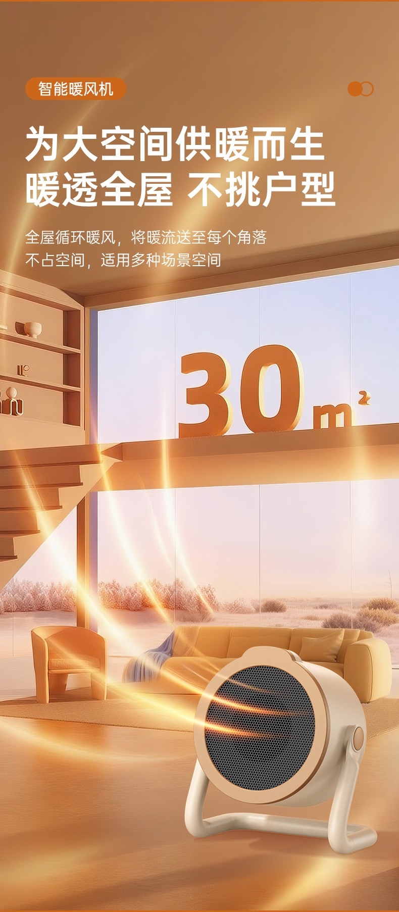 快速发热无噪静音广角送风节能省电;耐高温金属边框温度过高自动断电安全守护;两档风扇选择温暖无需等待