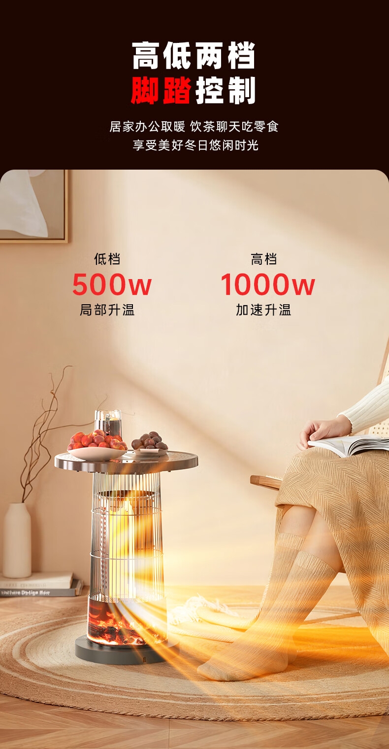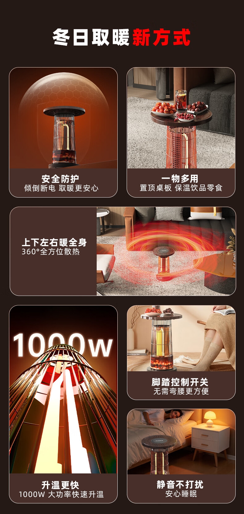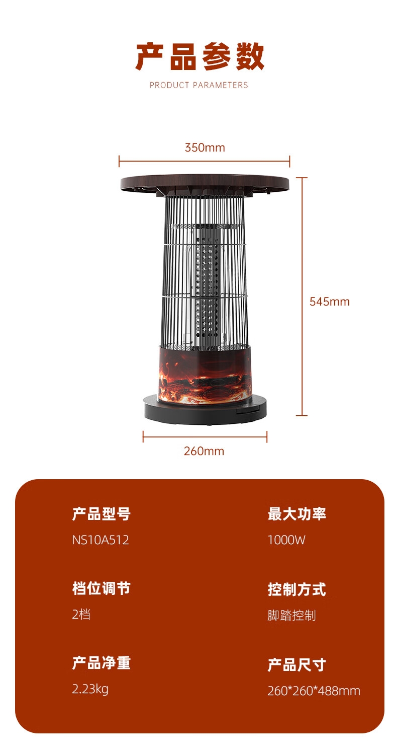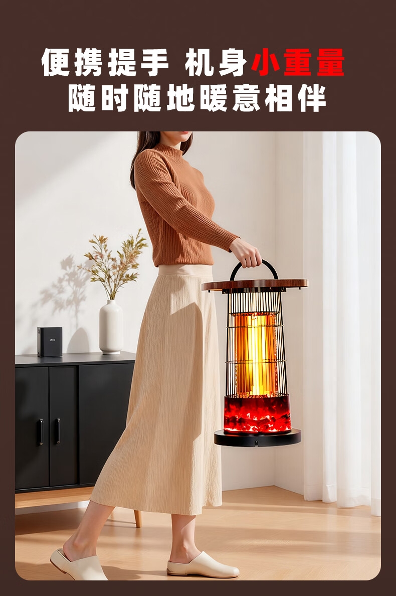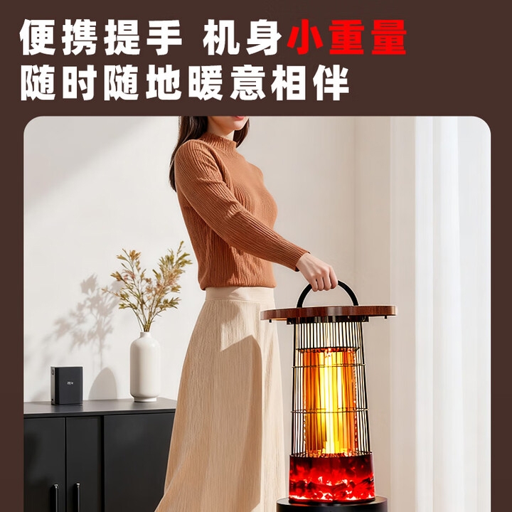 仿红木酸枝纹桌板仿真炭火跳跃特效,视觉感受冬日温暖;便携提手,机身小重量,随时随地暖意相伴;脚踏控制开关,无需弯腰更方便;上下左右暖全身,360度全方位散热;便携提手,机身小重量,随时随地暖意相伴