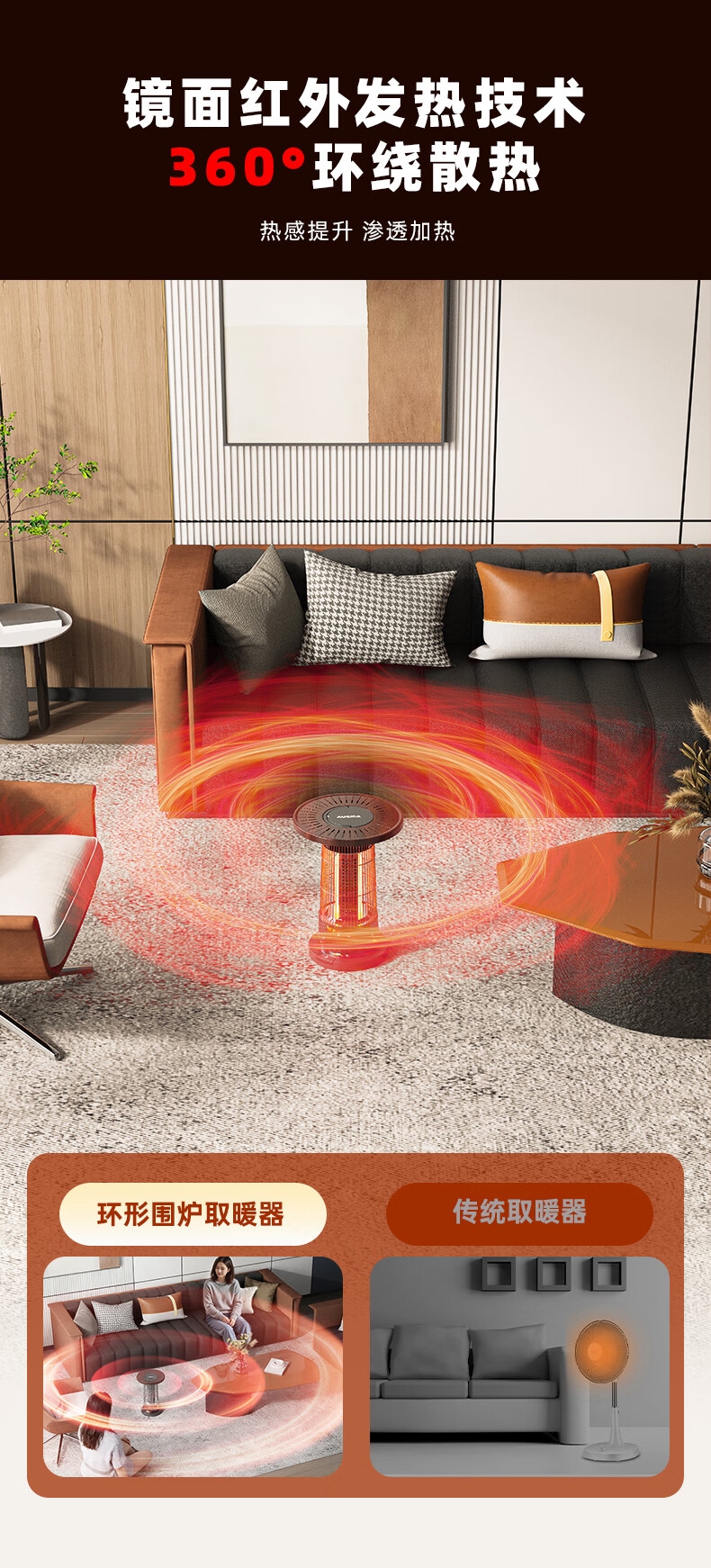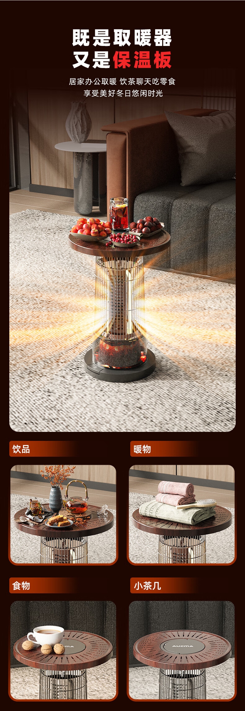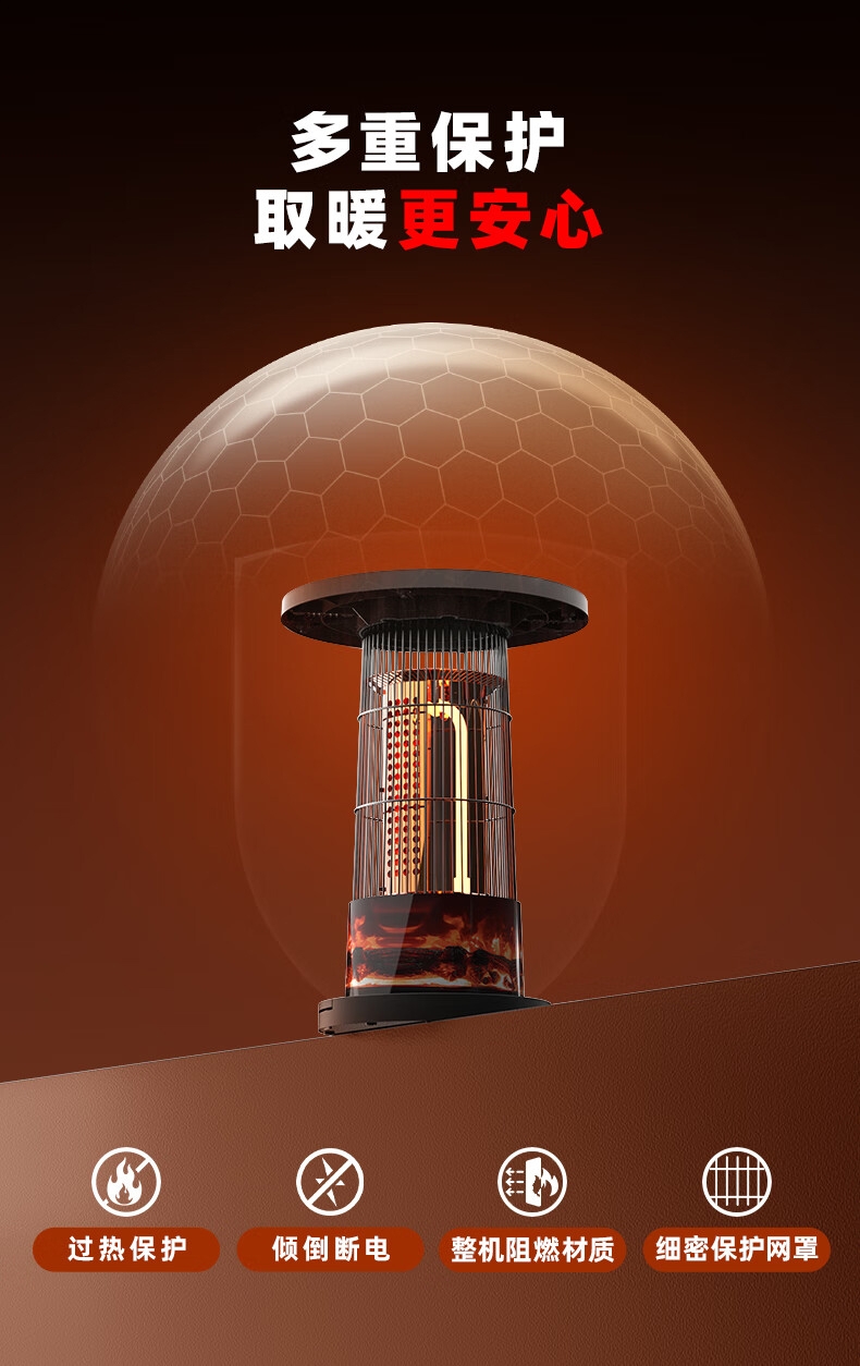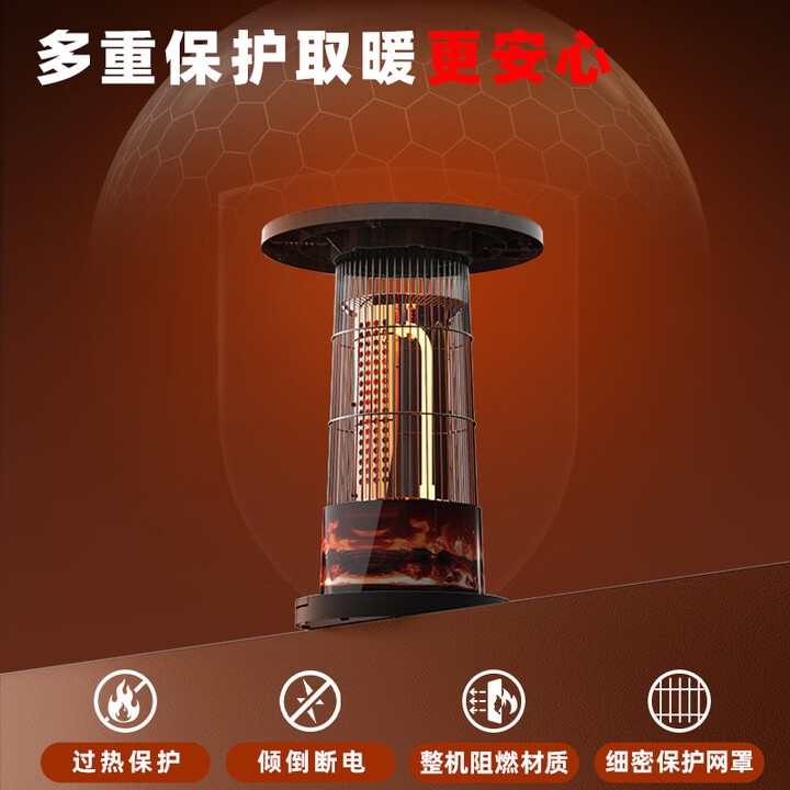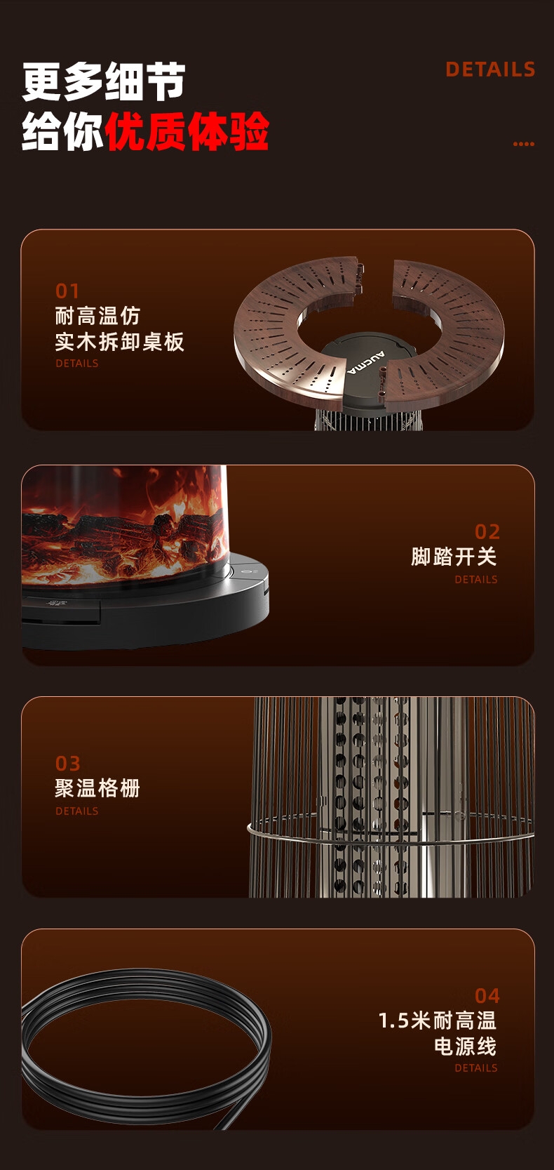 仿红木酸枝纹桌板仿真炭火跳跃特效,视觉感受冬日温暖;便携提手,机身小重量,随时随地暖意相伴;脚踏控制开关,无需弯腰更方便;上下左右暖全身,360度全方位散热;便携提手,机身小重量,随时随地暖意相伴
