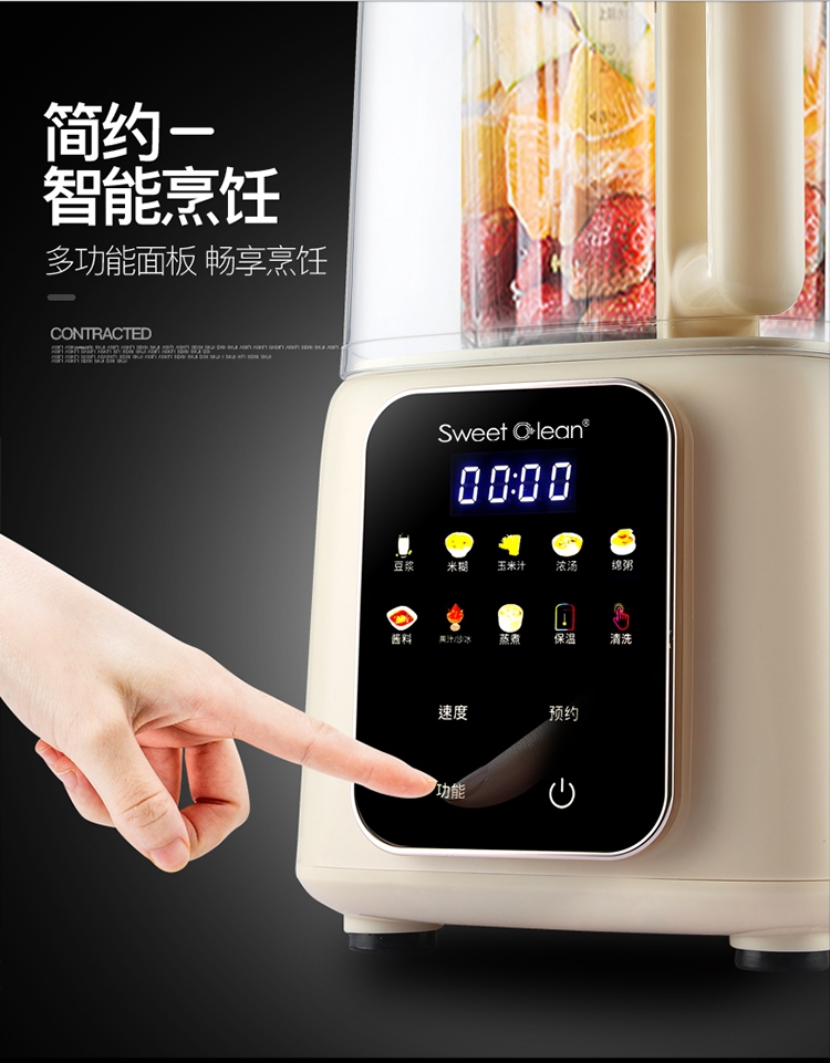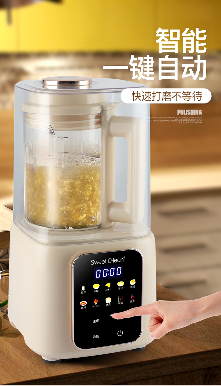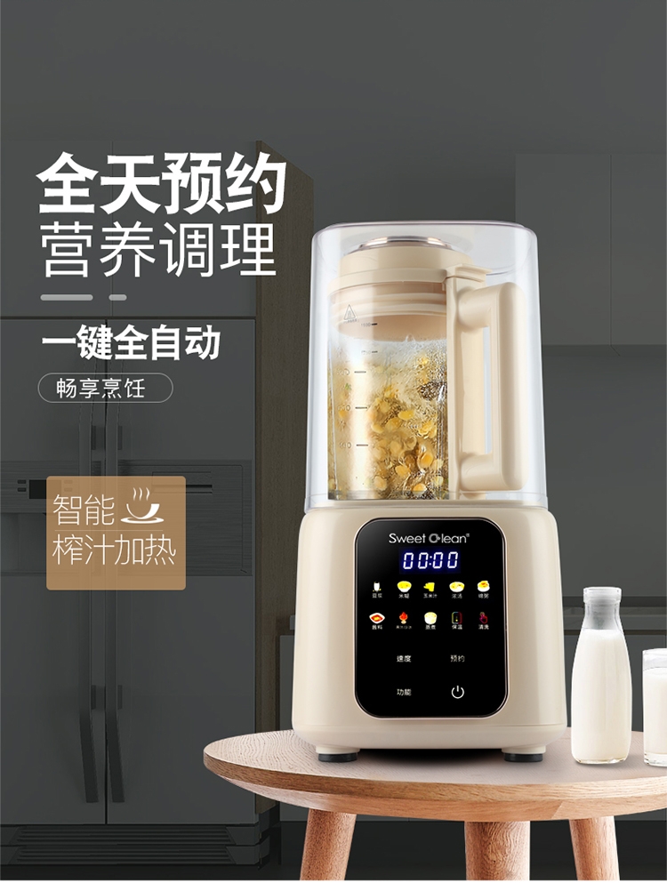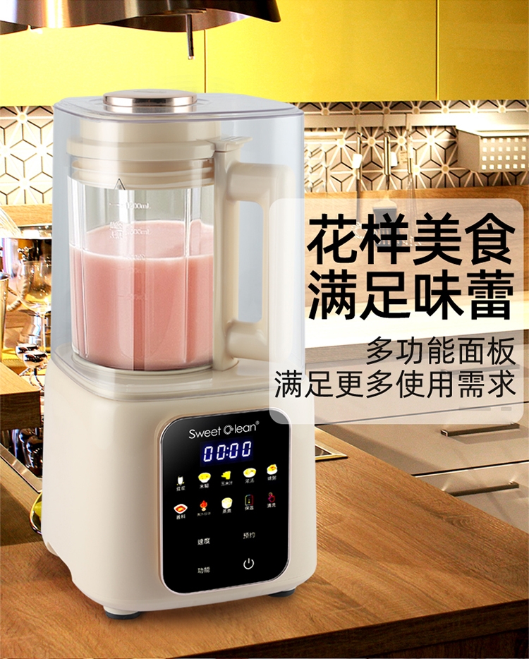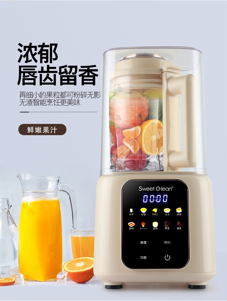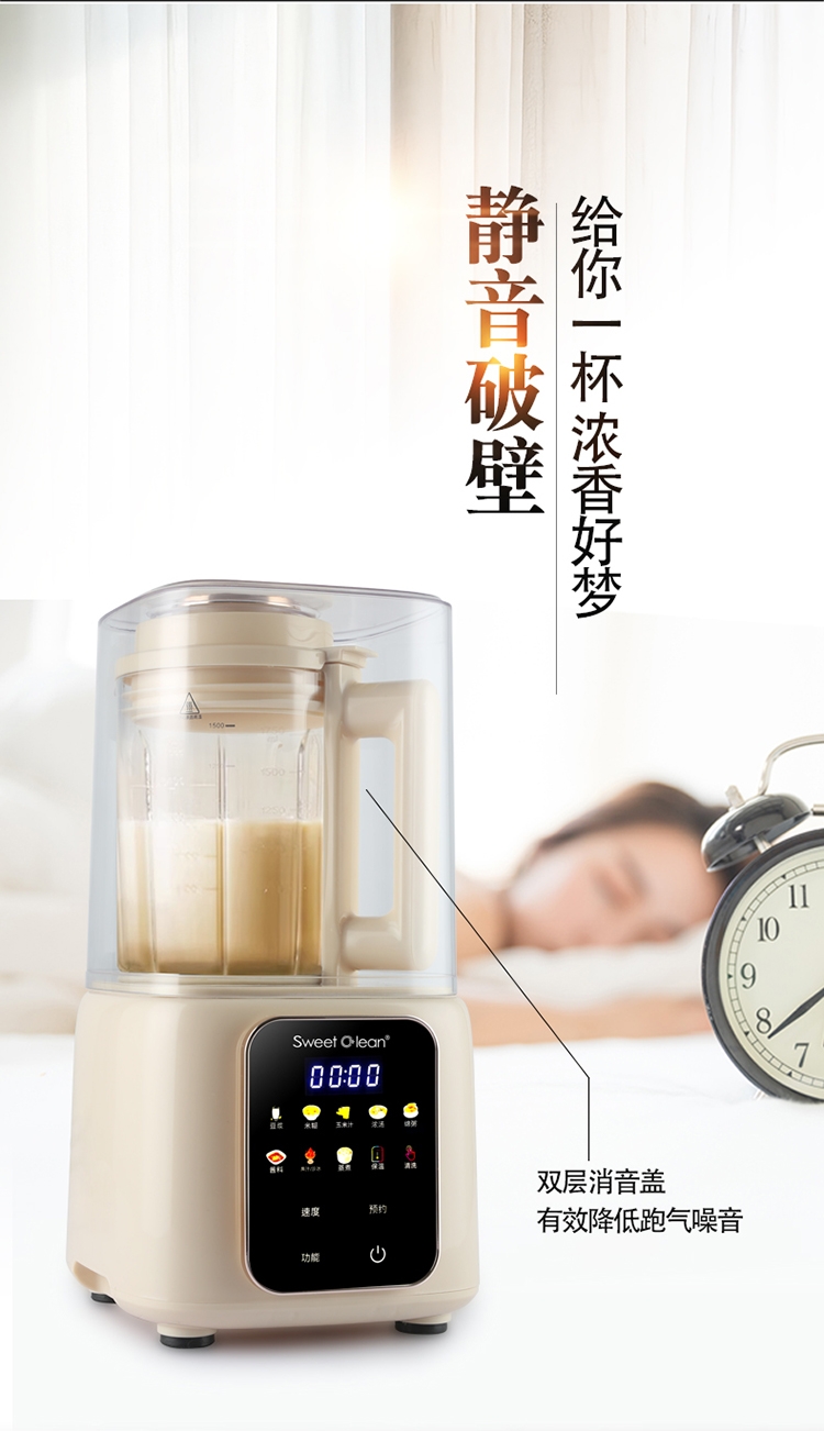 双层消音盖,有效降低跑气噪音;多功能面板,智能一健全自动;微电脑智能加热,360°环形加热底盘;久煮沸腾不糊底,食品接触不锈钢 高速打磨 细腻无渣