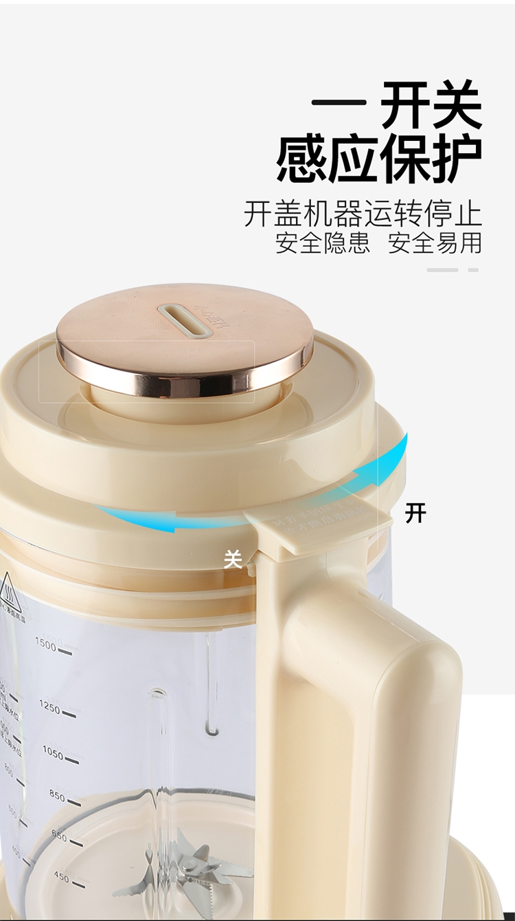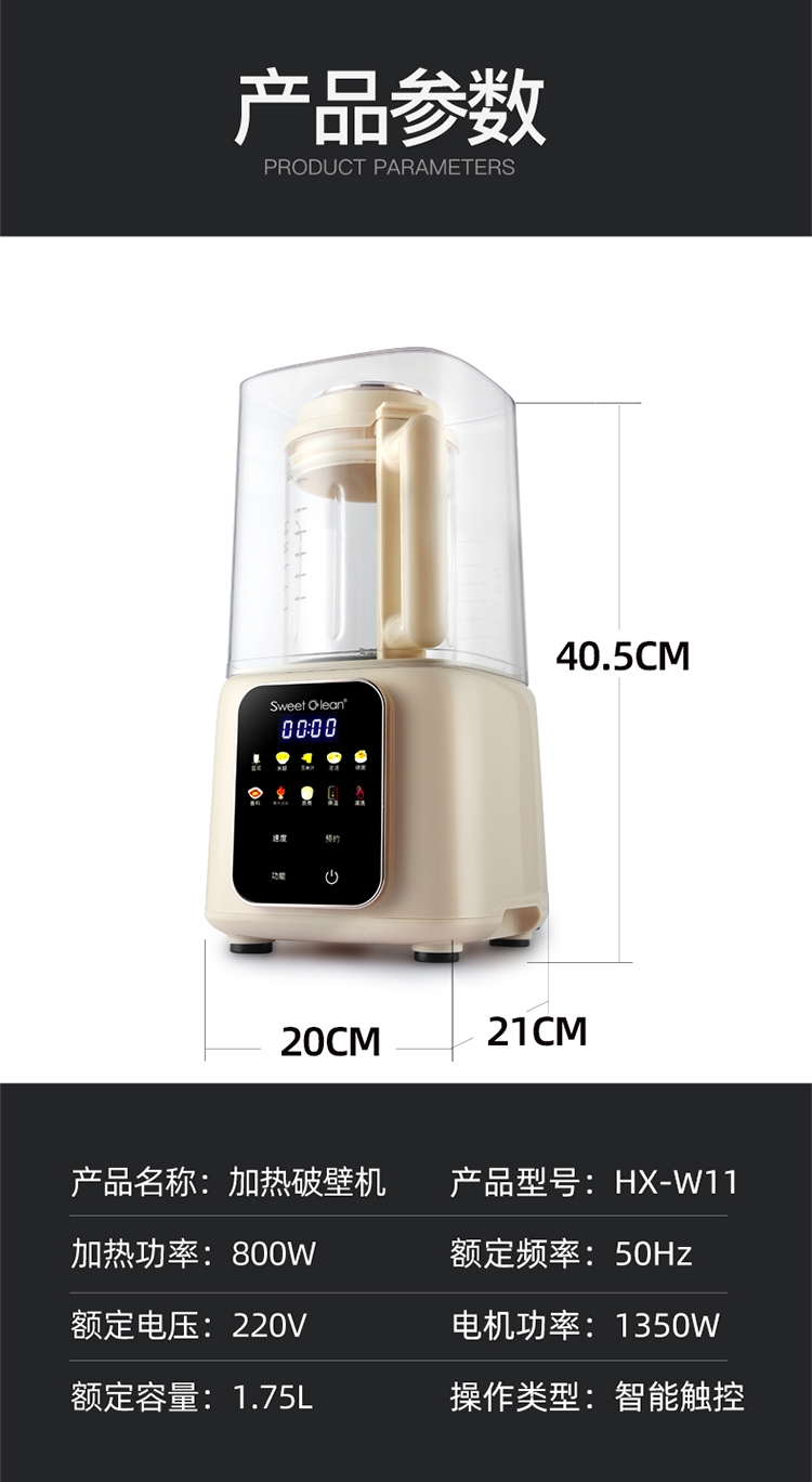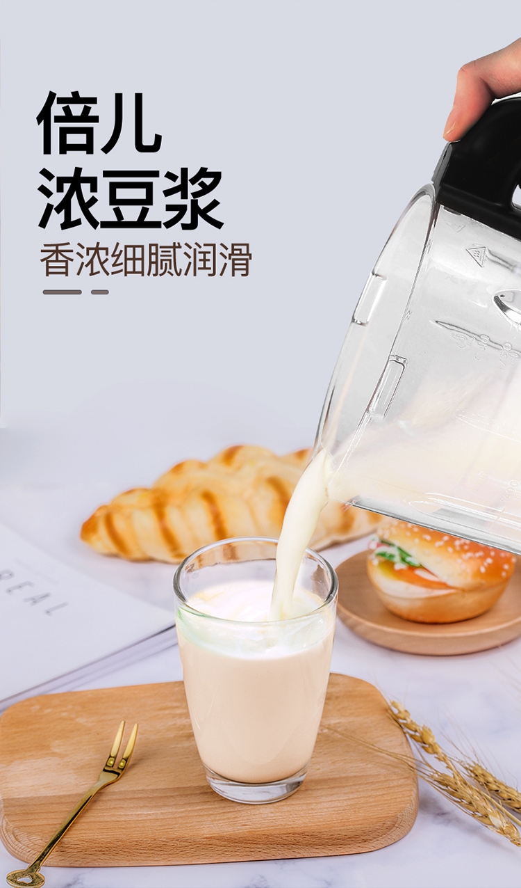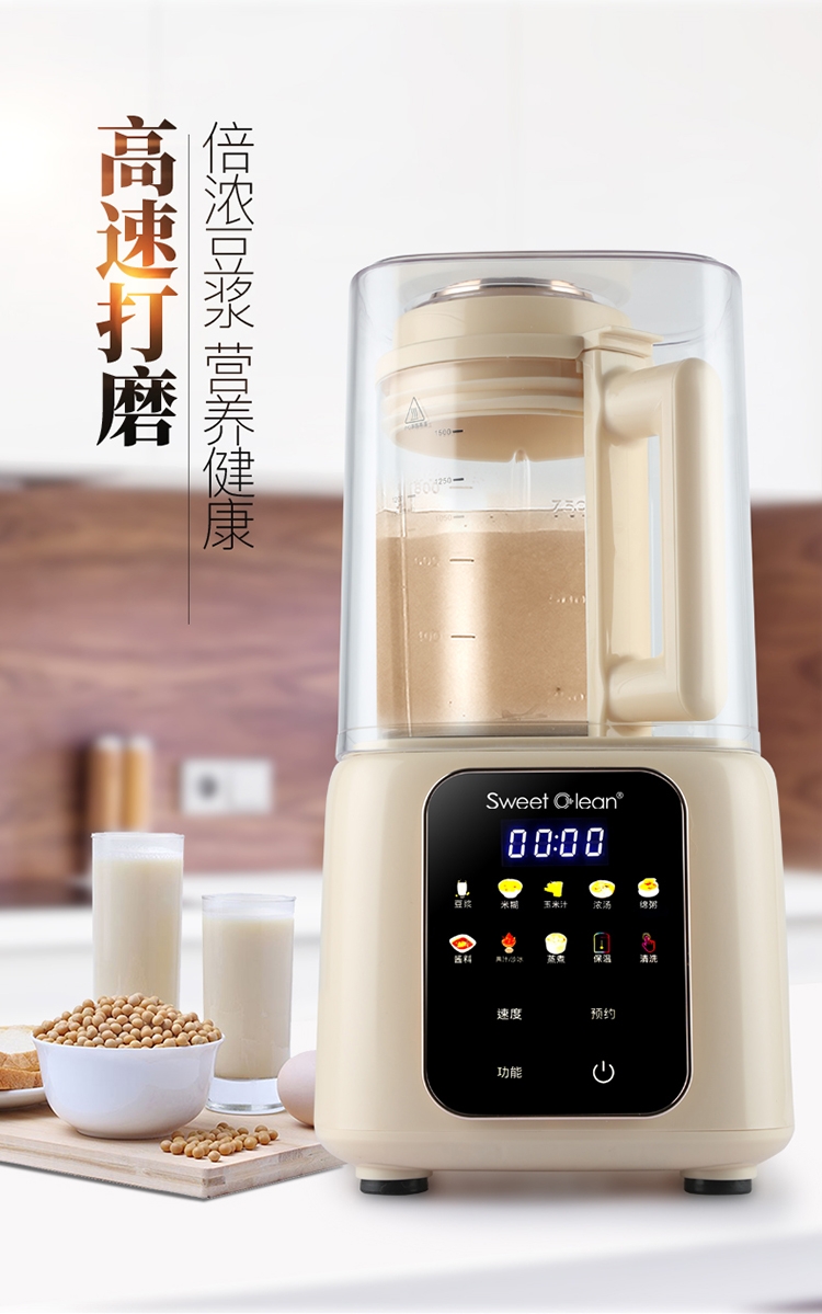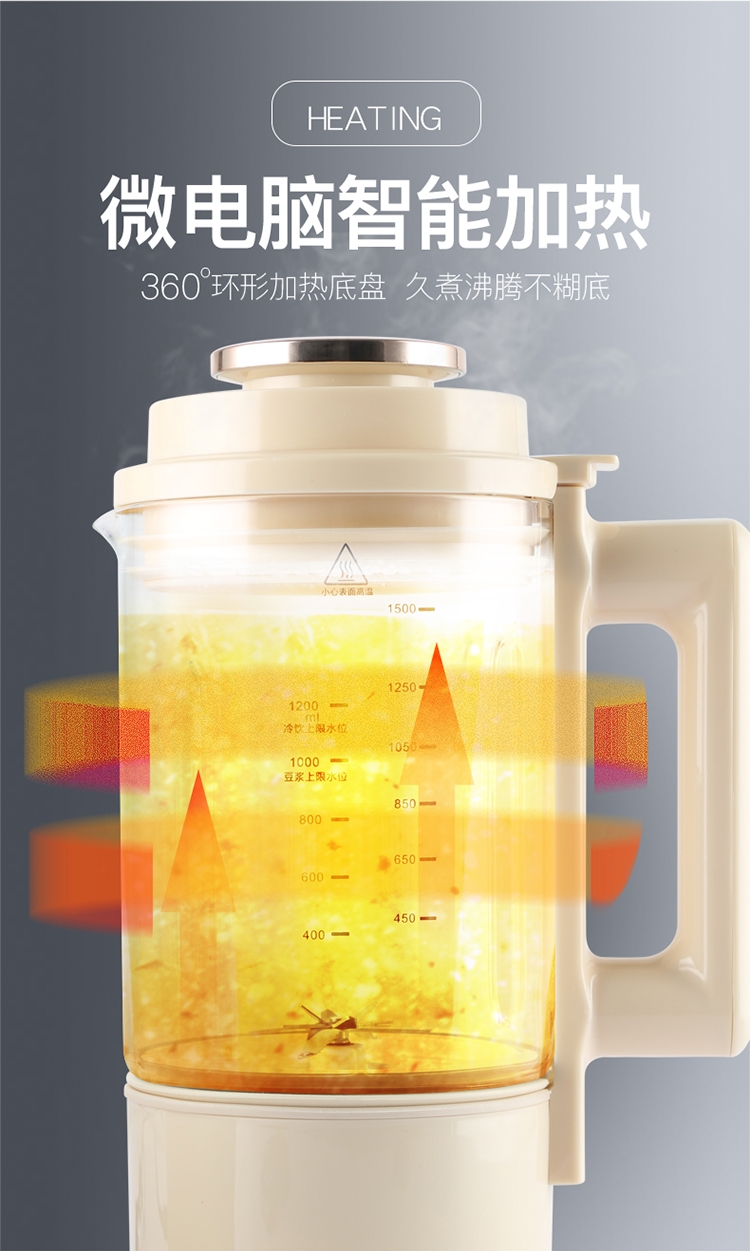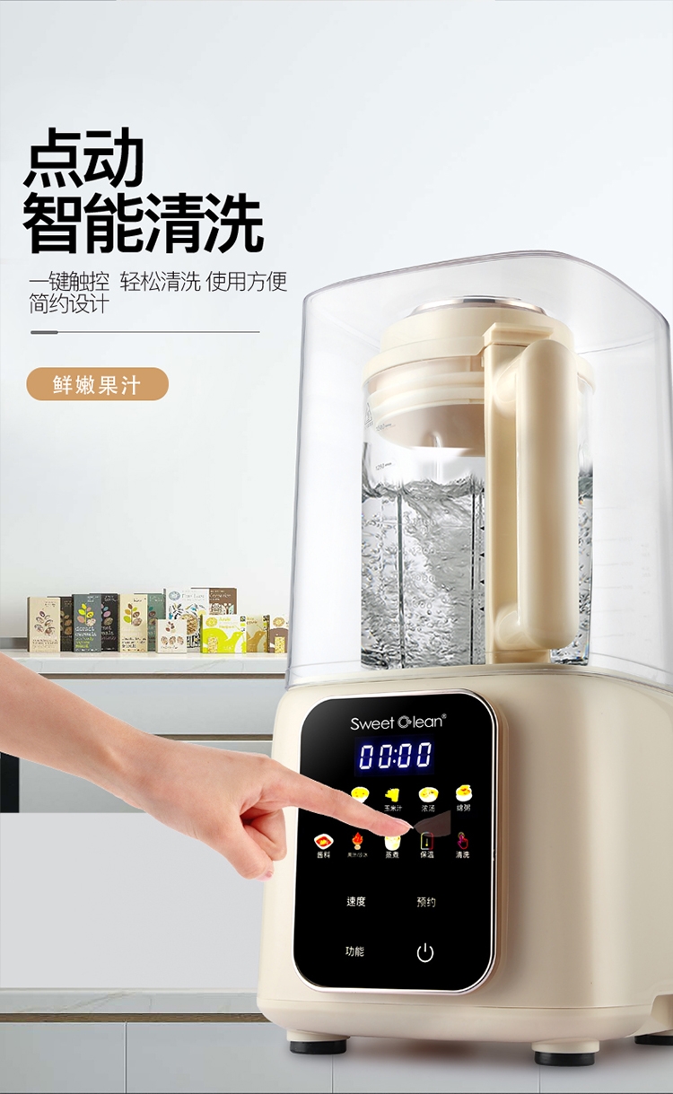 双层消音盖,有效降低跑气噪音;多功能面板,智能一健全自动;微电脑智能加热,360°环形加热底盘;久煮沸腾不糊底,食品接触不锈钢 高速打磨 细腻无渣