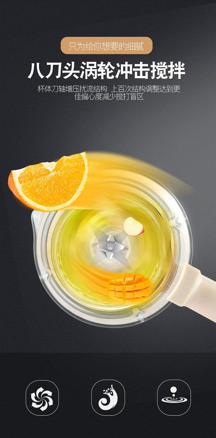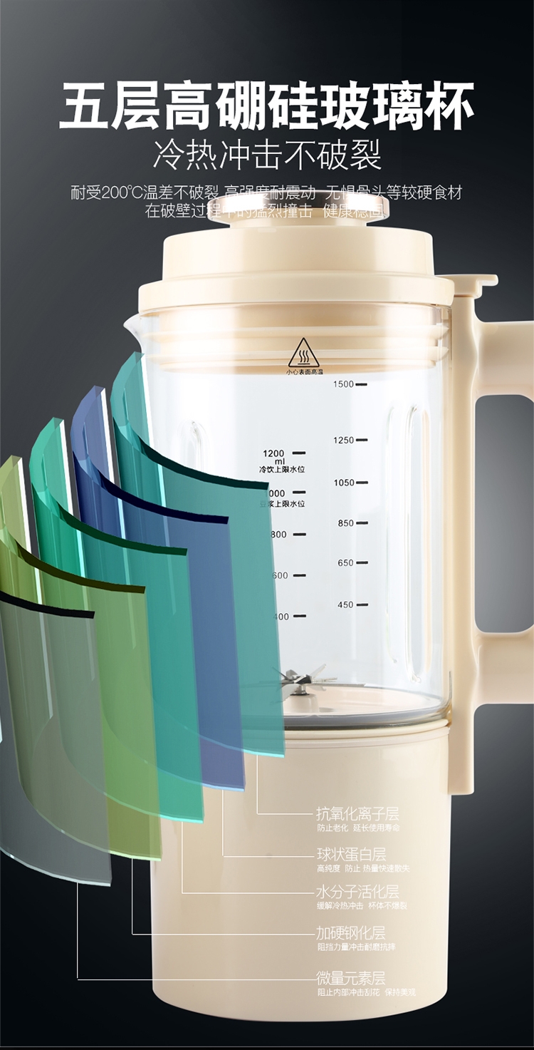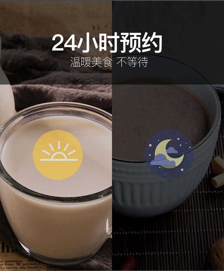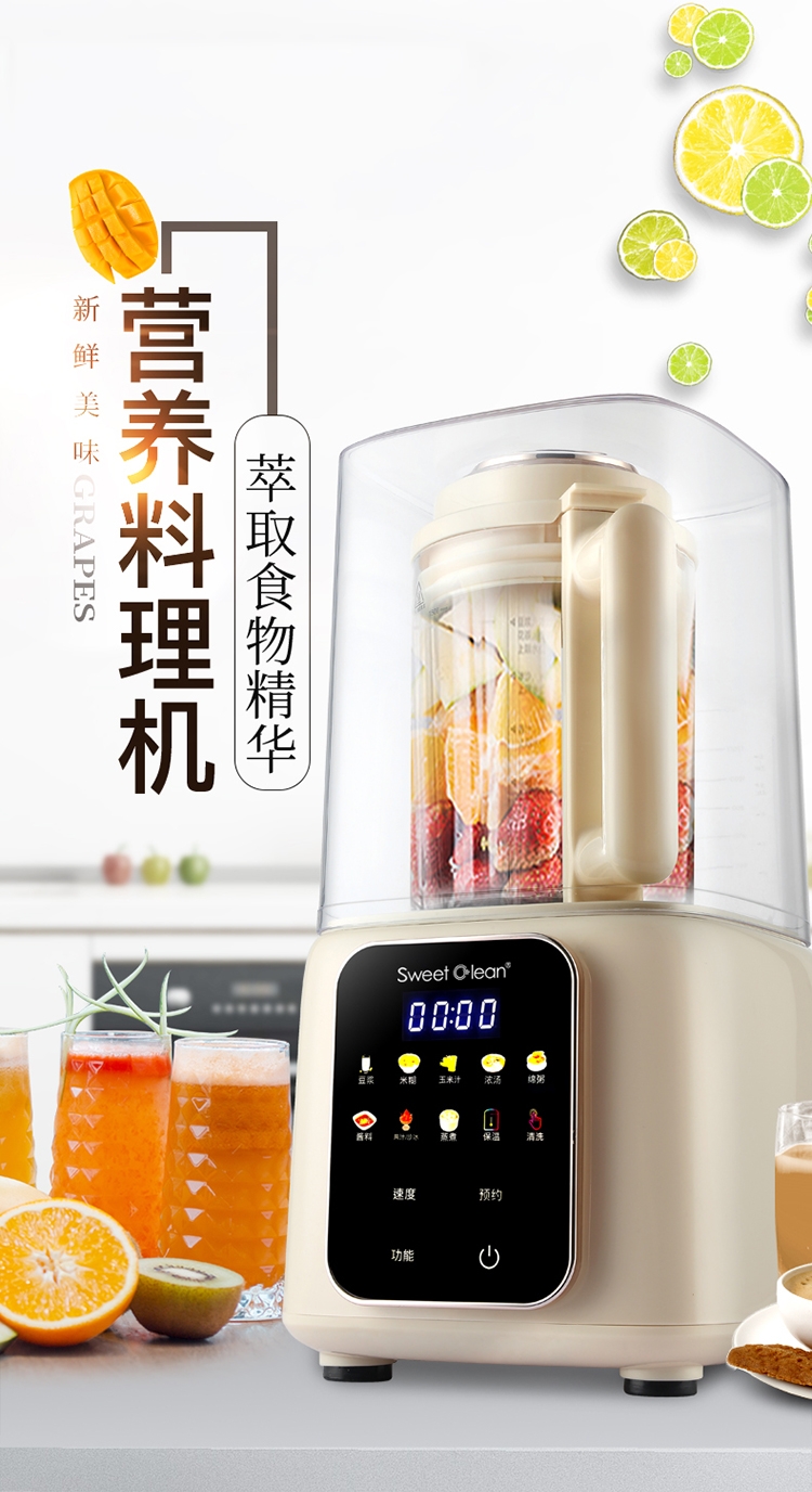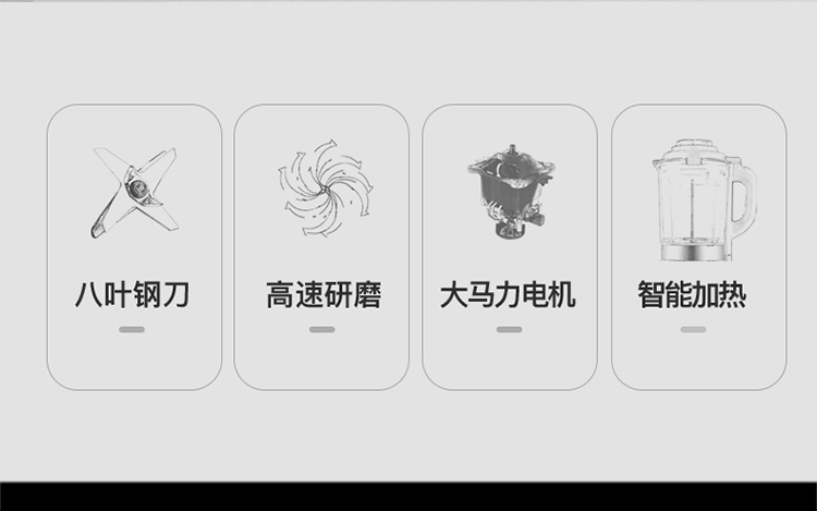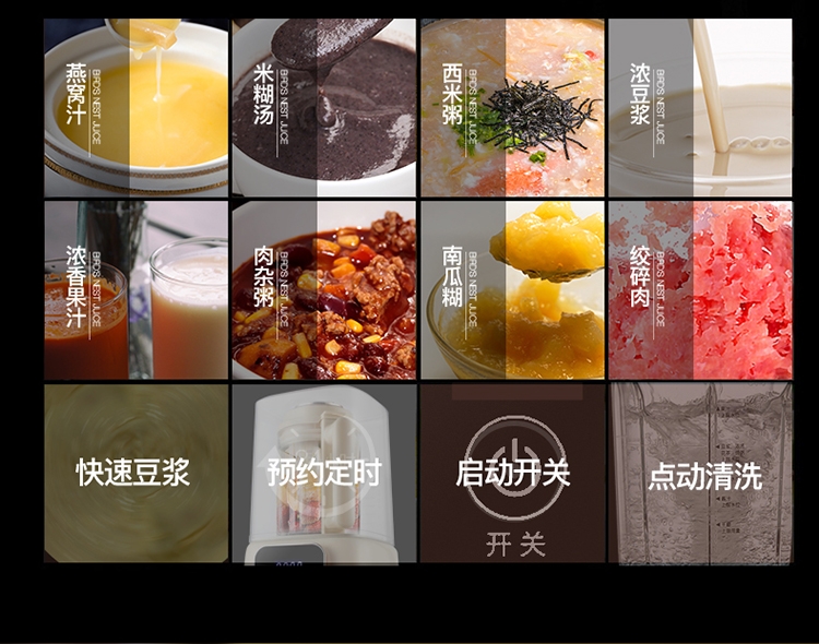 双层消音盖,有效降低跑气噪音;多功能面板,智能一健全自动;微电脑智能加热,360°环形加热底盘;久煮沸腾不糊底,食品接触不锈钢 高速打磨 细腻无渣