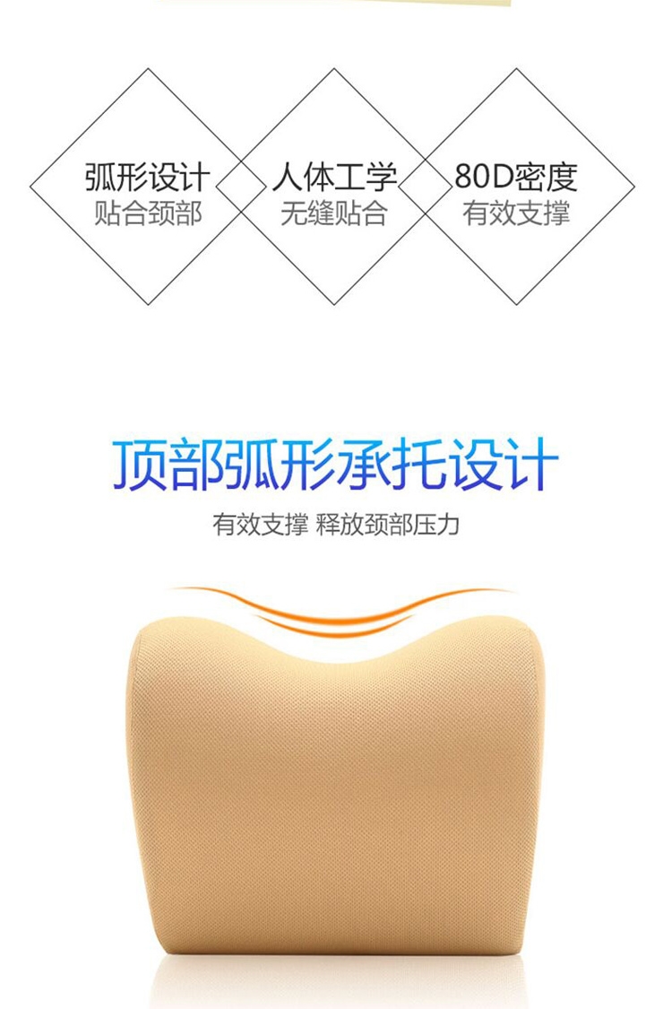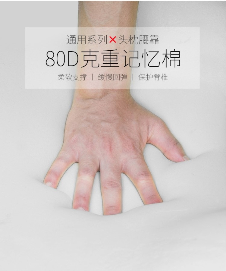 加大加宽颈枕,有效支撑,缓冲压力;80D克重记忆棉,柔软支撑,缓慢回弹;隐形拉链可拆洗,美观大气,清洗方便