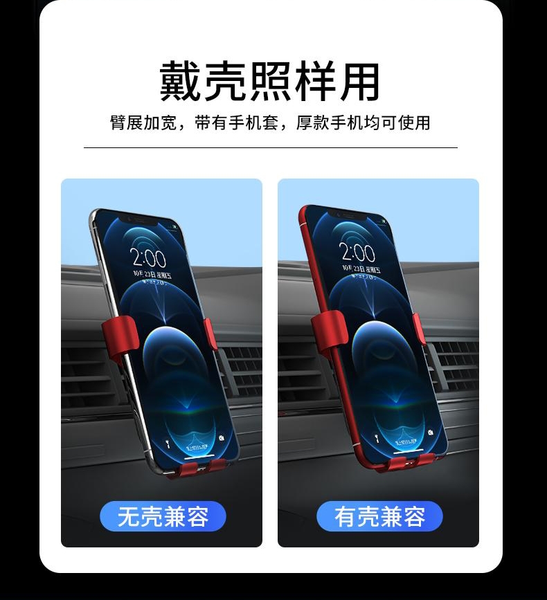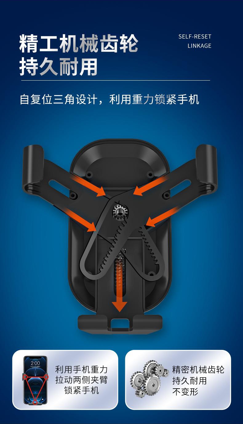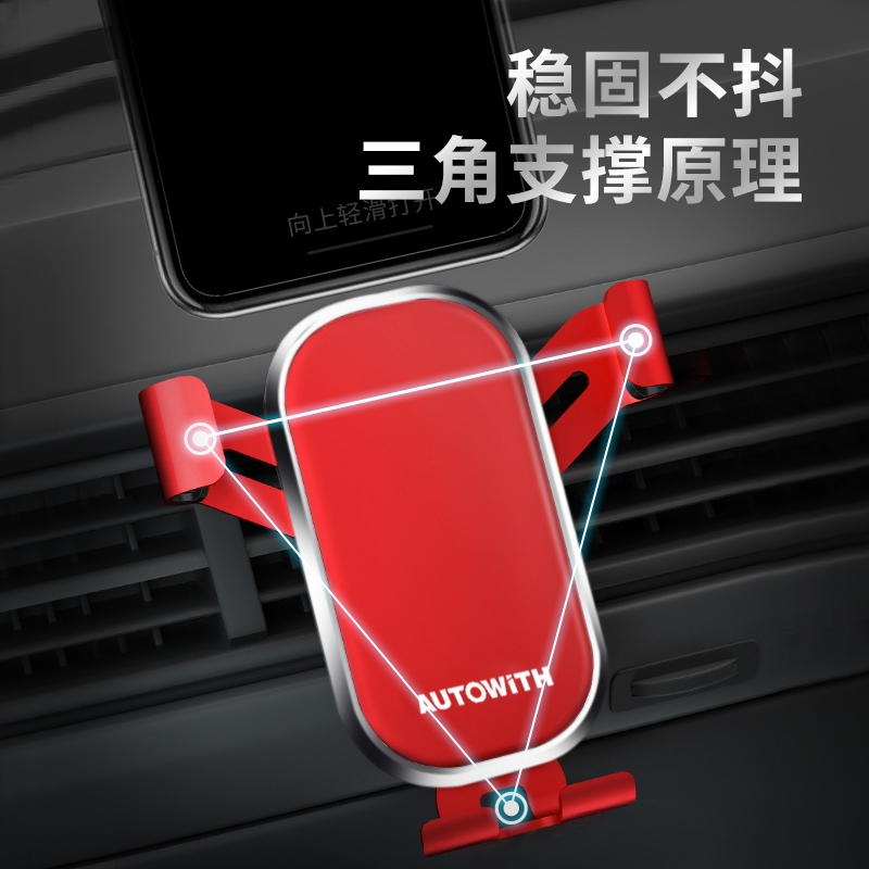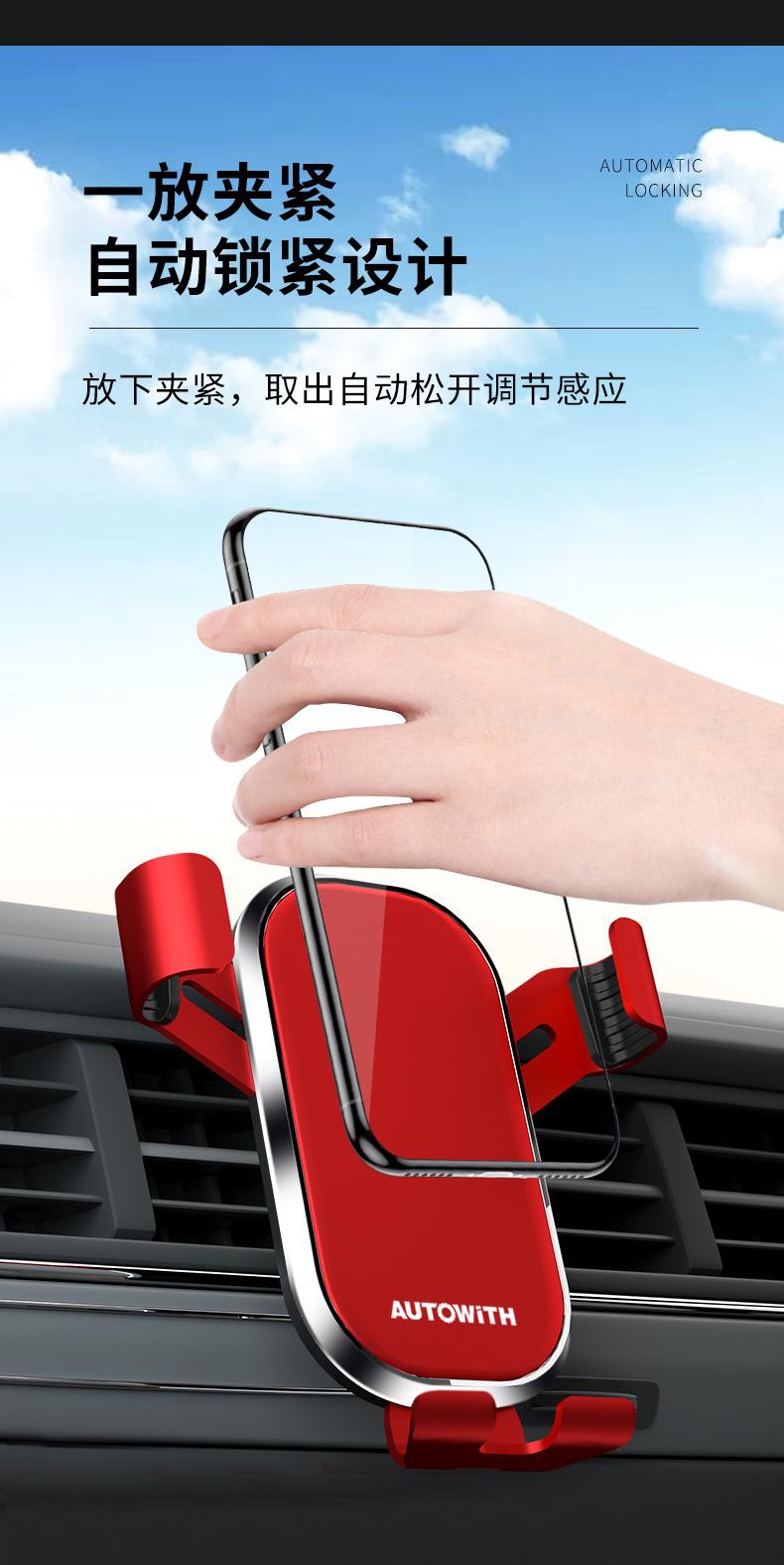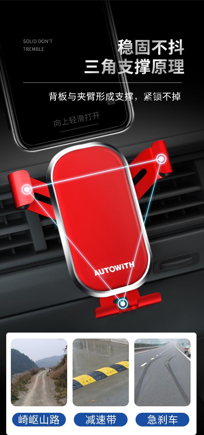 固定及承托角采用加厚 硅胶软垫,不伤手机;采用重力感应技术,手机放入即锁紧,拿开就松;配备旋钮式出风口固定卡扣,比常规出风口卡扣更加稳固