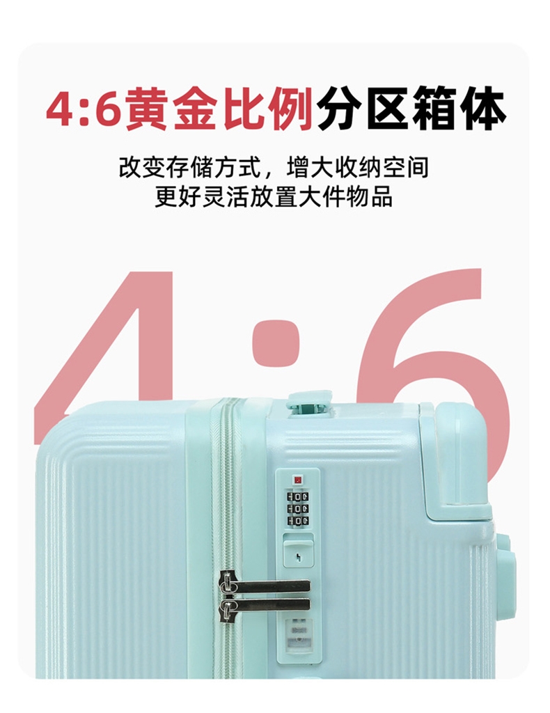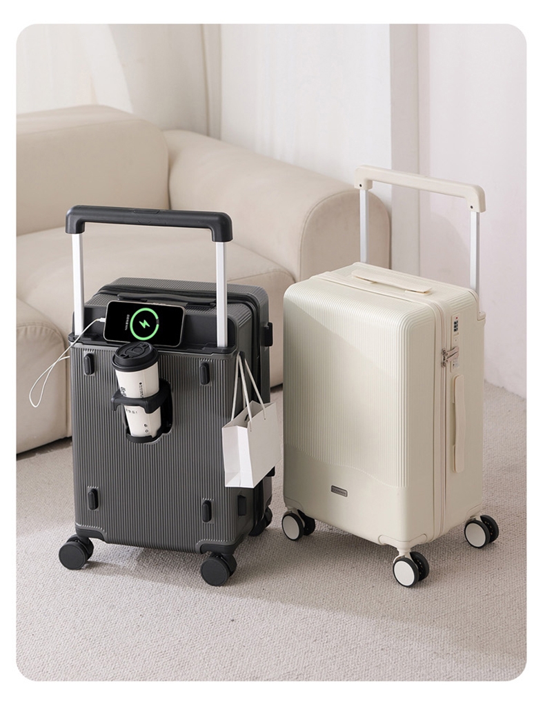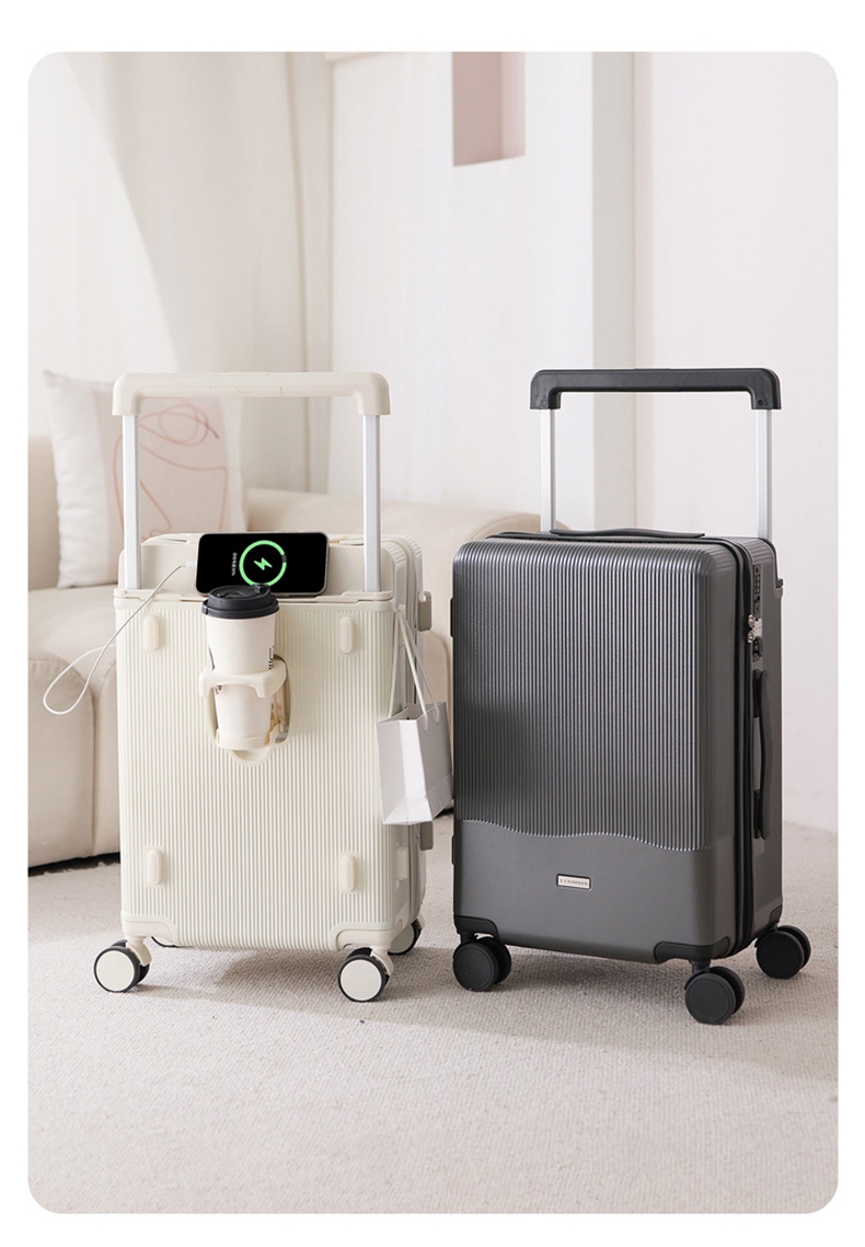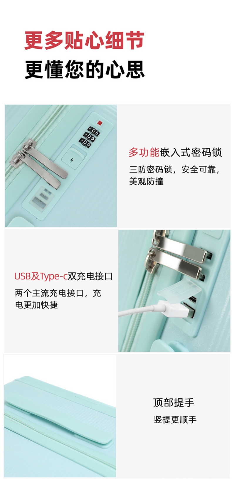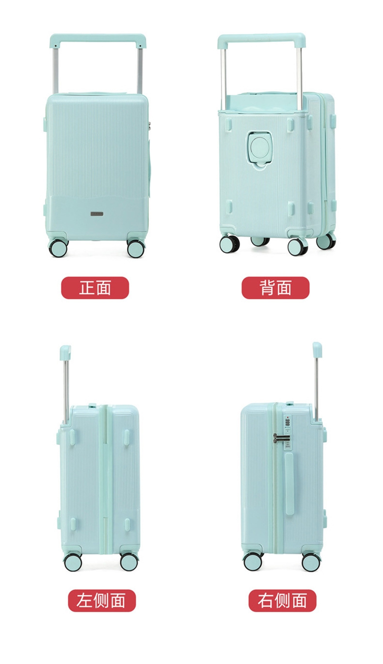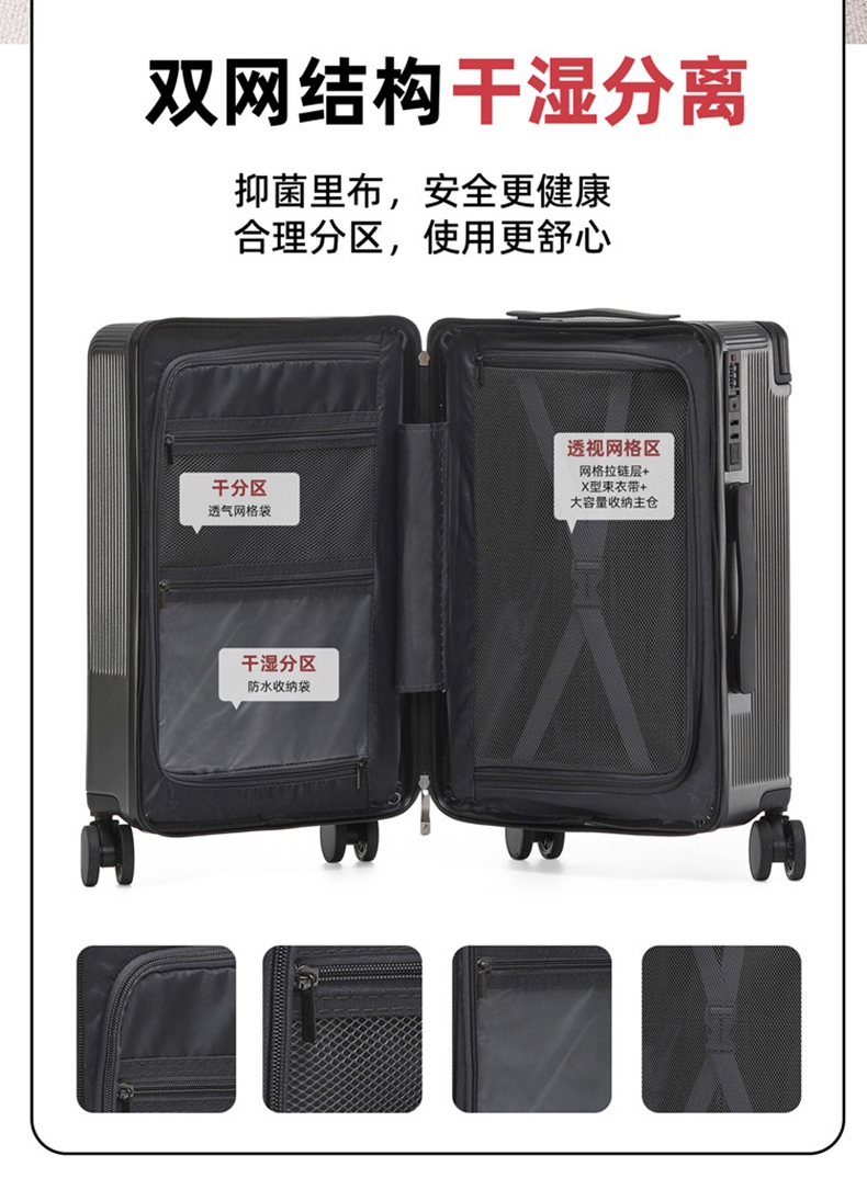带顶部和侧部提手,竖提横提都方便,带折叠隐形式杯架;底部带4个承重防磨顶脚,取放行李无惧剐蹭箱体;内里大双网结构,干湿分离,分区合理;带USB及Type-C充电口,同时配置移动电源内袋